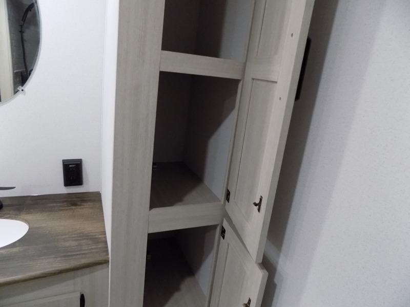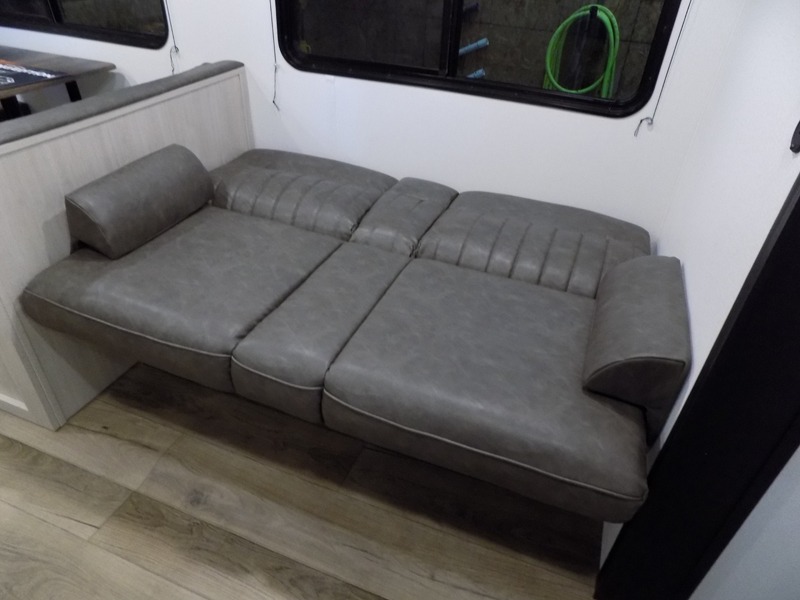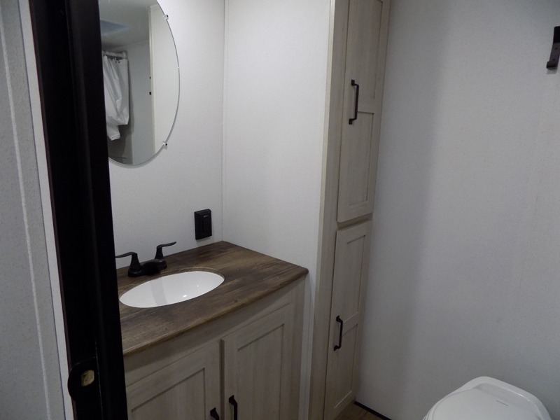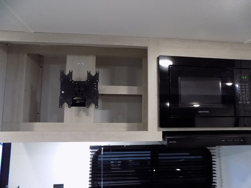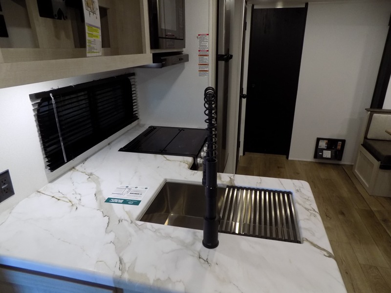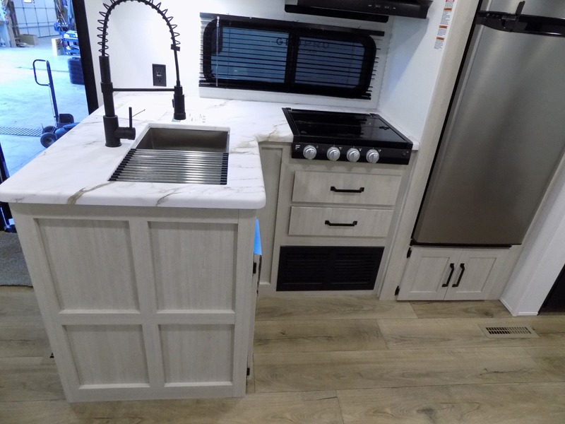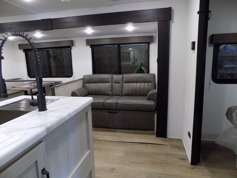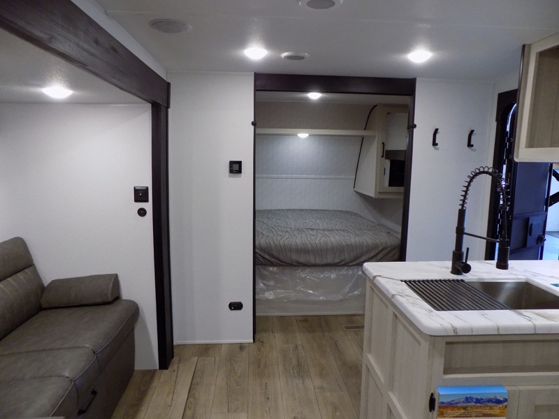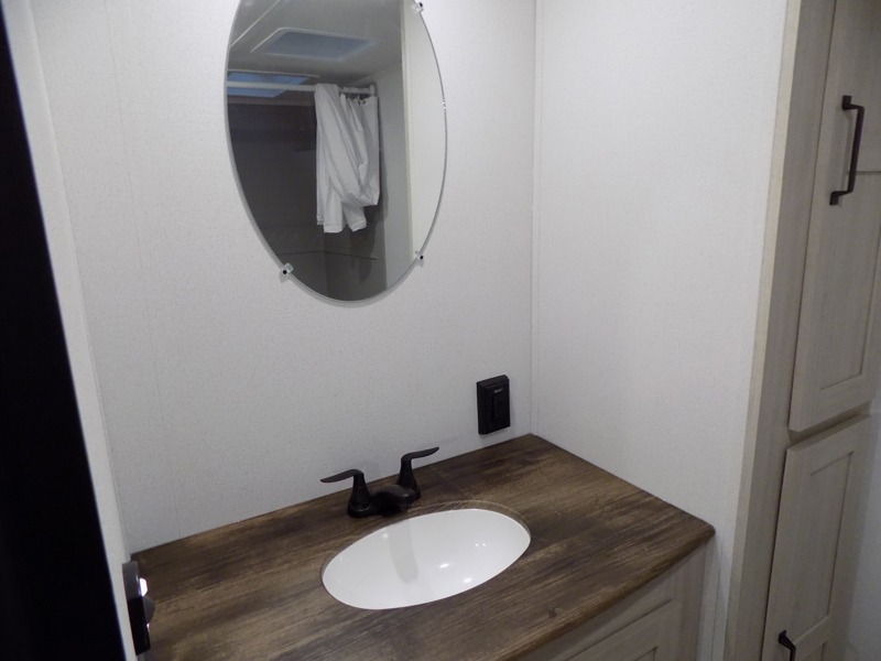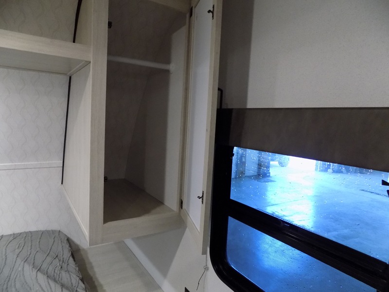 Wherever you decide to camp, you can be sure to have a great time in this rear bath travel trailer! The combined kitchen and living area is made spacious thanks to the large slide out. Here, you can relax on the sofa and dine at the booth dinette, and an optional TV can be added if you want the option for movie night. The full kitchen will allow you to make meals each day, and you can choose to add the optional outside mini kitchen with a grill if you want to cook with fresh air. This unit also includes a front private bedroom, complete with an RV queen bed, an overhead shelf and dual shirt closets to keep clothes wrinkle-free.