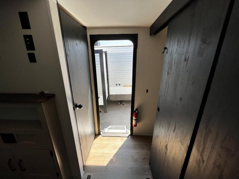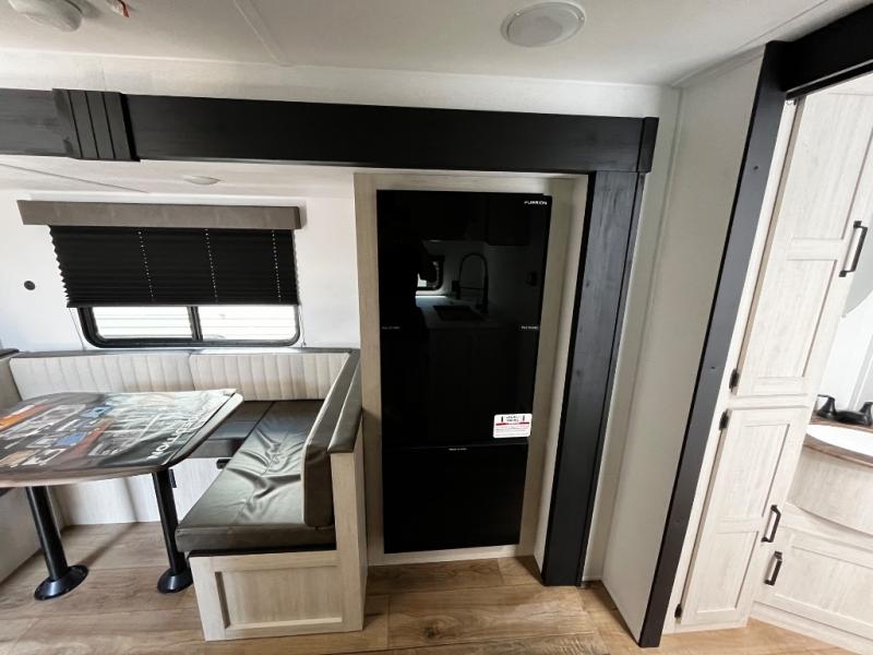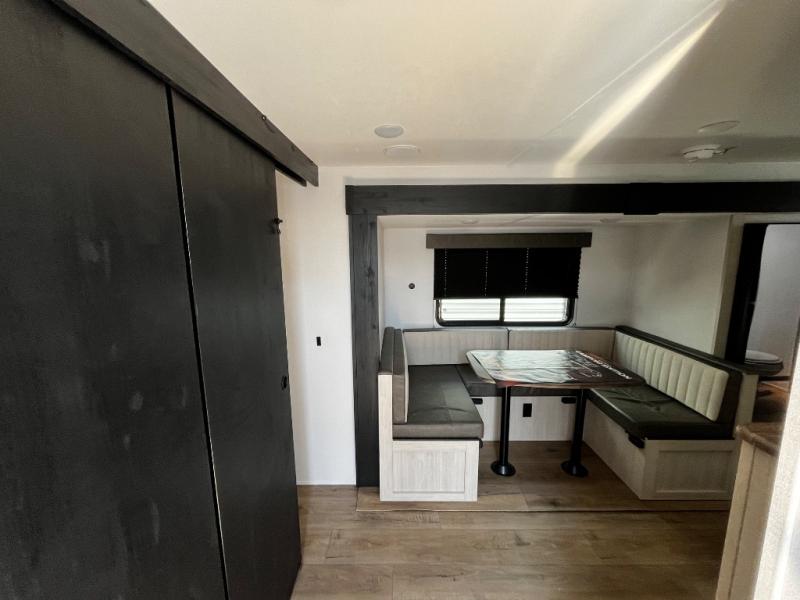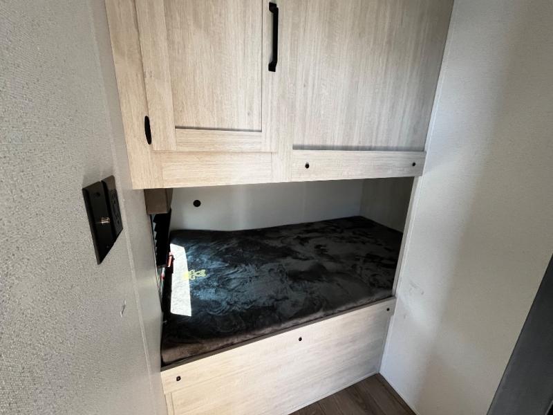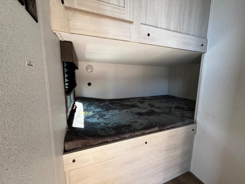 Your whole crew will love camping in this travel trailer since everyone can enjoy their own private space. The rear bunkhouses feature a private lower bunk room plus a private upper bunk room, each with their own door and a linen closet for storage space. The front master bedroom includes an RV queen bed, dual shirt closets, and easy access into the walk-thru bath. Head to the combined kitchen and living area to make dinner in the full kitchen, dine around the U-shaped dinette slide, and enjoy the fireplace! Outside, an optional mini kitchen with a griddle can be added if you choose, and you'll find outside storage compartments to keep all your gear secure!