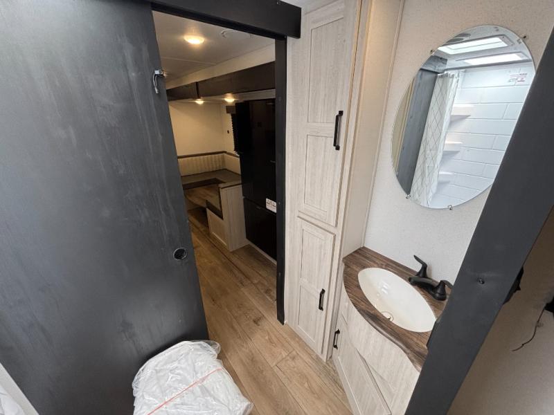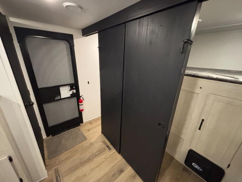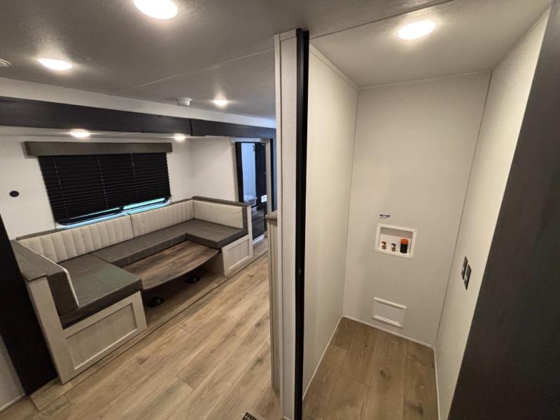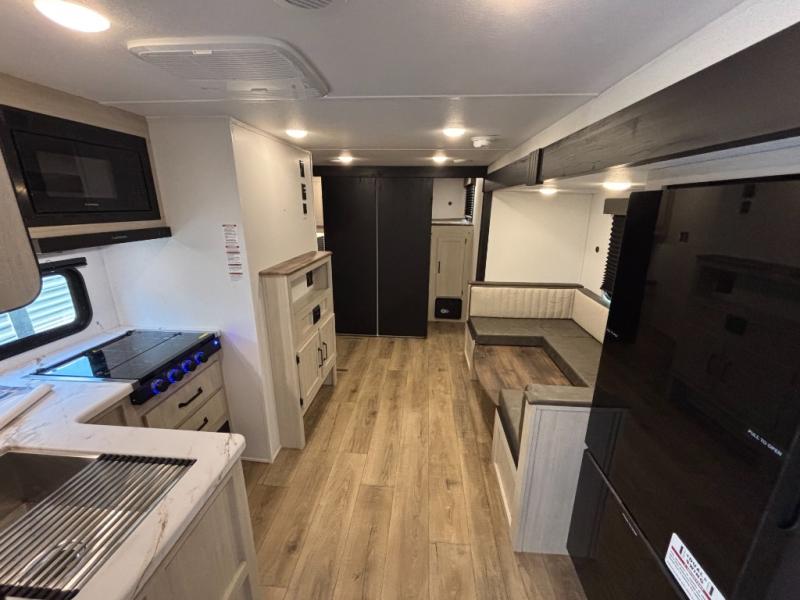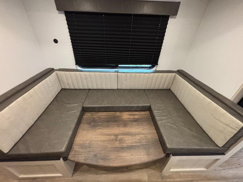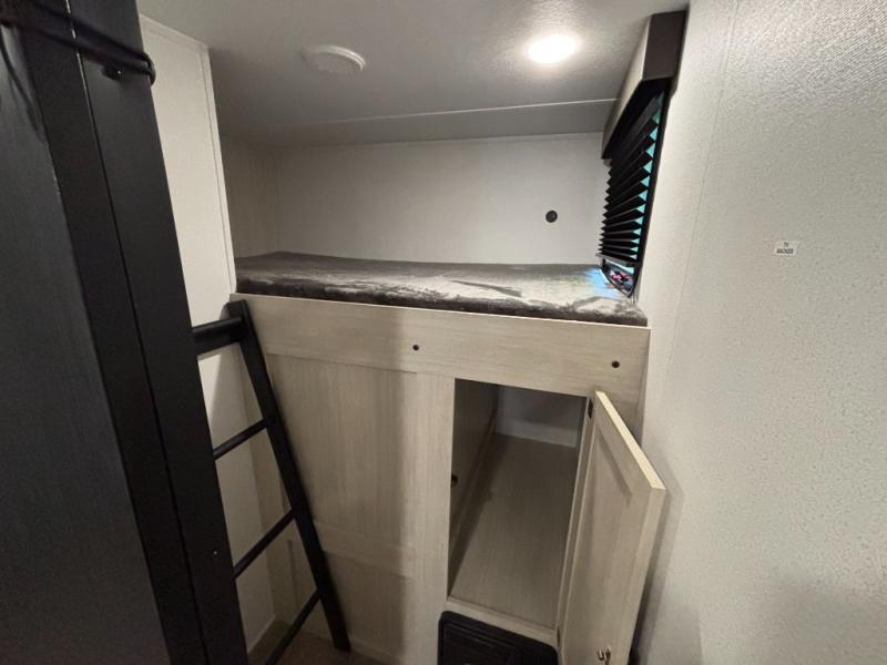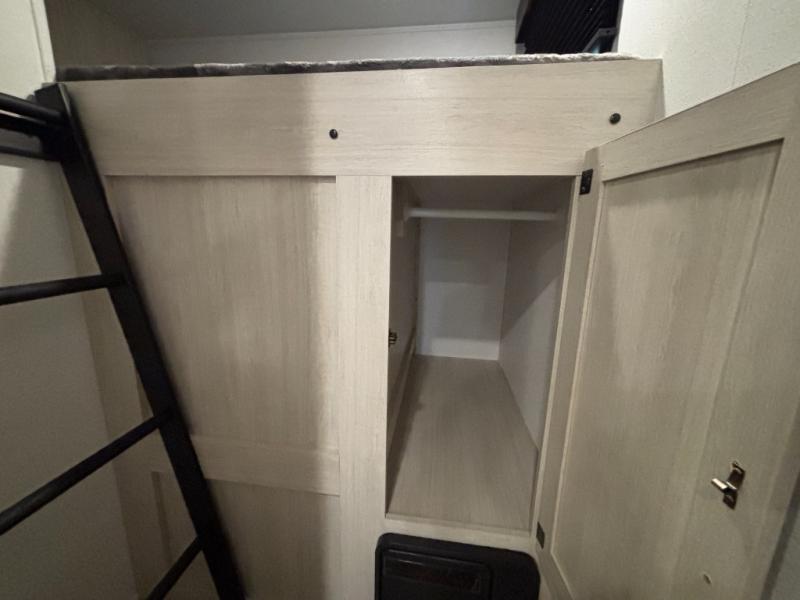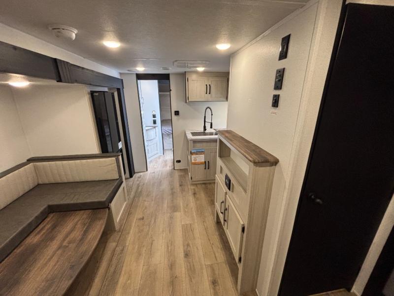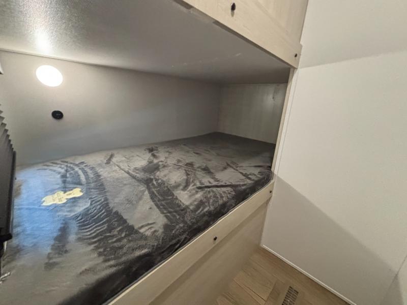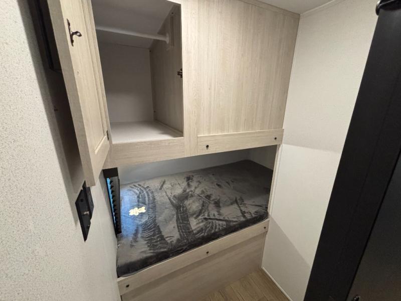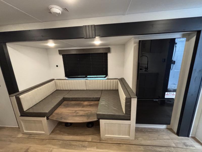 Your whole crew will love camping in this travel trailer since everyone can enjoy their own private space. The rear bunkhouses feature a private lower bunk room plus a private upper bunk room, each with their own door and a linen closet for storage space. The front master bedroom includes an RV queen bed, dual shirt closets, and easy access into the walk-thru bath. Head to the combined kitchen and living area to make dinner in the full kitchen, dine around the U-shaped dinette slide, and enjoy the fireplace! Outside, an optional micro kitchen with a grill can be added if you choose, and you'll find outside storage compartments to keep all your gear secure!