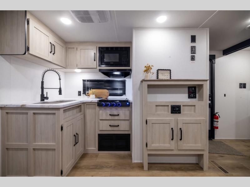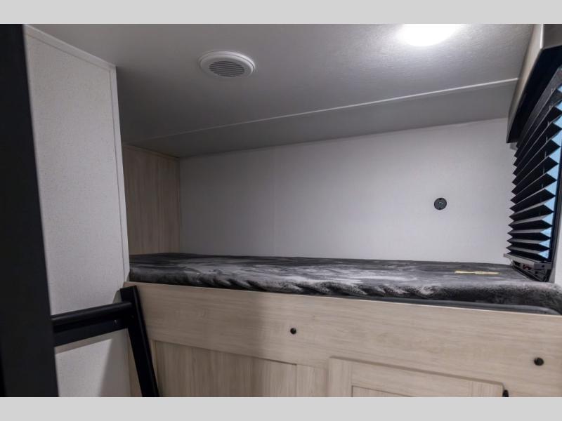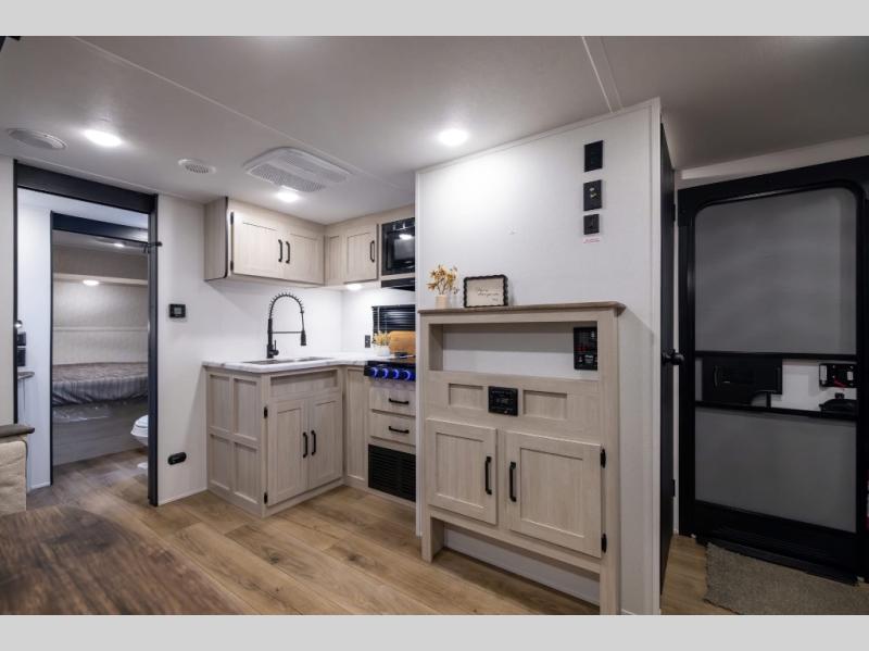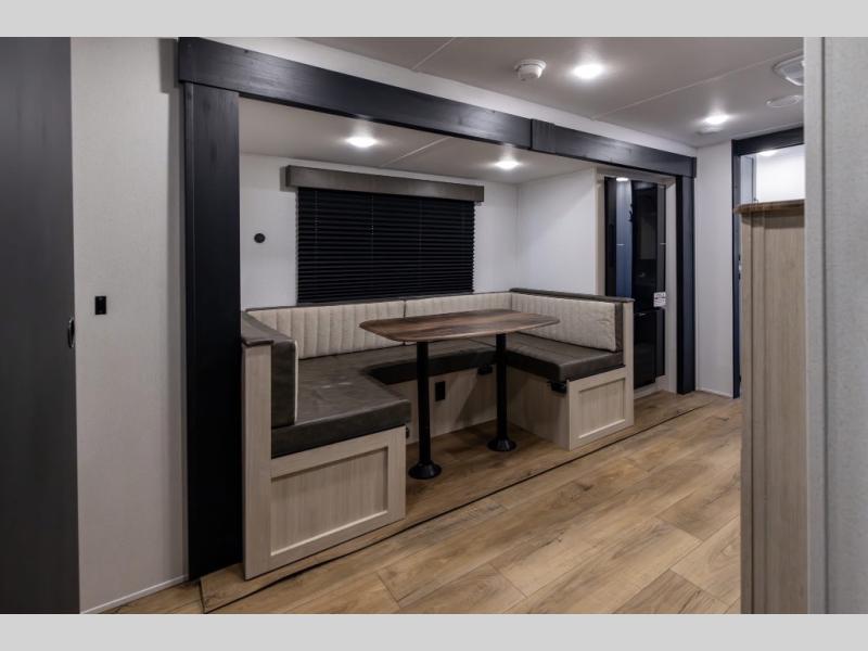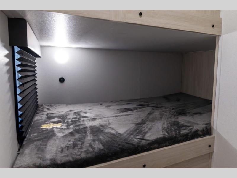 Your whole crew will love camping in this travel trailer since everyone can enjoy their own private space. The rear bunkhouses feature a private lower bunk room plus a private upper bunk room, each with their own door and a linen closet for storage space. The front master bedroom includes an RV queen bed, dual shirt closets, and easy access into the walk-thru bath. Head to the combined kitchen and living area to make dinner in the full kitchen, dine around the U-shaped dinette slide, and enjoy the fireplace! Outside, an optional mini kitchen with a griddle can be added if you choose, and you'll find outside storage compartments to keep all your gear secure!