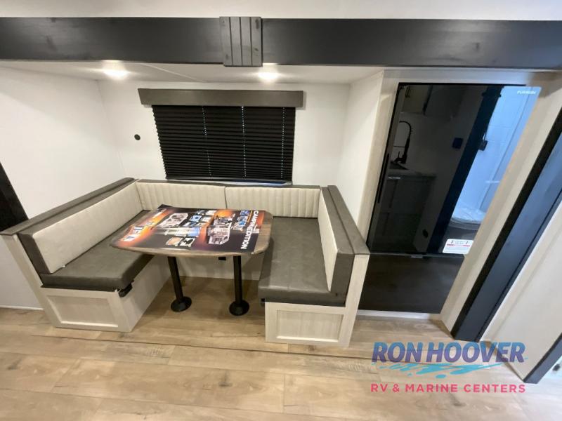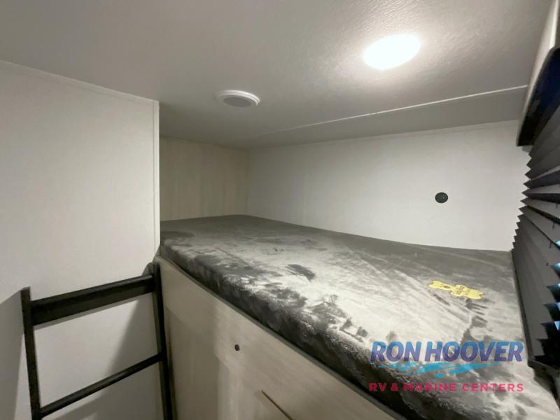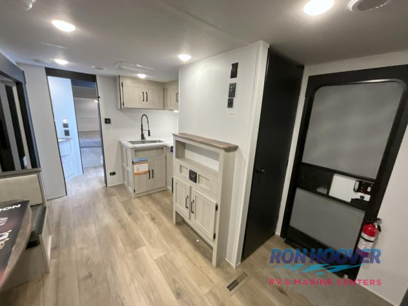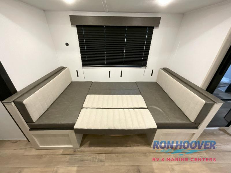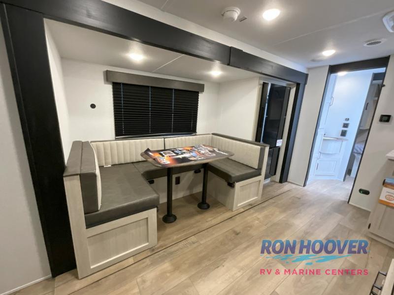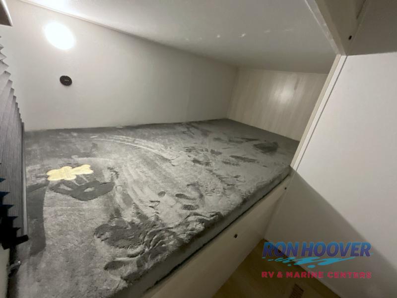 Your whole crew will love camping in this travel trailer since everyone can enjoy their own private space. The rear bunkhouses feature a private lower bunk room plus a private upper bunk room, each with their own door and a linen closet for storage space. The front master bedroom includes an RV queen bed, dual shirt closets, and easy access into the walk-thru bath. Head to the combined kitchen and living area to make dinner in the full kitchen, dine around the U-shaped dinette slide, and enjoy the fireplace! Outside, an optional mini kitchen with a griddle can be added if you choose, and you'll find outside storage compartments to keep all your gear secure!