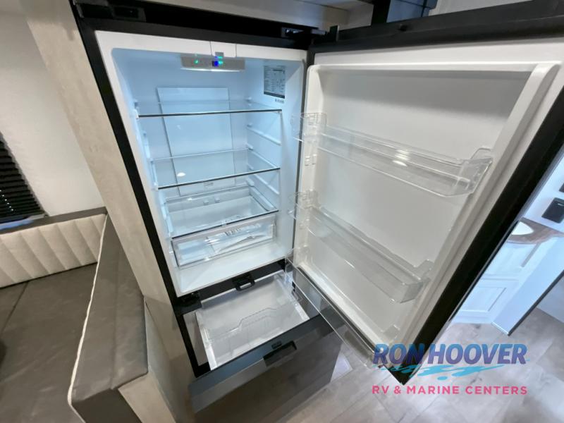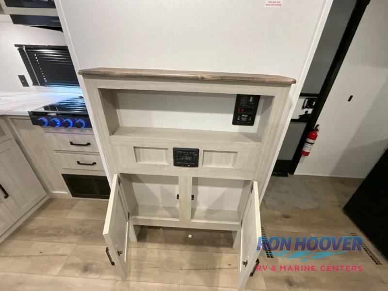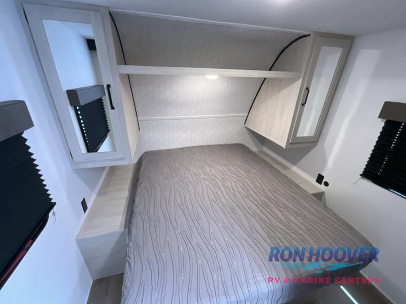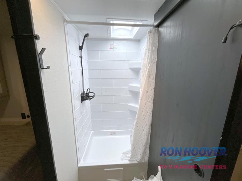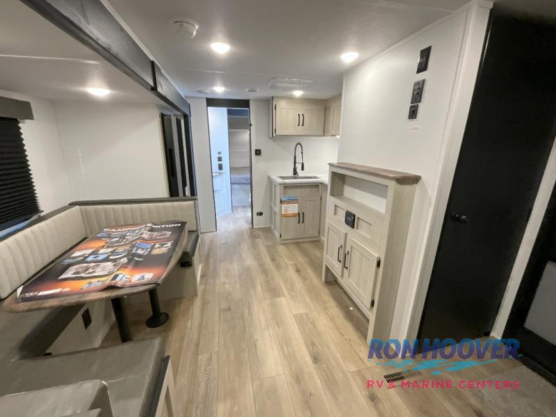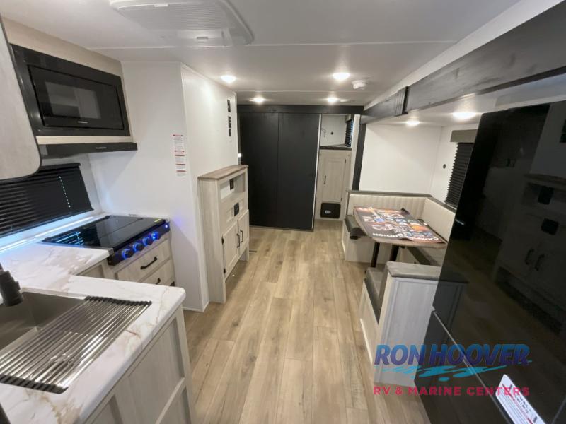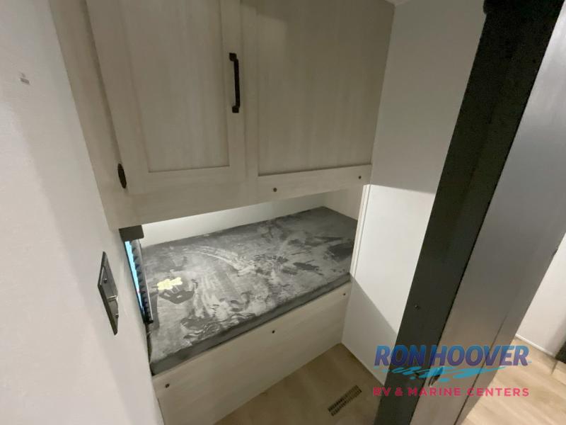 Your whole crew will love camping in this travel trailer since everyone can enjoy their own private space. The rear bunkhouses feature a private lower bunk room plus a private upper bunk room, each with their own door and a linen closet for storage space. The front master bedroom includes an RV queen bed, dual shirt closets, and easy access into the walk-thru bath. Head to the combined kitchen and living area to make dinner in the full kitchen, dine around the U-shaped dinette slide, and enjoy the fireplace! Outside, an optional mini kitchen with a griddle can be added if you choose, and you'll find outside storage compartments to keep all your gear secure!