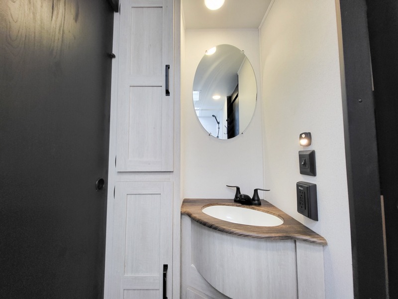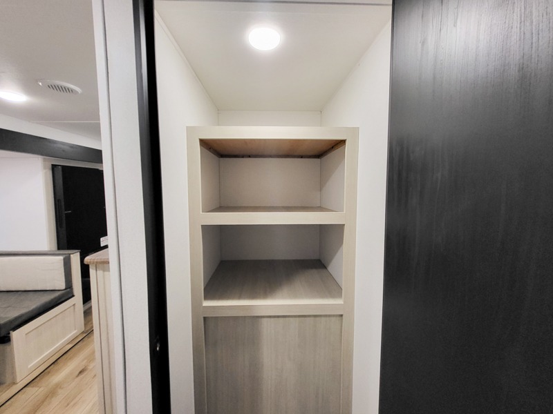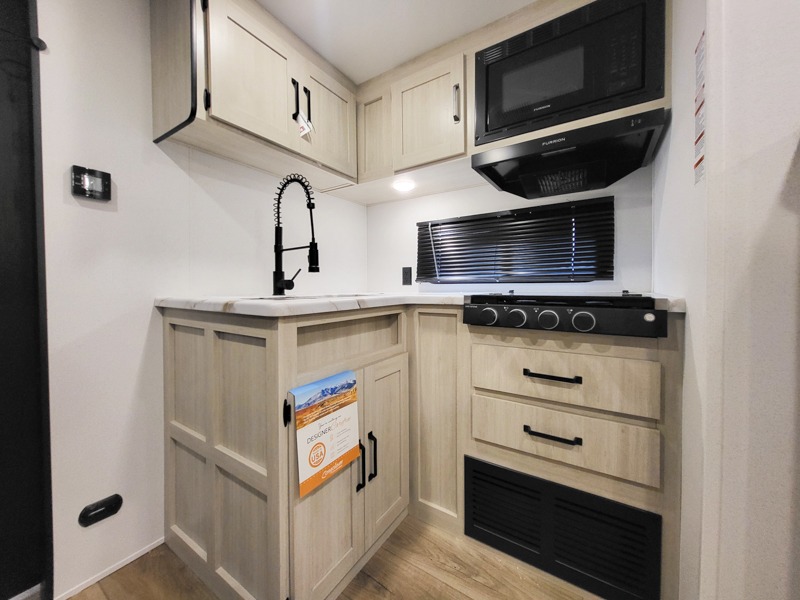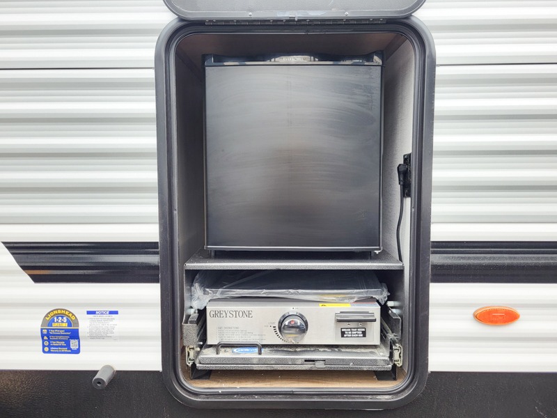 Your whole crew will love camping in this travel trailer since everyone can enjoy their own private space. The rear bunkhouses feature a private lower bunk room plus a private upper bunk room, each with their own door and a linen closet for storage space. The front master bedroom includes an RV queen bed, dual shirt closets, and easy access into the walk-thru bath. Head to the combined kitchen and living area to make dinner in the full kitchen, dine around the U-shaped dinette slide, and enjoy the fireplace! Outside, an optional mini kitchen with a griddle can be added if you choose, and you'll find outside storage compartments to keep all your gear secure!