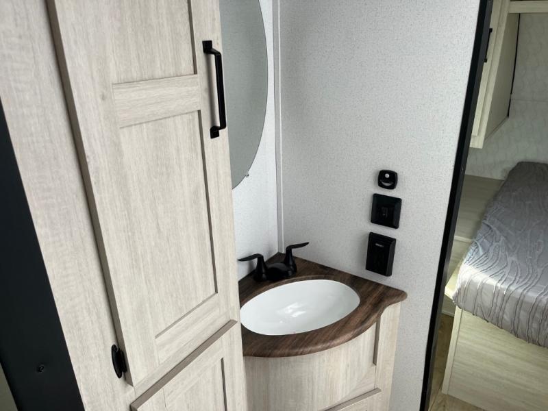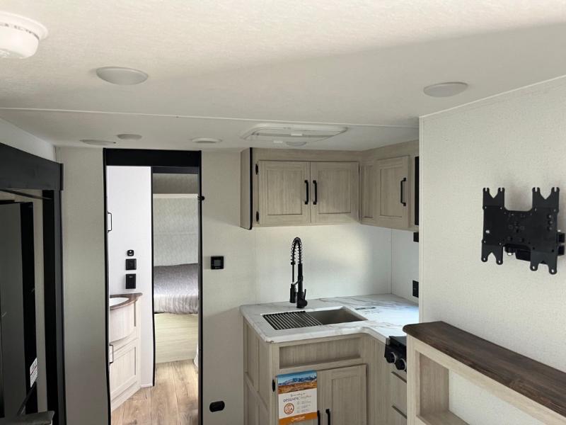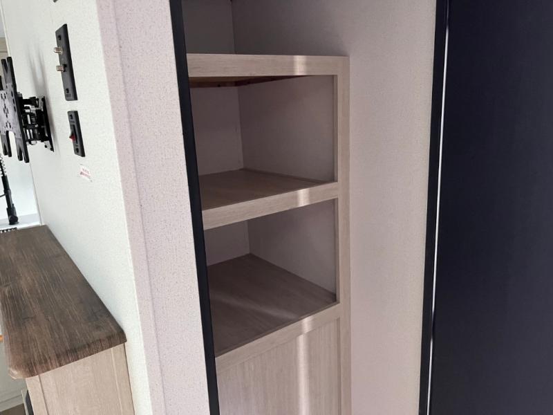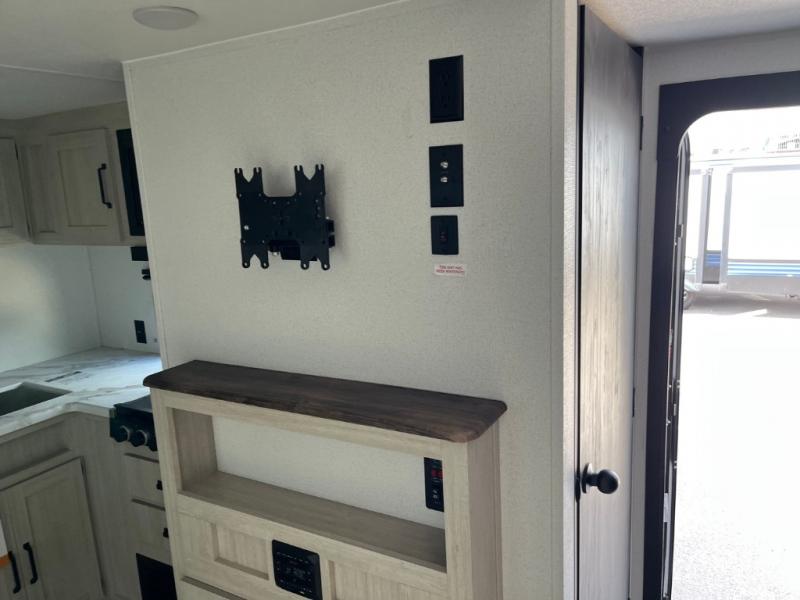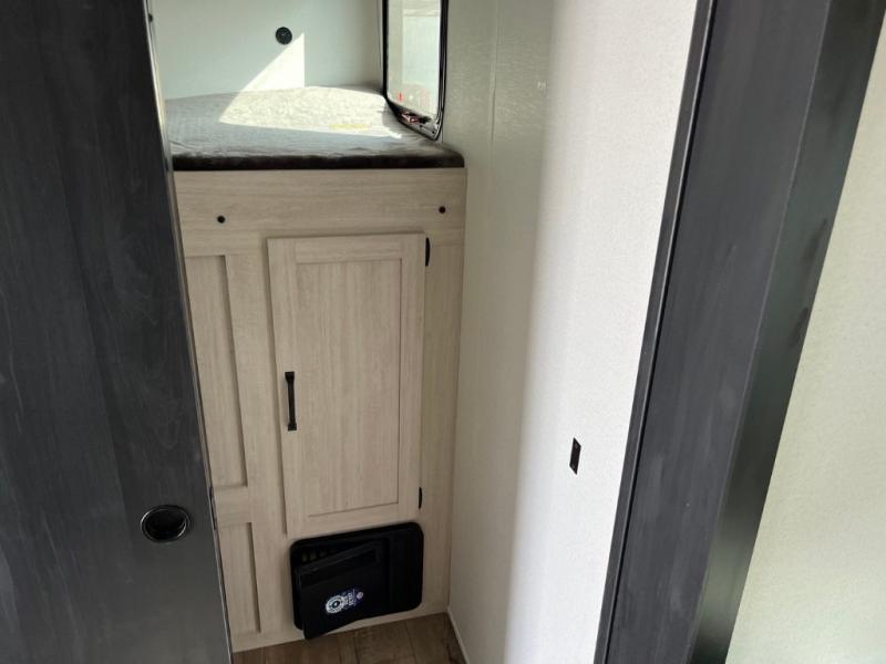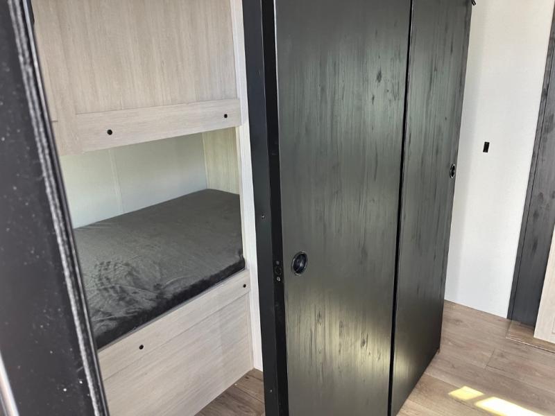 Your whole crew will love camping in this travel trailer since everyone can enjoy their own private space. The rear bunkhouses feature a private lower bunk room plus a private upper bunk room, each with their own door and a linen closet for storage space. The front master bedroom includes an RV queen bed, dual shirt closets, and easy access into the walk-thru bath. Head to the combined kitchen and living area to make dinner in the full kitchen, dine around the U-shaped dinette slide, and enjoy the fireplace! Outside, an optional mini kitchen with a griddle can be added if you choose, and you'll find outside storage compartments to keep all your gear secure!