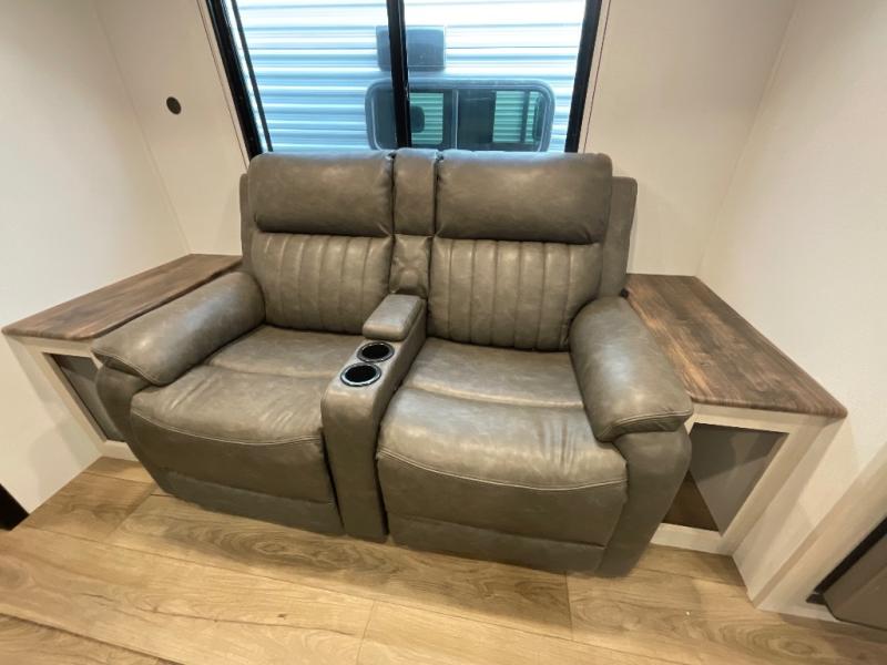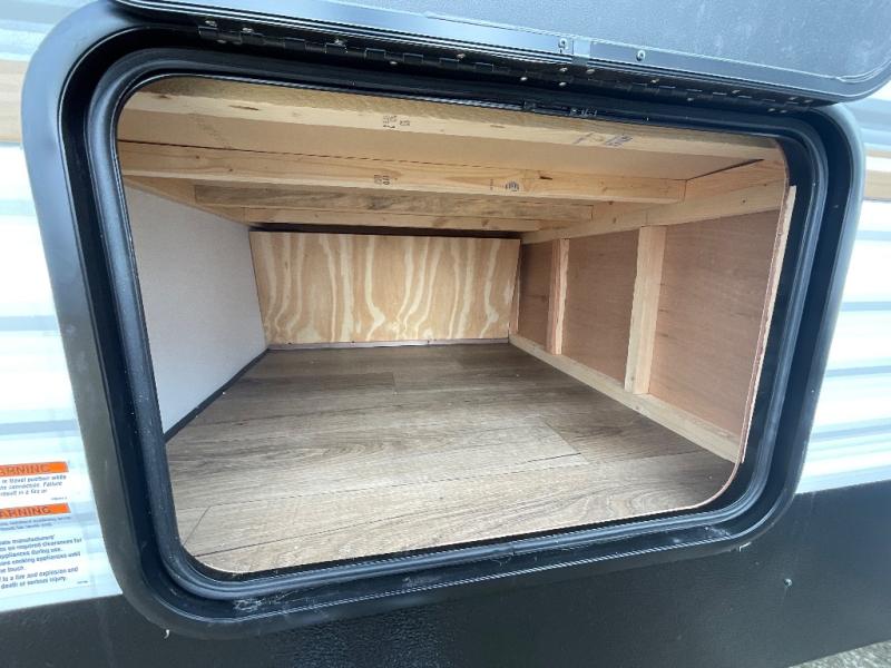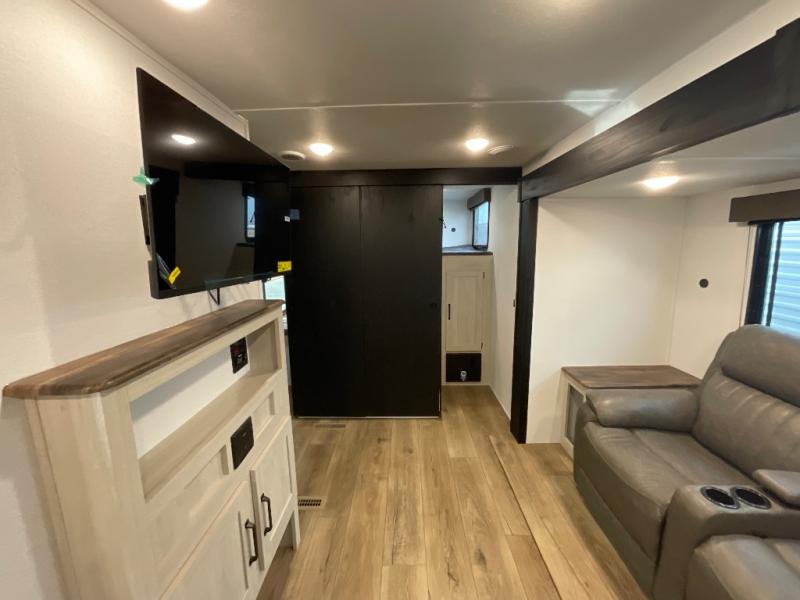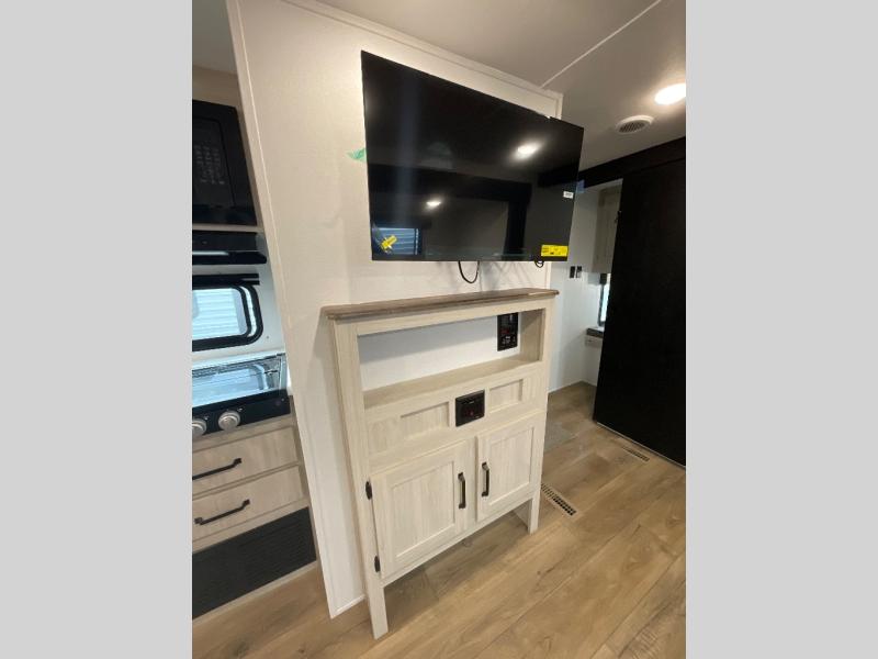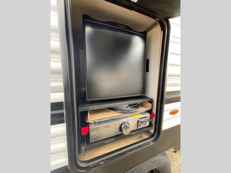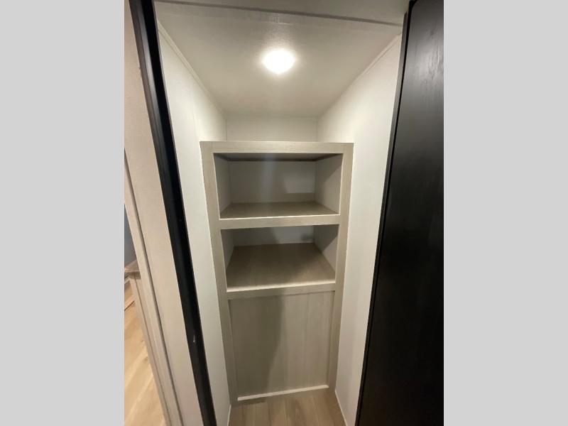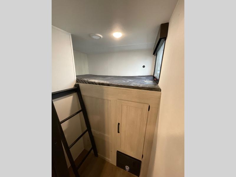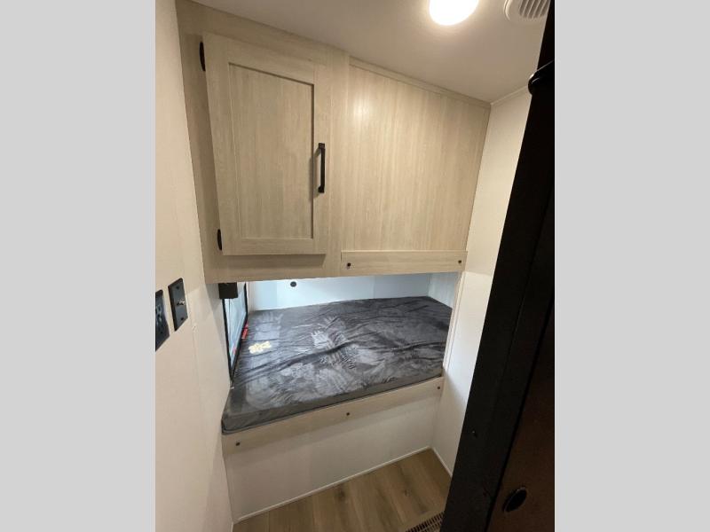 Your whole crew will love camping in this travel trailer since everyone can enjoy their own private space. The rear bunkhouses feature a private lower bunk room plus a private upper bunk room, each with their own door and a linen closet for storage space. The front master bedroom includes an RV queen bed, dual shirt closets, and easy access into the walk-thru bath. Head to the combined kitchen and living area to make dinner in the full kitchen, dine around the U-shaped dinette slide, and enjoy the fireplace! Outside, an optional micro kitchen with a grill can be added if you choose, and you'll find outside storage compartments to keep all your gear secure!