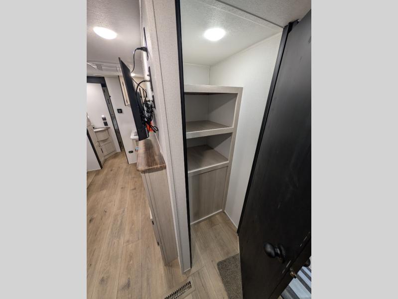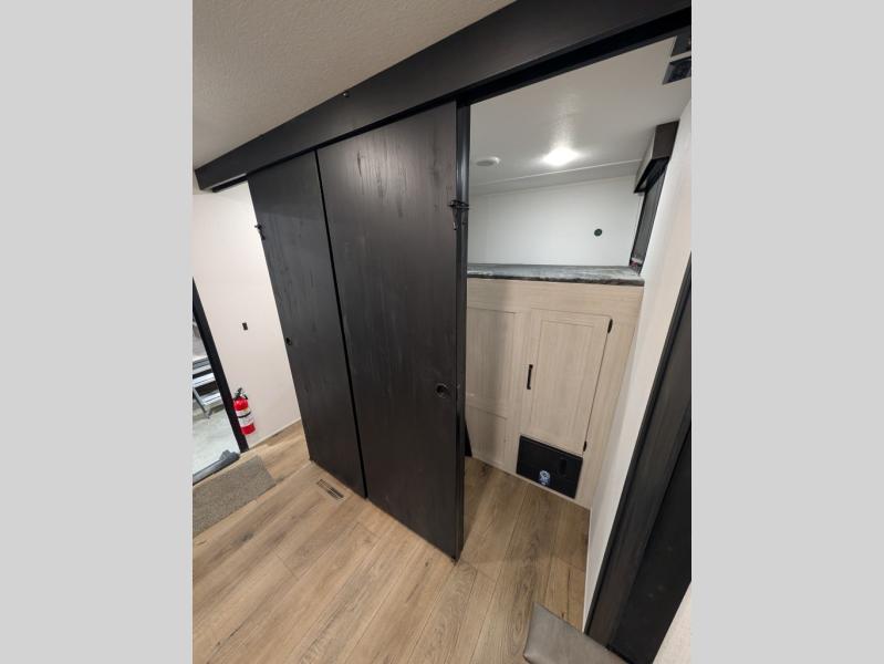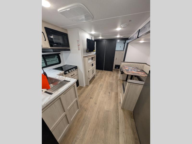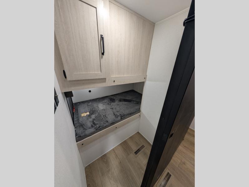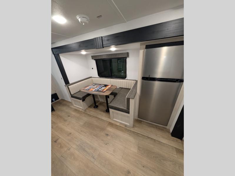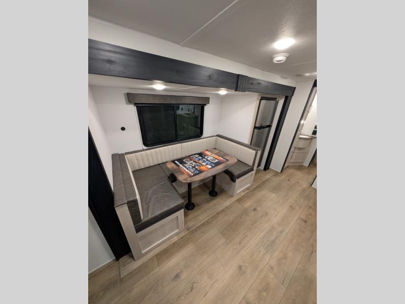 Your whole crew will love camping in this travel trailer since everyone can enjoy their own private space. The rear bunkhouses feature a private lower bunk room plus a private upper bunk room, each with their own door and a linen closet for storage space. The front master bedroom includes an RV queen bed, dual shirt closets, and easy access into the walk-thru bath. Head to the combined kitchen and living area to make dinner in the full kitchen, dine around the U-shaped dinette slide, and enjoy the fireplace! Outside, an optional micro kitchen with a grill can be added if you choose, and you'll find outside storage compartments to keep all your gear secure!