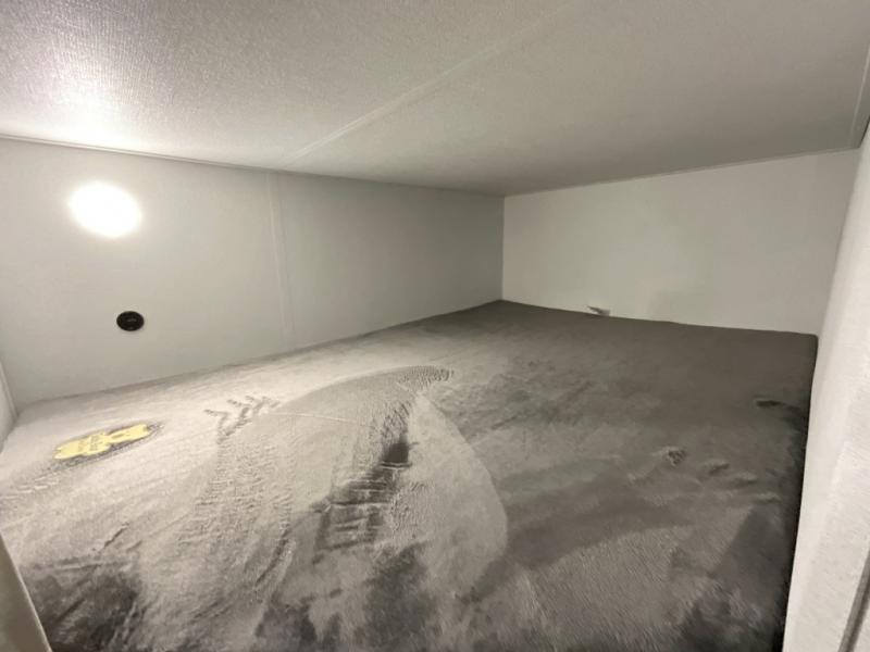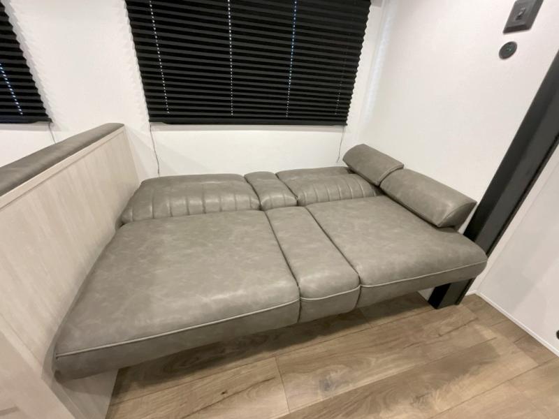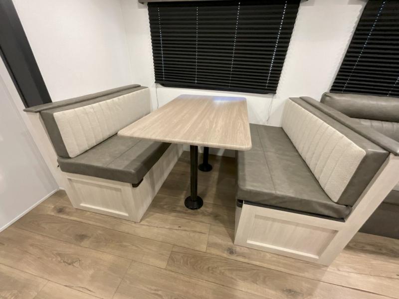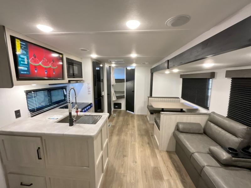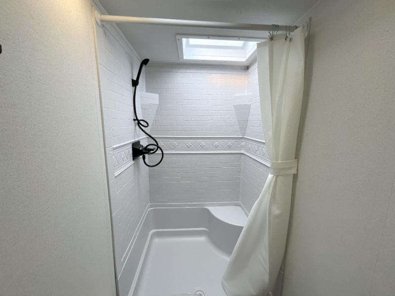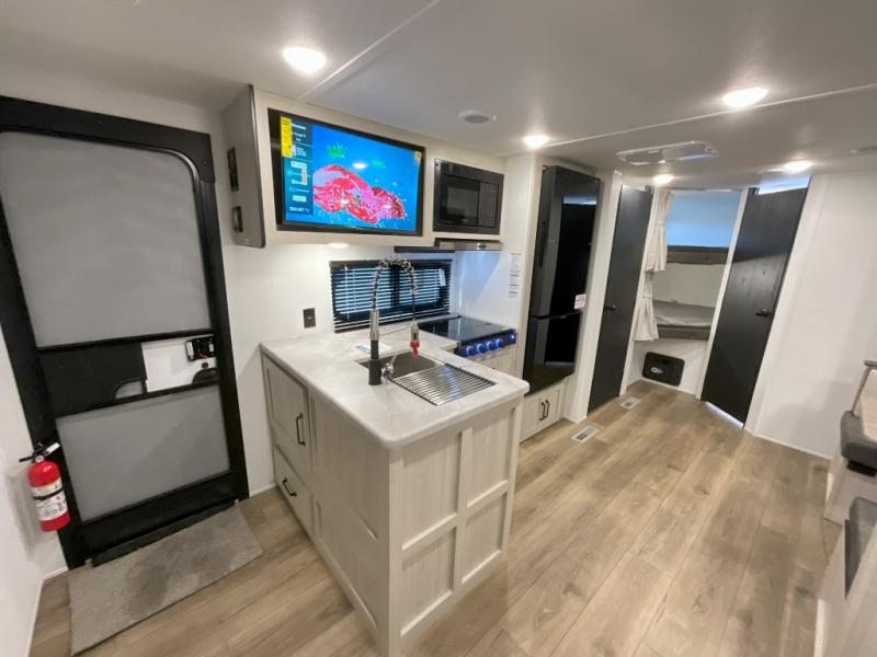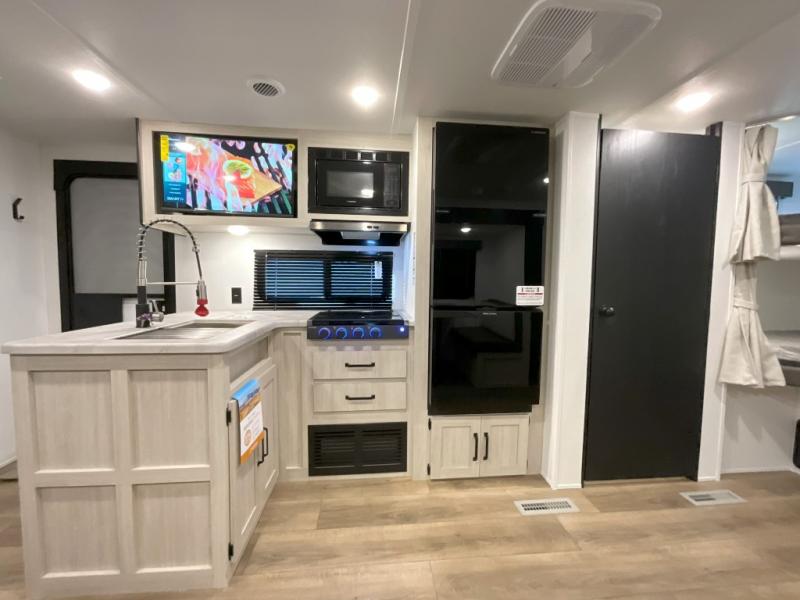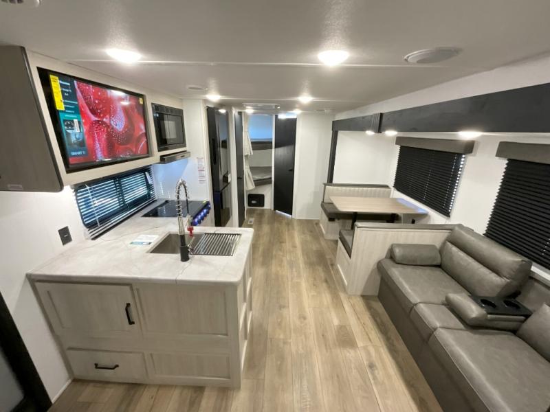 If you're looking for more space, this double axle unit features a large slide so you can walk about freely. Here, you'll find the booth dinette and sofa, which sit across from the optional TV if you want to enjoy movie nights. The full kitchen includes a microwave and three burner cooktop to make meals, plus a pantry and 12V refrigerator for food storage. There is even washer and dryer prep in the pantry if you choose to add these appliances. An optional outside mini kitchen can be added if you enjoy cooking outdoors! The kids or your guests will love the double-size bunks, and the full bath right beside the bunks includes a shower a seat for added comfort.