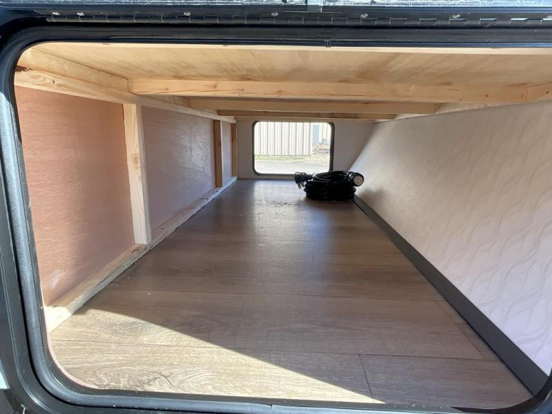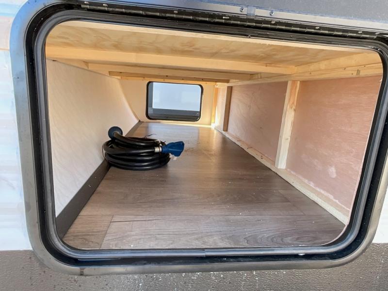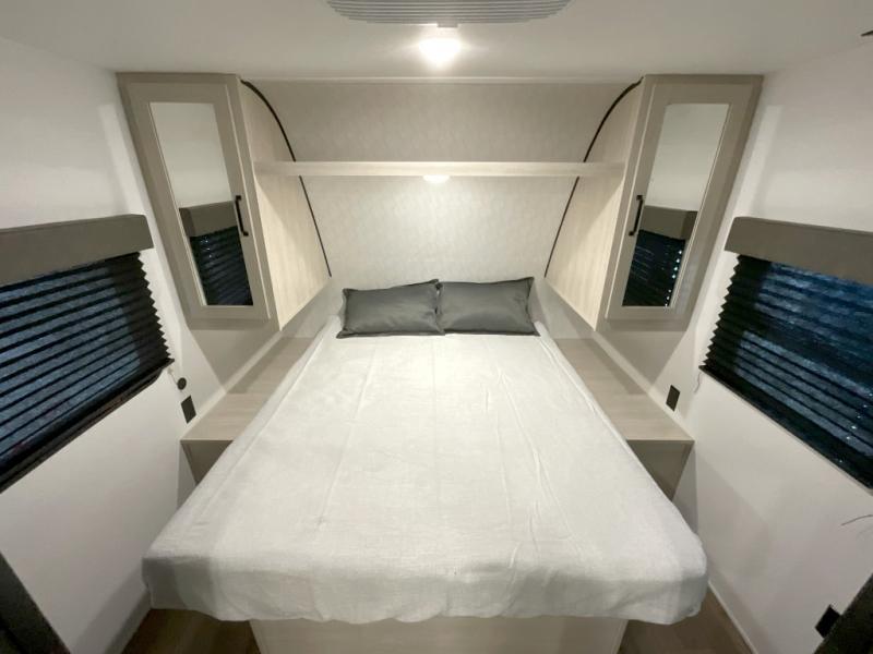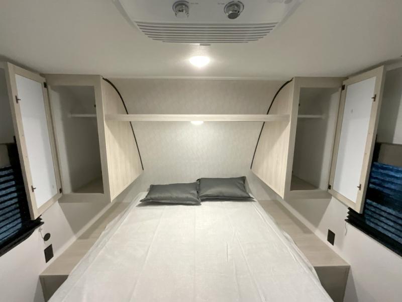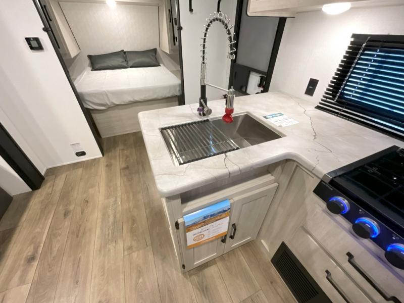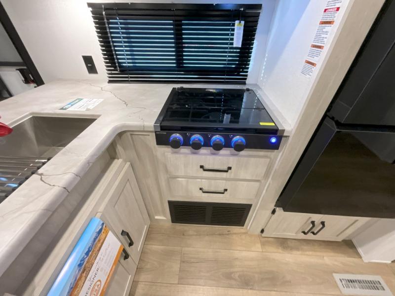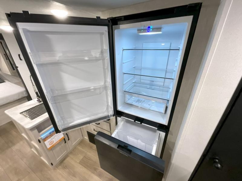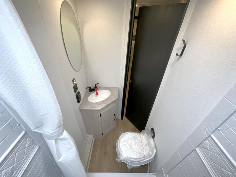 If you're looking for more space, this double axle unit features a large slide so you can walk about freely. Here, you'll find the booth dinette and sofa, which sit across from the optional TV if you want to enjoy movie nights. The full kitchen includes a microwave and three burner cooktop to make meals, plus a pantry and 12V refrigerator for food storage. There is even washer and dryer prep in the pantry if you choose to add these appliances. An optional outside mini kitchen can be added if you enjoy cooking outdoors! The kids or your guests will love the double-size bunks, and the full bath right beside the bunks includes a shower a seat for added comfort.