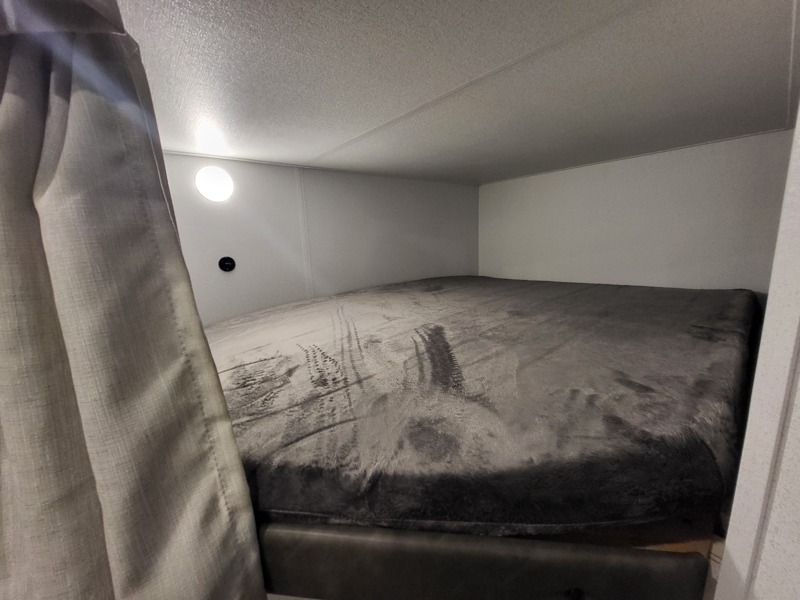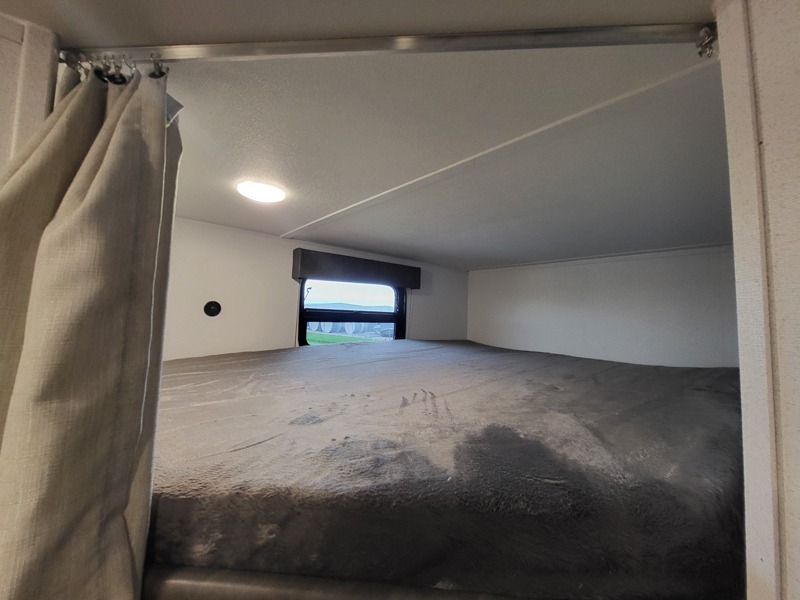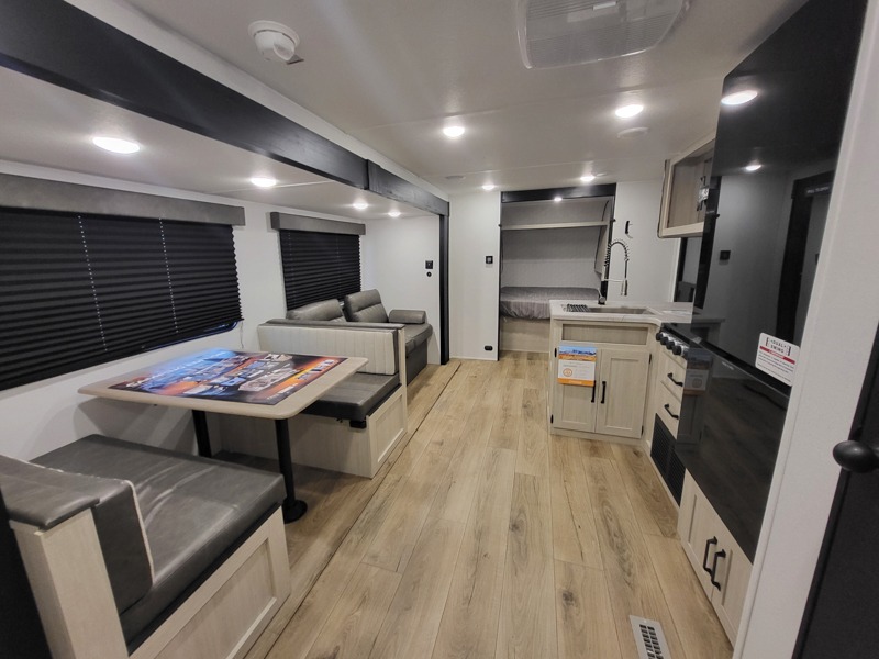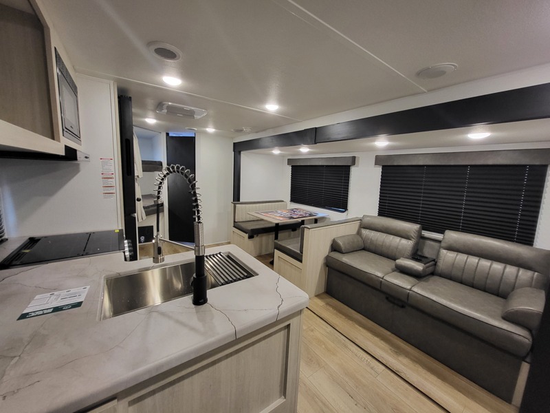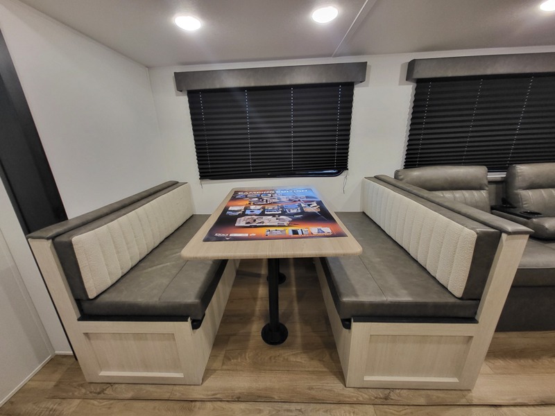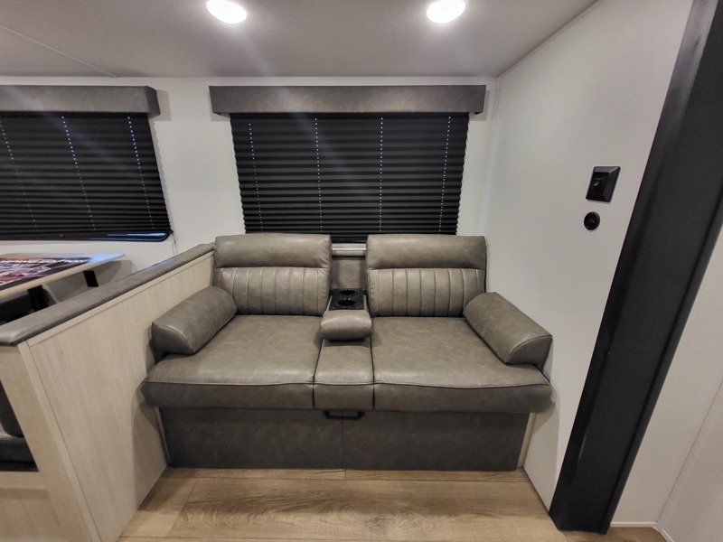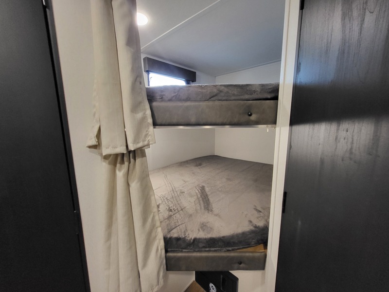 If you're looking for more space, this double axle unit features a large slide so you can walk about freely. Here, you'll find the booth dinette and sofa, which sit across from the optional TV if you want to enjoy movie nights. The full kitchen includes a stainless microwave and three burner cooktop to make meals, plus a pantry and 12V refrigerator for food storage. And an optional outside kitchen with a griddle can be added if you enjoy cooking outdoors! The kids or your guests will love the double-size bunks, and the full bath right beside the bunks includes a shower a seat for added comfort.