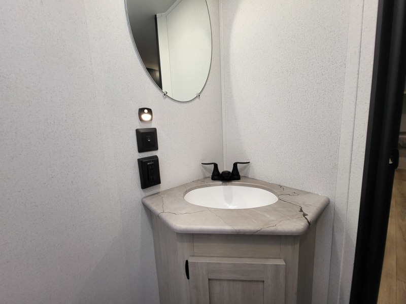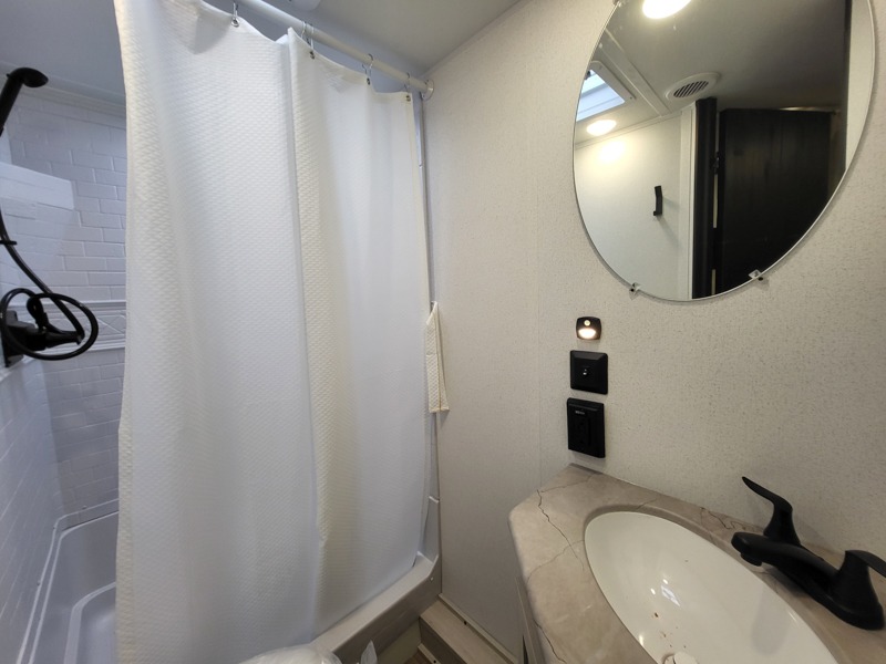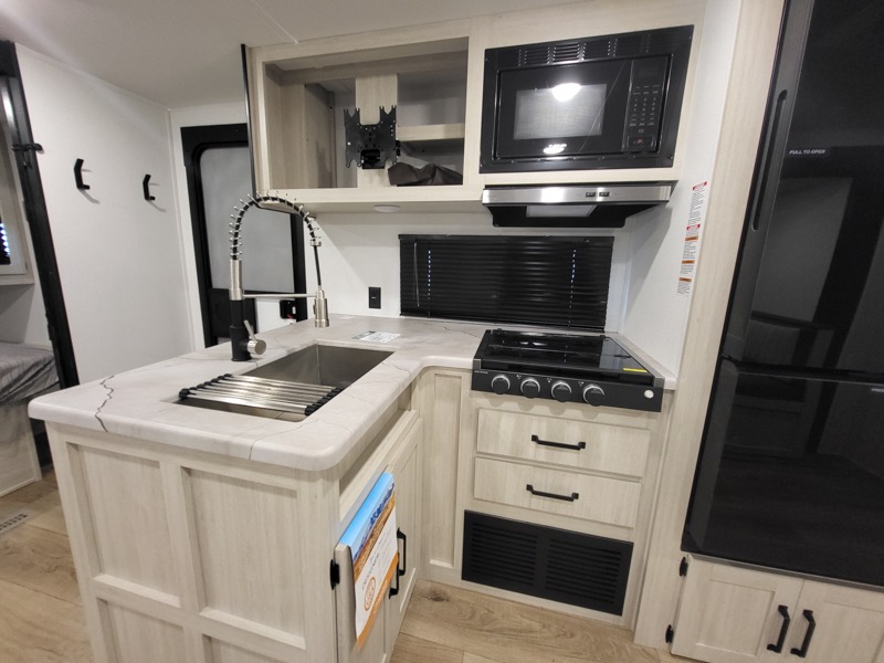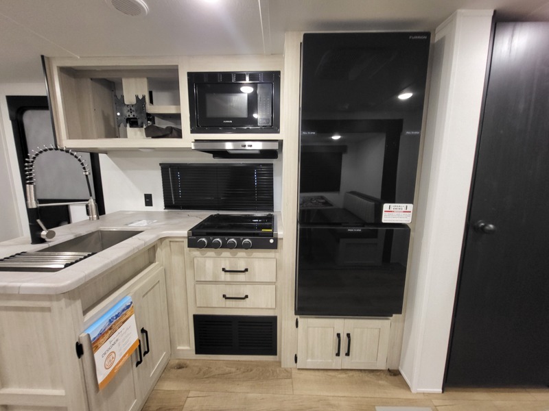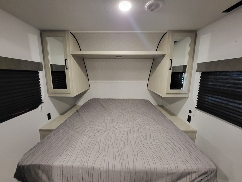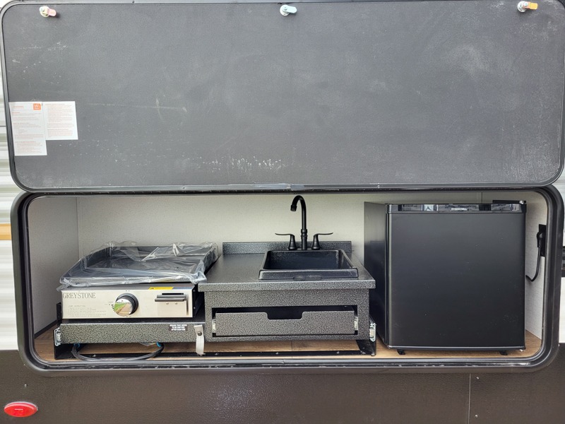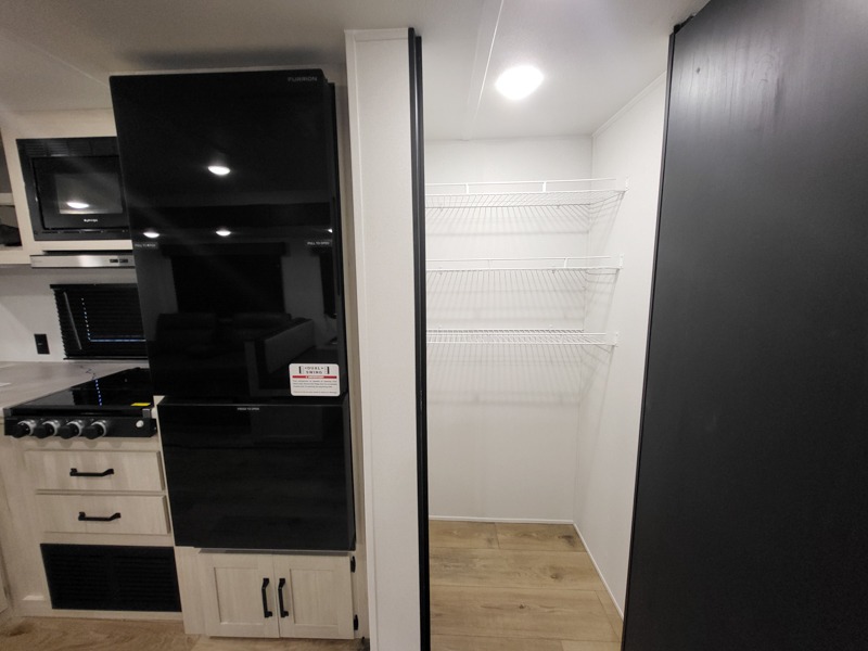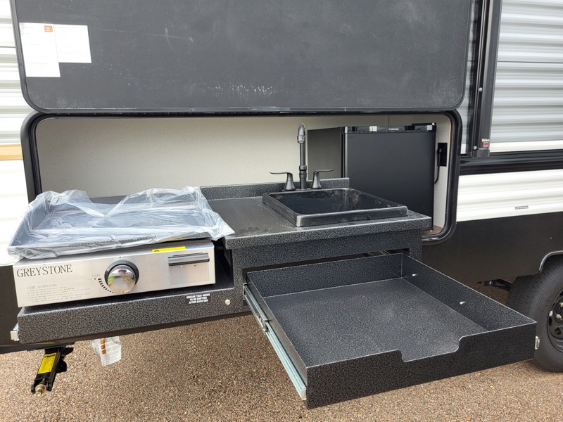 If you're looking for more space, this double axle unit features a large slide so you can walk about freely. Here, you'll find the booth dinette and sofa, which sit across from the optional TV if you want to enjoy movie nights. The full kitchen includes a stainless microwave and three burner cooktop to make meals, plus a pantry and 12V refrigerator for food storage. And an optional outside kitchen with a griddle can be added if you enjoy cooking outdoors! The kids or your guests will love the double-size bunks, and the full bath right beside the bunks includes a shower a seat for added comfort.