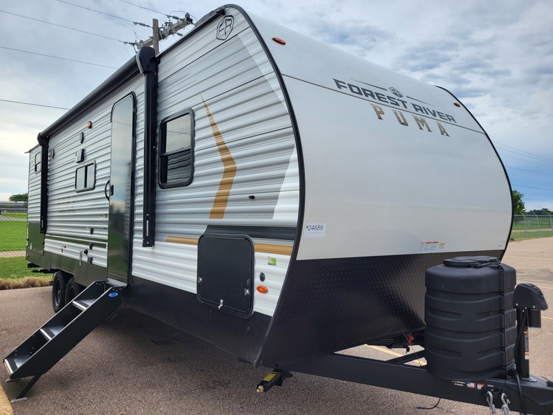 The Puma Camping Edition by Palomino offer an affordable travel trailer for rookie campers or seasoned RVers! They are built with 5/8" tongue and groove plywood flooring and a front diamond plate for added protection. There are also exterior clamp style door latches, back up camera prep, and 20 lb. LP bottles. Head inside to find Thermofoil countertops with a smooth drop edge, bedroom USB ports and outlets, and a GE appliance and kitchen package.