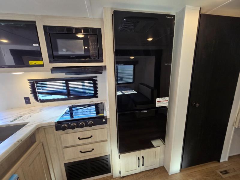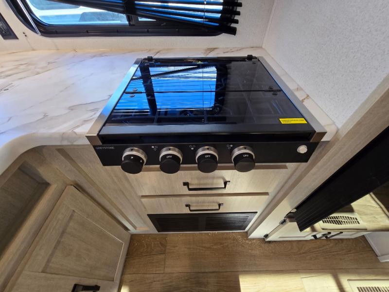 For entertainment, the large living space includes a booth dinette and a sofa, positioned across from an optional TV setup—great for movie nights. The kitchen is well-equipped with a stainless steel microwave, three-burner cooktop, 12V refrigerator, and pantry. If you're someone who loves cooking outdoors, you can opt for an outside kitchen with a griddle.