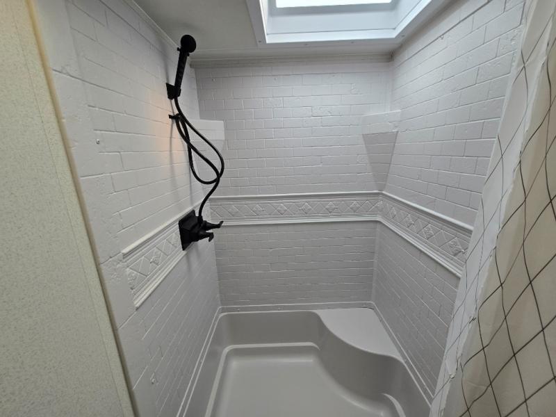 The full bath is located near the bunks and features a shower with a seat for added comfort.