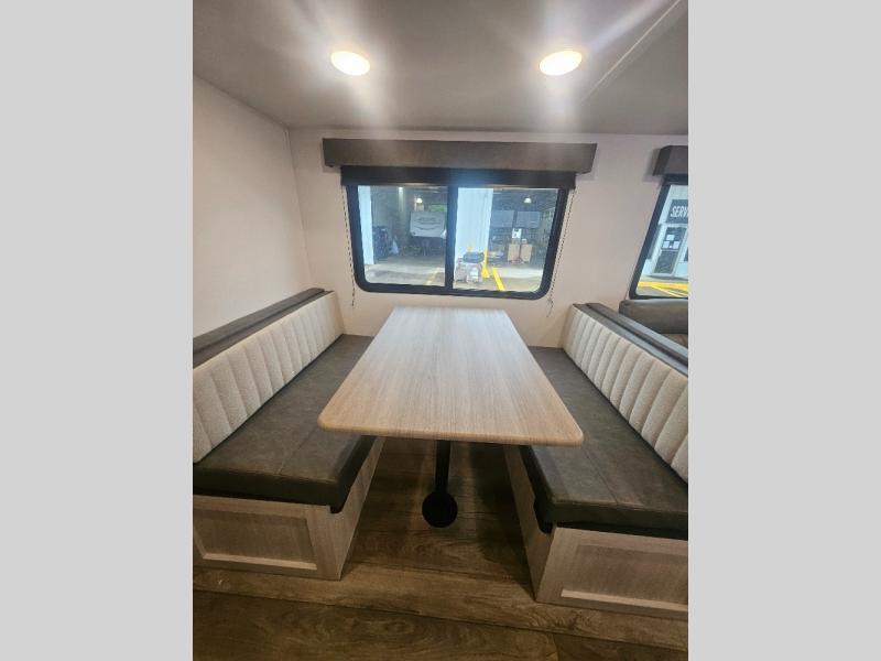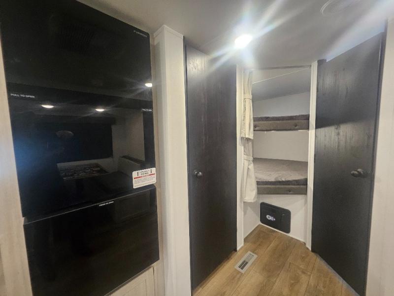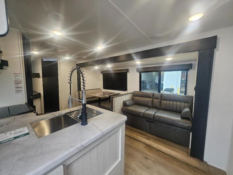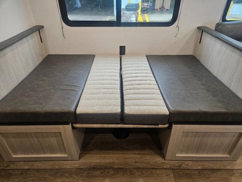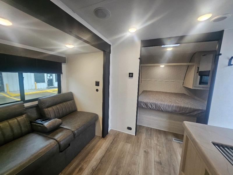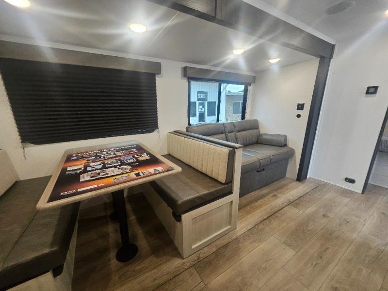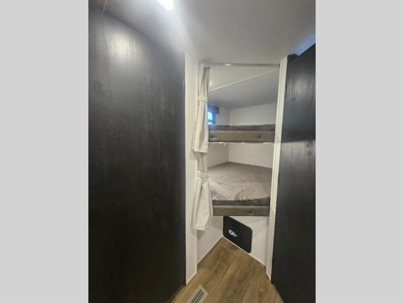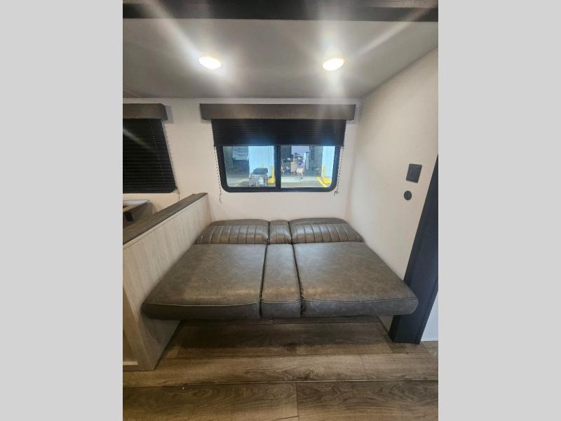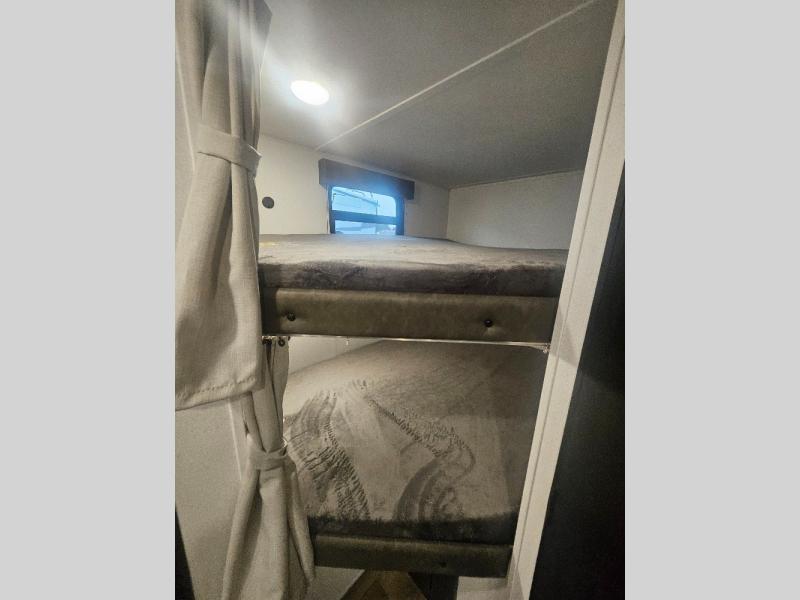 If you're looking for more space, this double axle unit features a large slide so you can walk about freely. Here, you'll find the booth dinette and sofa, which sit across from the optional TV if you want to enjoy movie nights. The full kitchen includes a stainless microwave and three burner cooktop to make meals, plus a pantry and 12V refrigerator for food storage. And an optional outside kitchen with a griddle can be added if you enjoy cooking outdoors! The kids or your guests will love the double-size bunks, and the full bath right beside the bunks includes a shower a seat for added comfort.