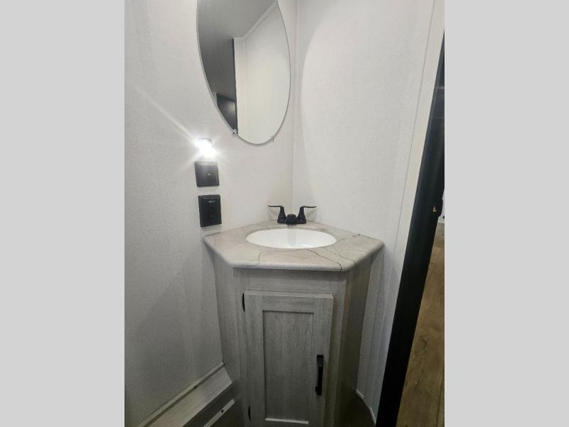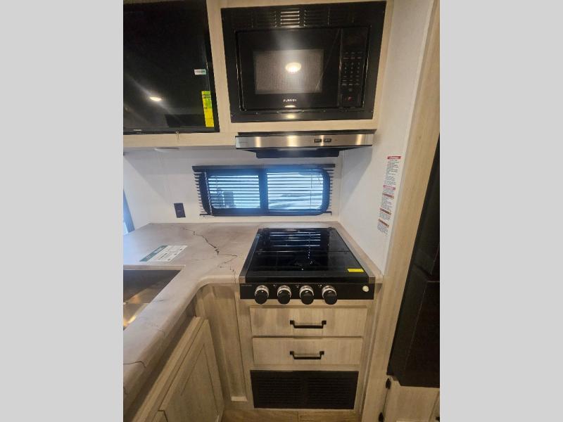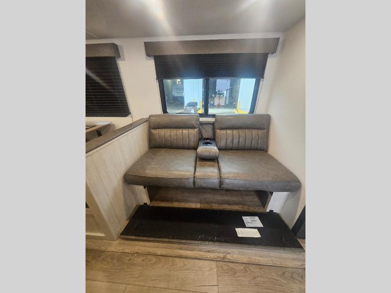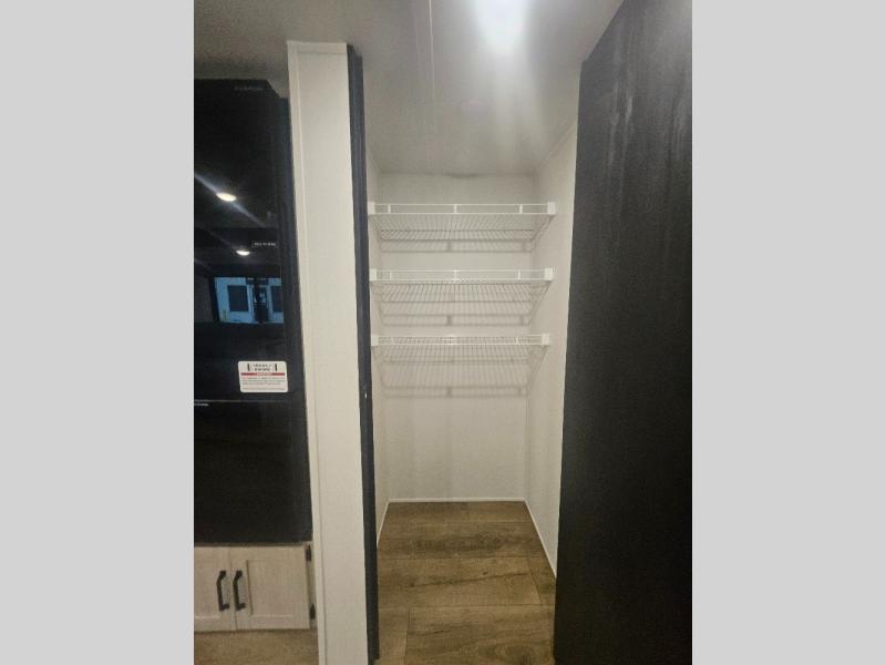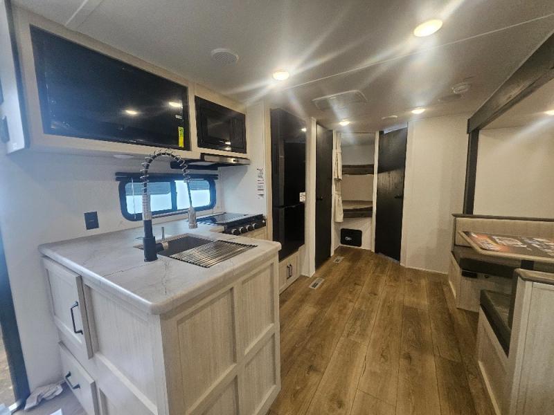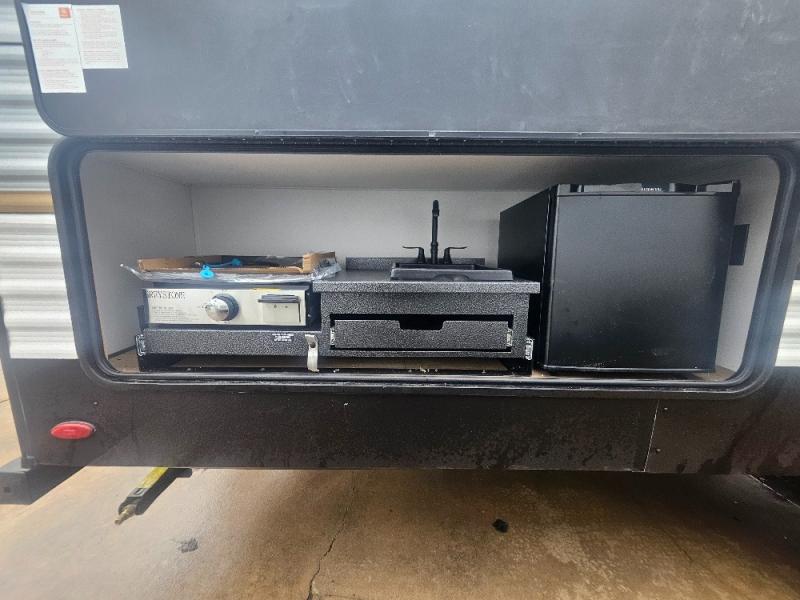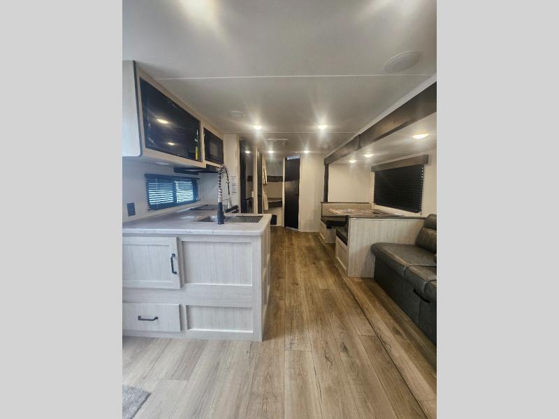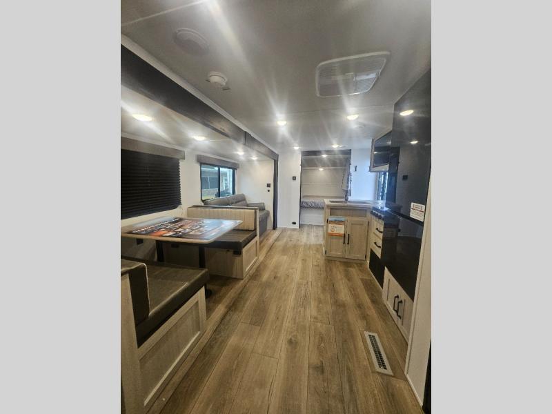 If you're looking for more space, this double axle unit features a large slide so you can walk about freely. Here, you'll find the booth dinette and sofa, which sit across from the optional TV if you want to enjoy movie nights. The full kitchen includes a stainless microwave and three burner cooktop to make meals, plus a pantry and 12V refrigerator for food storage. And an optional outside kitchen with a griddle can be added if you enjoy cooking outdoors! The kids or your guests will love the double-size bunks, and the full bath right beside the bunks includes a shower a seat for added comfort.