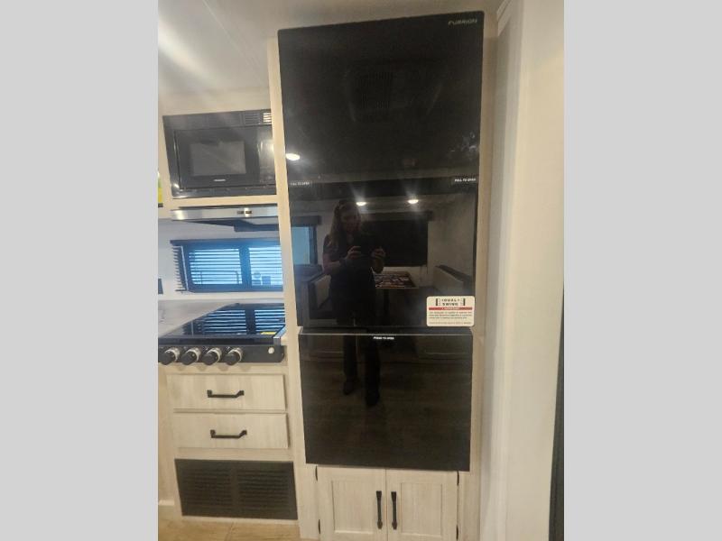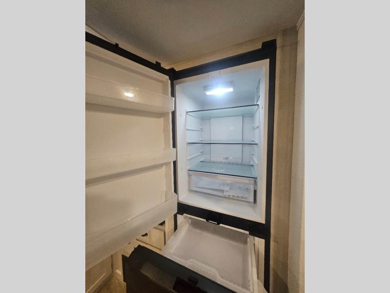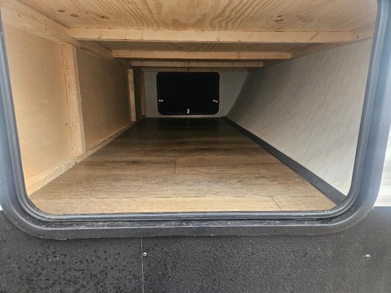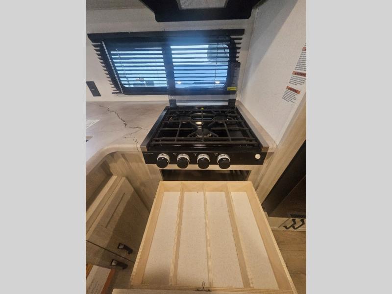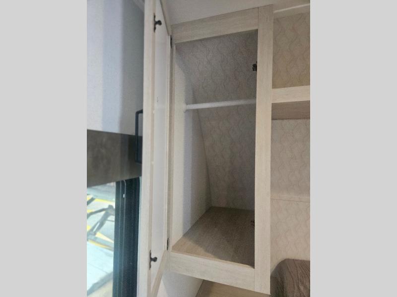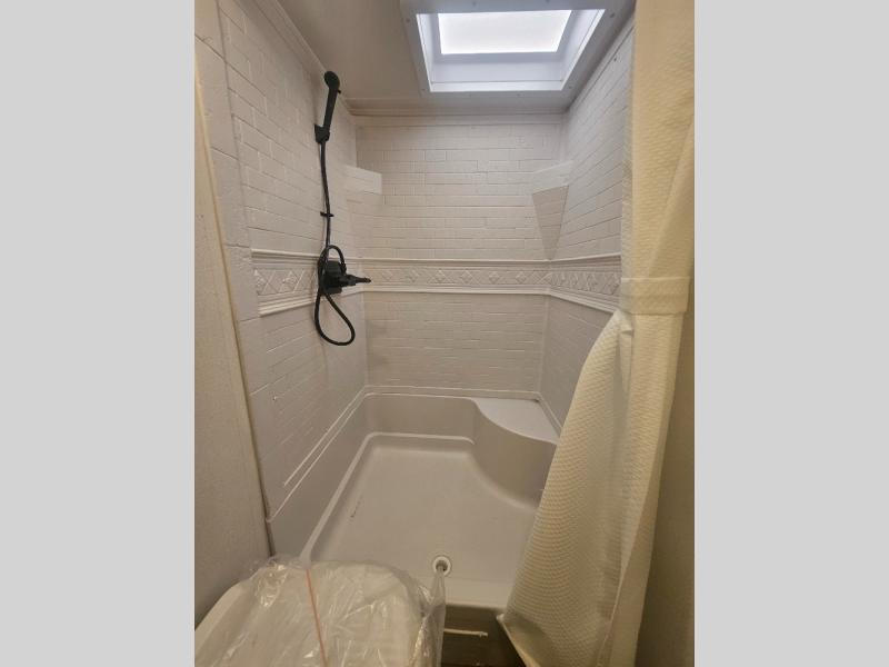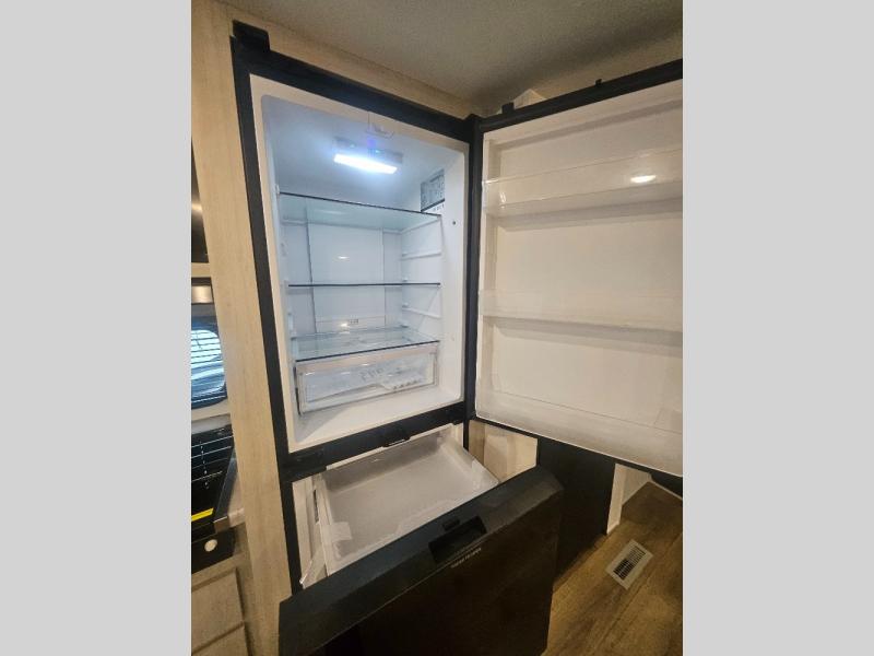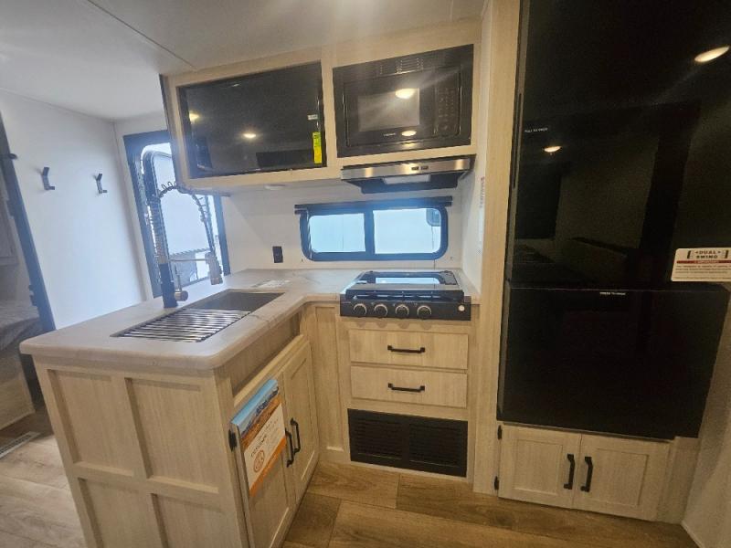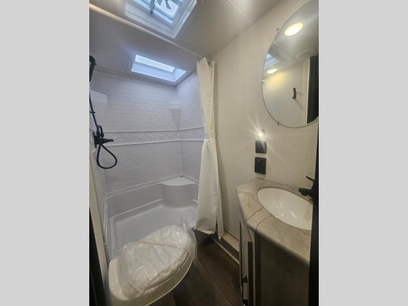 If you're looking for more space, this double axle unit features a large slide so you can walk about freely. Here, you'll find the booth dinette and sofa, which sit across from the optional TV if you want to enjoy movie nights. The full kitchen includes a stainless microwave and three burner cooktop to make meals, plus a pantry and 12V refrigerator for food storage. And an optional outside kitchen with a griddle can be added if you enjoy cooking outdoors! The kids or your guests will love the double-size bunks, and the full bath right beside the bunks includes a shower a seat for added comfort.