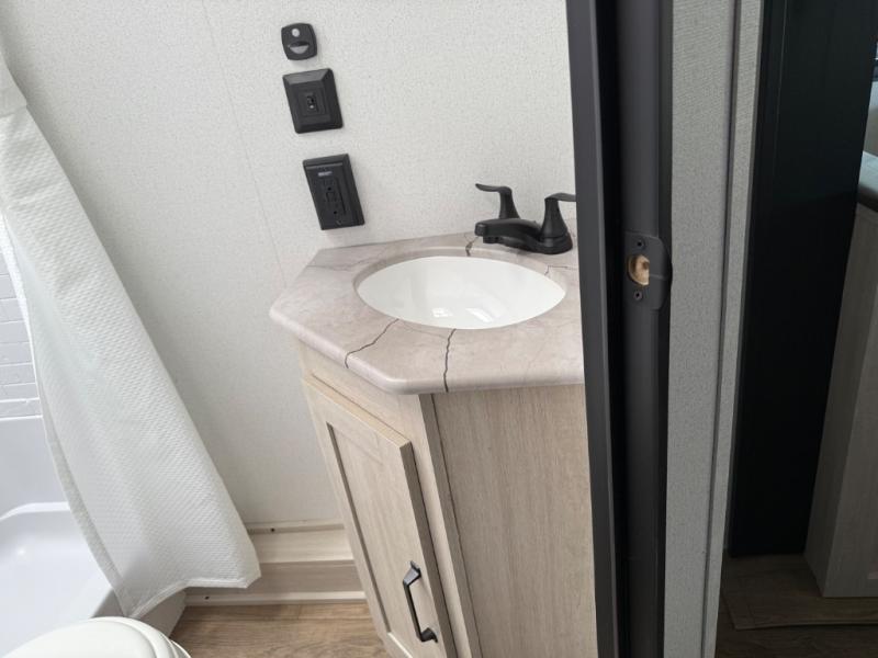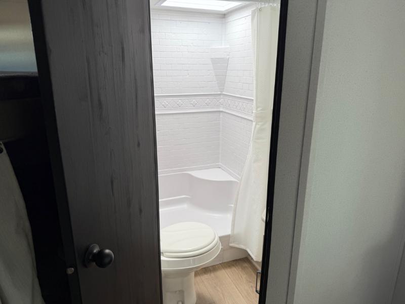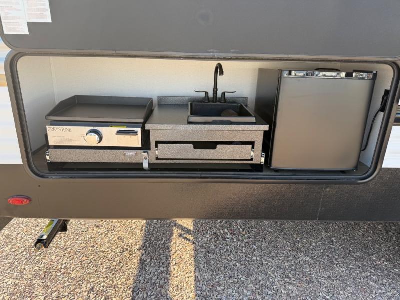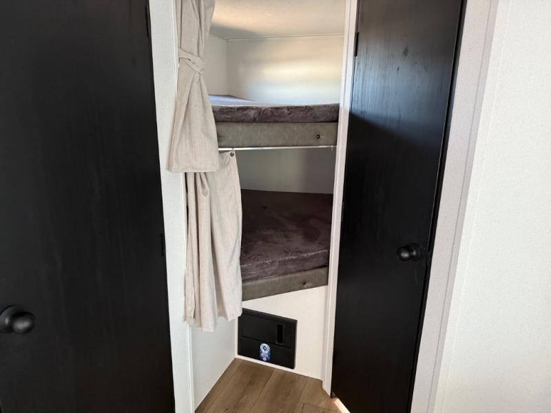 If you're looking for more space, this double axle unit features a large slide so you can walk about freely. Here, you'll find the booth dinette and sofa, which sit across from the optional TV if you want to enjoy movie nights. The full kitchen includes a stainless microwave and three burner cooktop to make meals, plus a pantry and 12V refrigerator for food storage. And an optional outside kitchen with a griddle can be added if you enjoy cooking outdoors! The kids or your guests will love the double-size bunks, and the full bath right beside the bunks includes a shower a seat for added comfort.