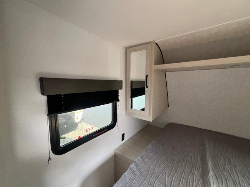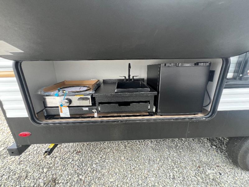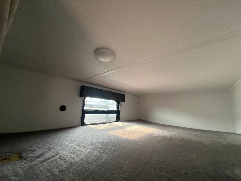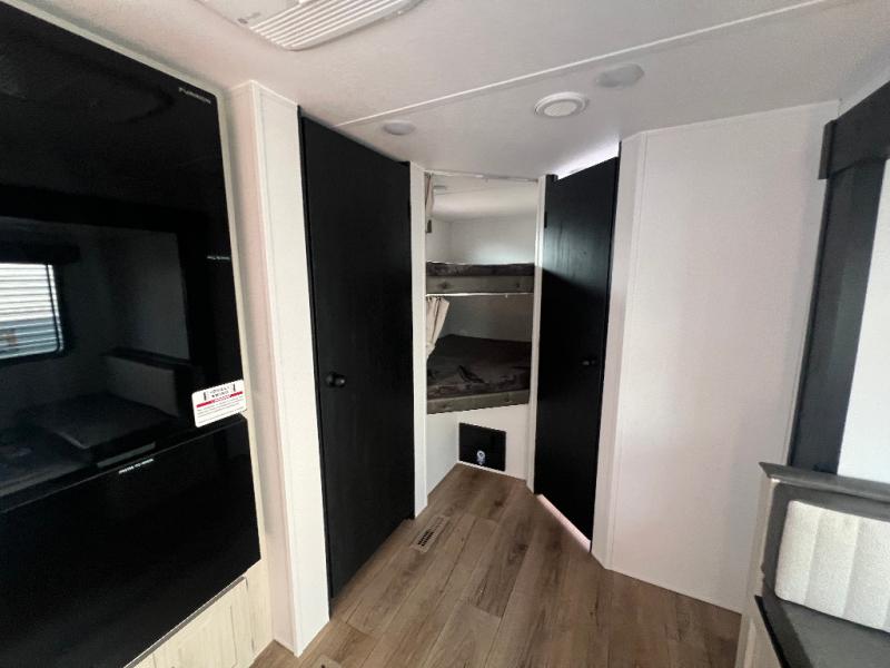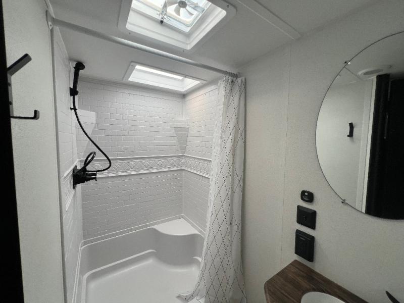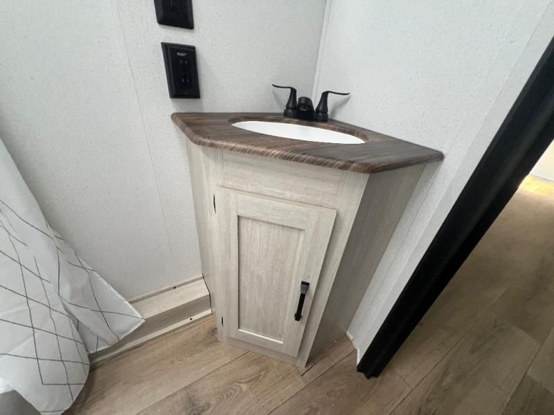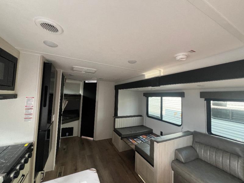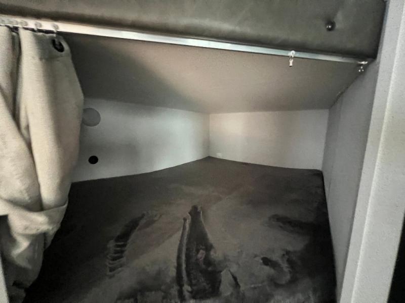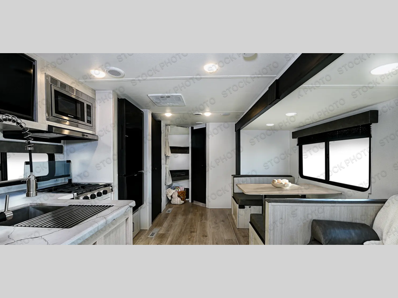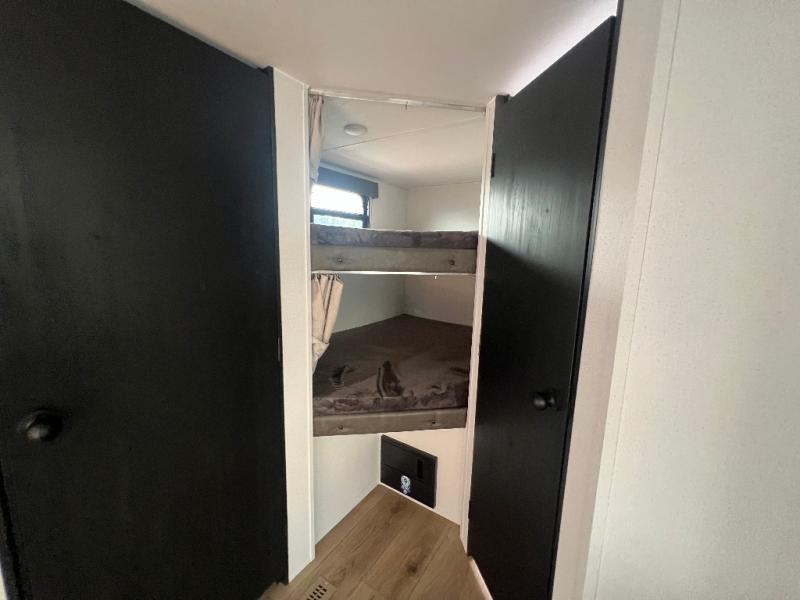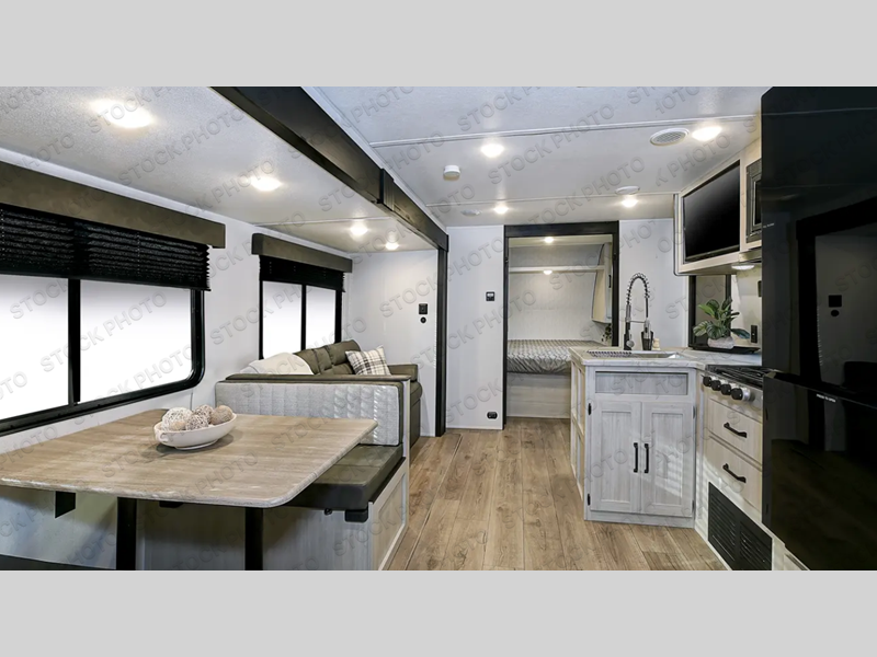 If you're looking for more space, this double axle unit features a large slide so you can walk about freely. Here, you'll find the booth dinette and sofa, which sit across from the optional TV if you want to enjoy movie nights. The full kitchen includes a stainless microwave and three burner cooktop to make meals, plus a pantry and 12V refrigerator for food storage. And an optional outside kitchen with a griddle can be added if you enjoy cooking outdoors! The kids or your guests will love the double-size bunks, and the full bath right beside the bunks includes a shower a seat for added comfort.