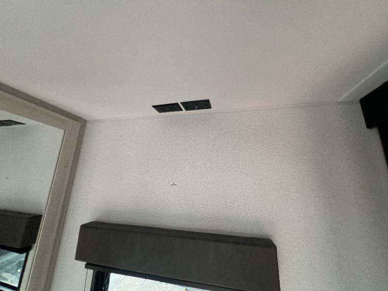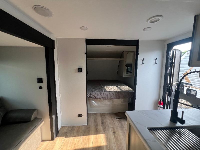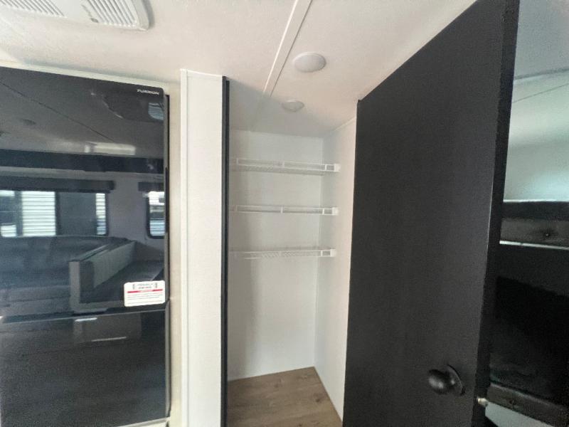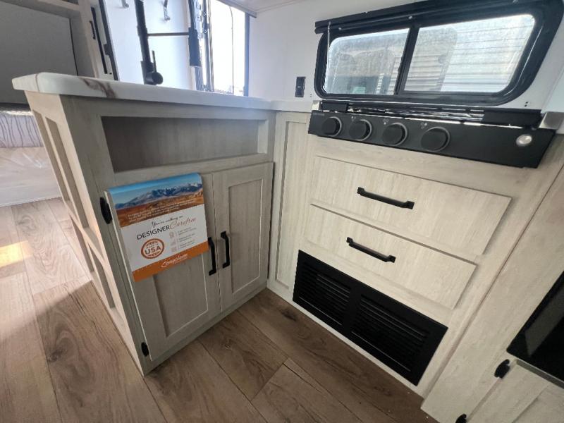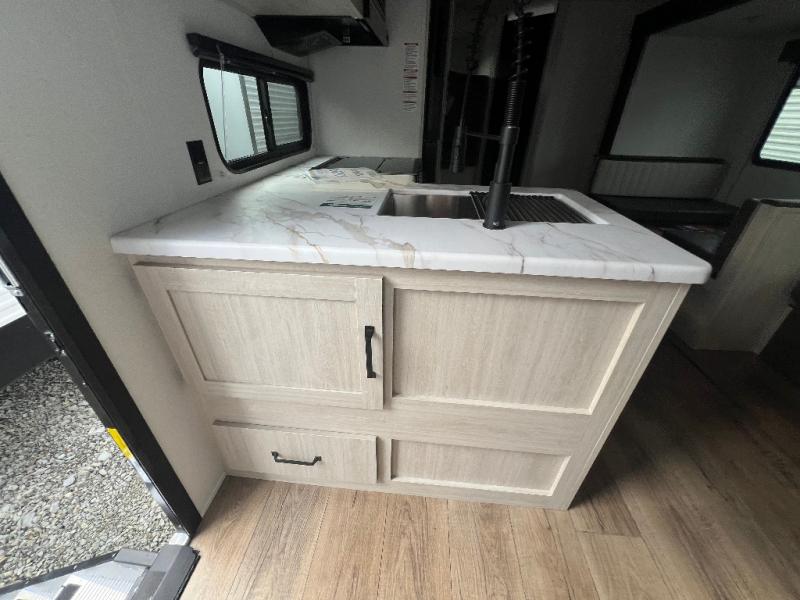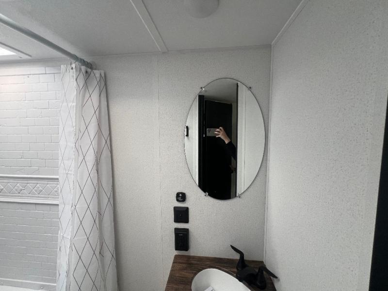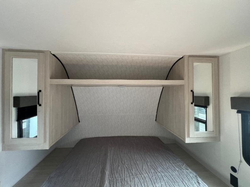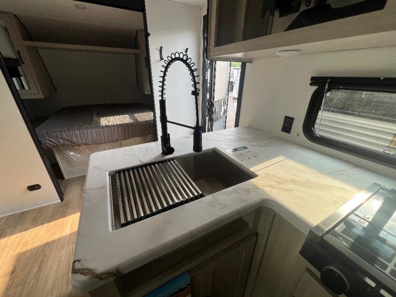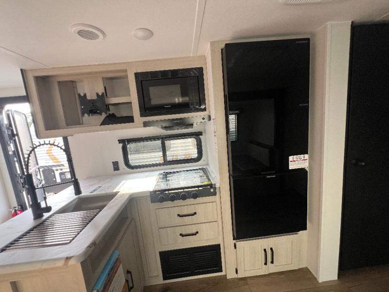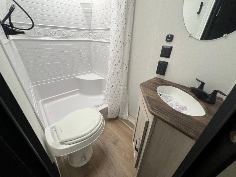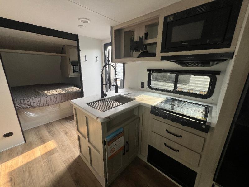 If you're looking for more space, this double axle unit features a large slide so you can walk about freely. Here, you'll find the booth dinette and sofa, which sit across from the optional TV if you want to enjoy movie nights. The full kitchen includes a stainless microwave and three burner cooktop to make meals, plus a pantry and 12V refrigerator for food storage. And an optional outside kitchen with a griddle can be added if you enjoy cooking outdoors! The kids or your guests will love the double-size bunks, and the full bath right beside the bunks includes a shower a seat for added comfort.