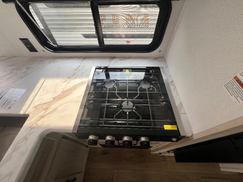 The Puma Camping Edition by Palomino offer an affordable travel trailer for rookie campers or seasoned RVers! They are built with 5/8" tongue and groove plywood flooring and a front diamond plate for added protection. There are also exterior clamp style door latches, back up camera prep, and 20 lb. LP bottles. Head inside to find Thermofoil countertops with a smooth drop edge, bedroom USB ports and outlets, and a GE appliance and kitchen package.