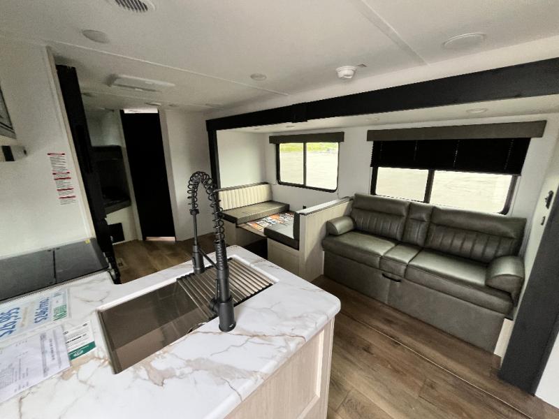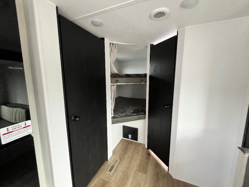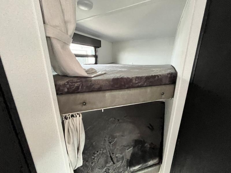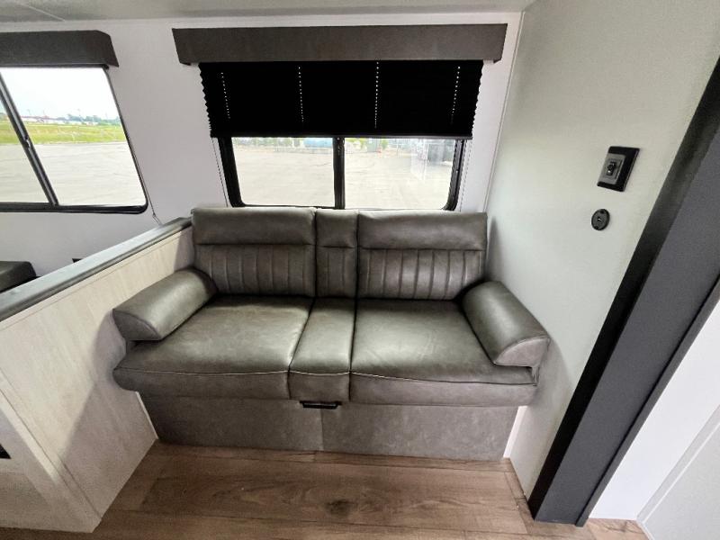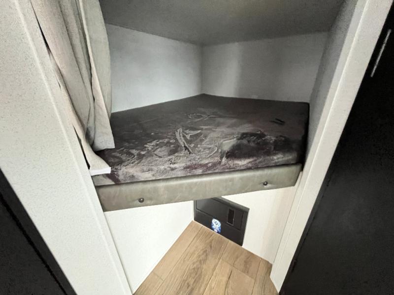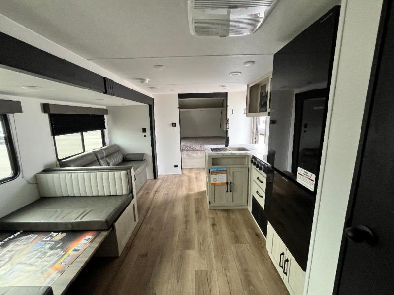 If you're looking for more space, this double axle unit features a large slide so you can walk about freely. Here, you'll find the booth dinette and sofa, which sit across from the optional TV if you want to enjoy movie nights. The full kitchen includes a stainless microwave and three burner cooktop to make meals, plus a pantry and 12V refrigerator for food storage. And an optional outside kitchen with a griddle can be added if you enjoy cooking outdoors! The kids or your guests will love the double-size bunks, and the full bath right beside the bunks includes a shower a seat for added comfort.