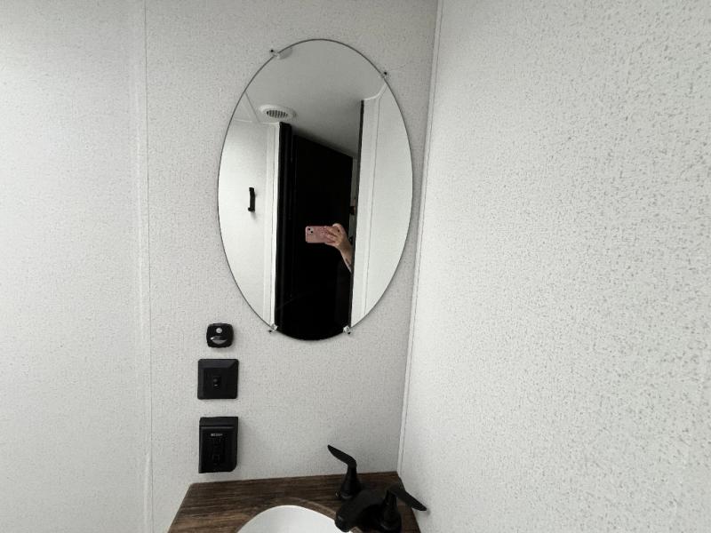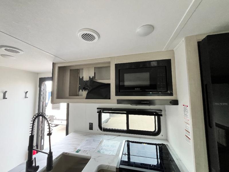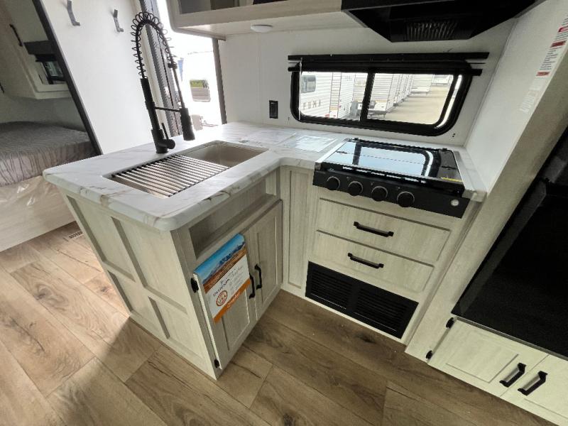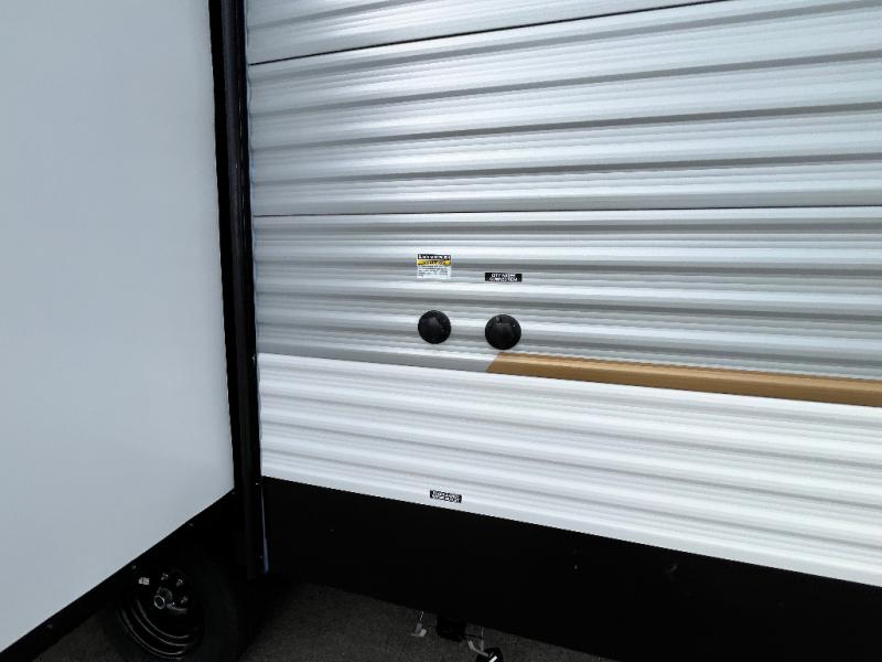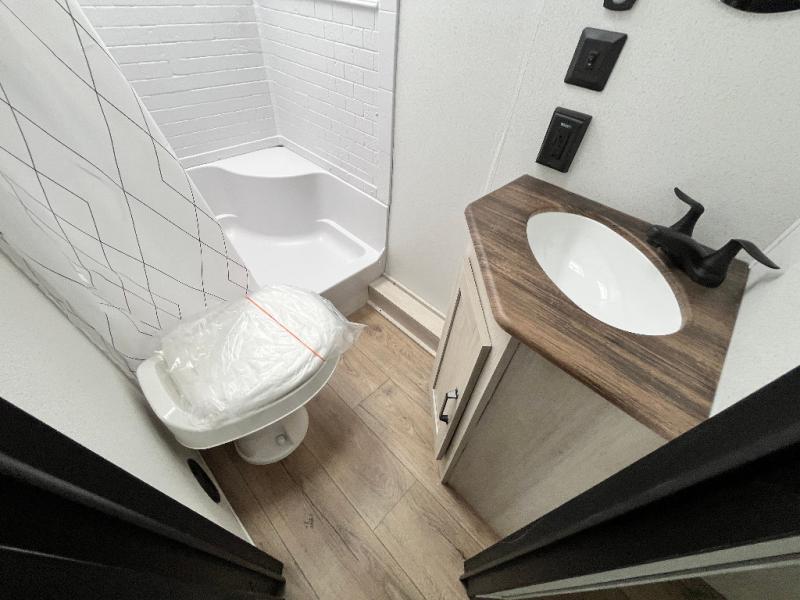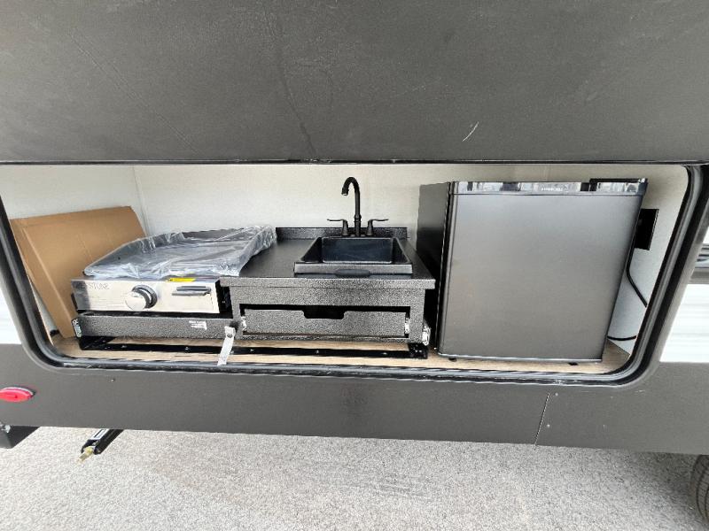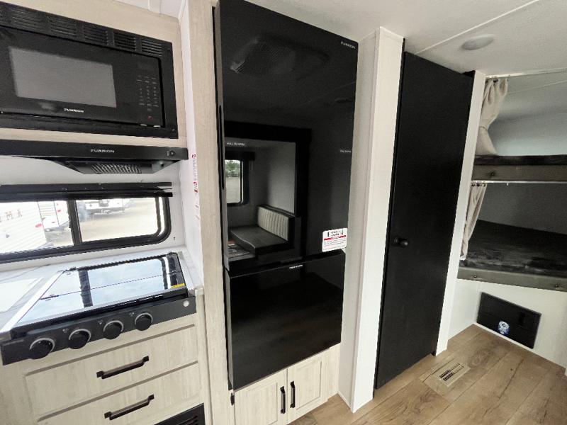 If you're looking for more space, this double axle unit features a large slide so you can walk about freely. Here, you'll find the booth dinette and sofa, which sit across from the optional TV if you want to enjoy movie nights. The full kitchen includes a stainless microwave and three burner cooktop to make meals, plus a pantry and 12V refrigerator for food storage. And an optional outside kitchen with a griddle can be added if you enjoy cooking outdoors! The kids or your guests will love the double-size bunks, and the full bath right beside the bunks includes a shower a seat for added comfort.
