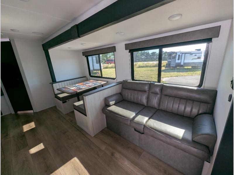 For entertainment, the large living space includes a booth dinette and a sofa, positioned across from an optional TV setup—great for movie nights. The kitchen is well-equipped with a stainless steel microwave, three-burner cooktop, 12V refrigerator, and pantry. If you're someone who loves cooking outdoors, you can opt for an outside kitchen with a griddle.