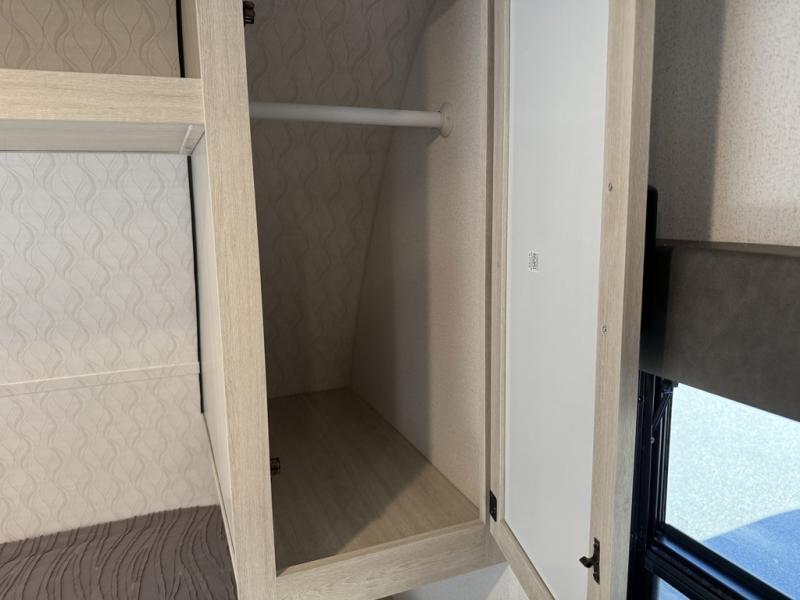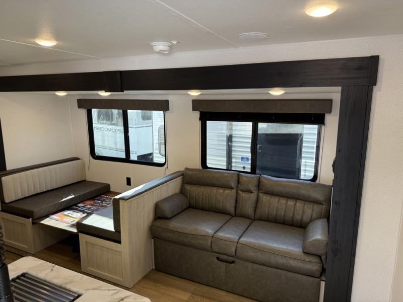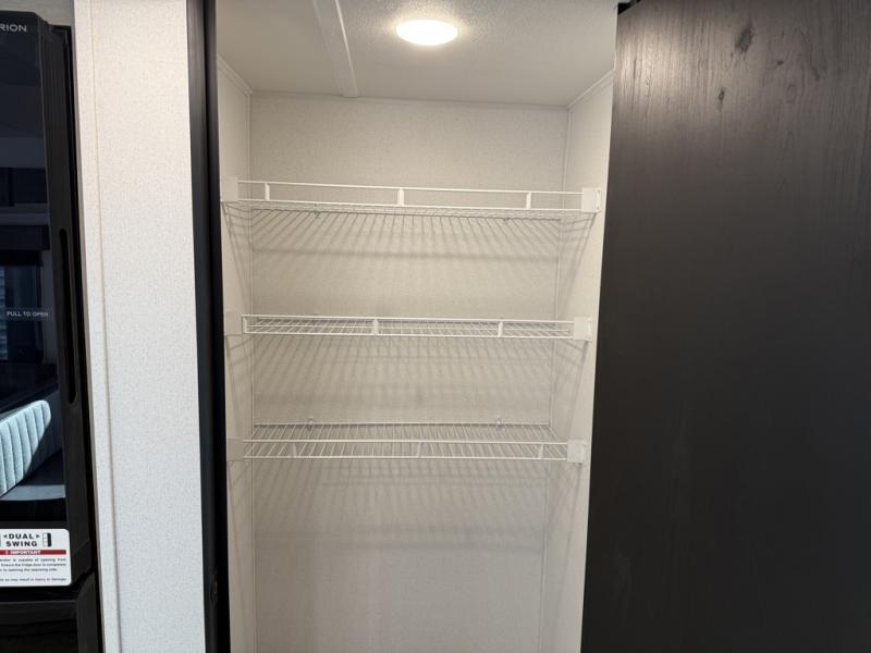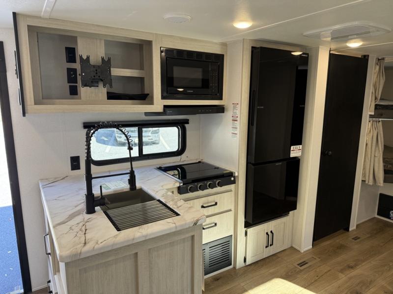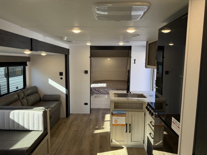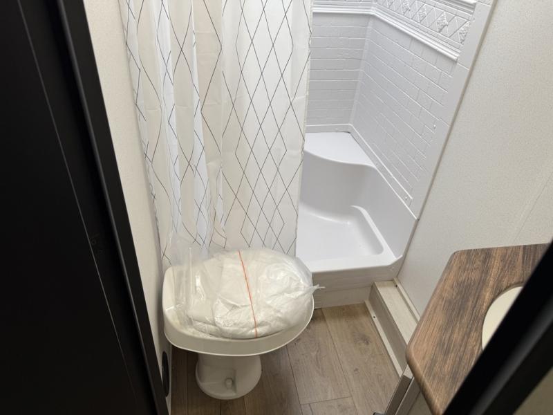If you're looking for more space, this double axle unit features a large slide so you can walk about freely. Here, you'll find the booth dinette and sofa, which sit across from the optional TV if you want to enjoy movie nights. The full kitchen includes a stainless microwave and three burner cooktop to make meals, plus a pantry and 12V refrigerator for food storage. And an optional outside kitchen with a griddle can be added if you enjoy cooking outdoors! The kids or your guests will love the double-size bunks, and the full bath right beside the bunks includes a shower a seat for added comfort.