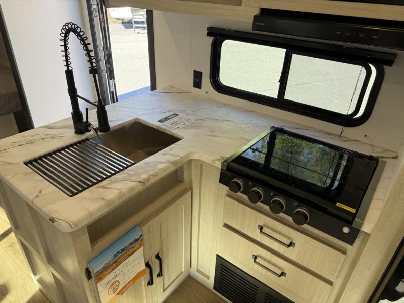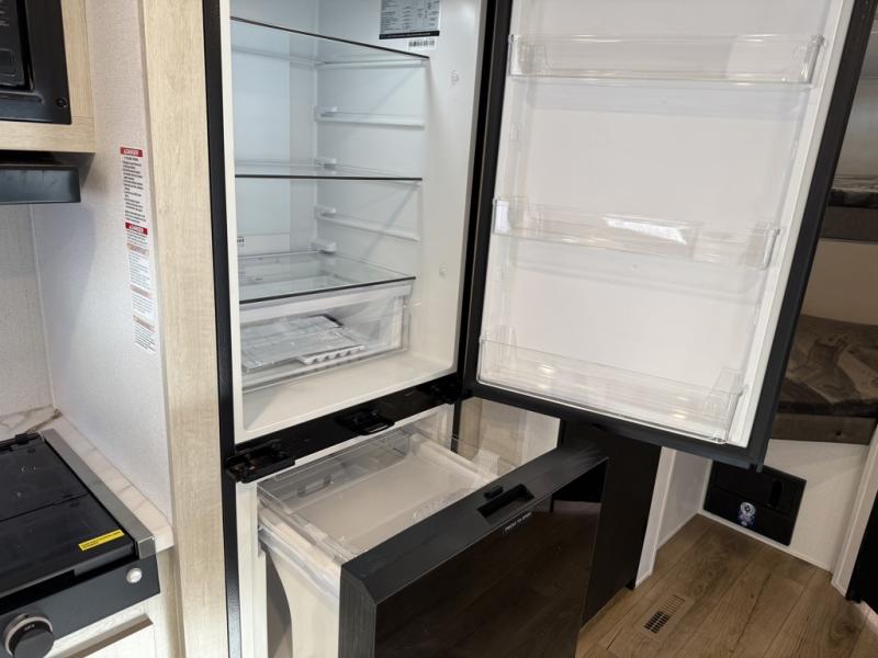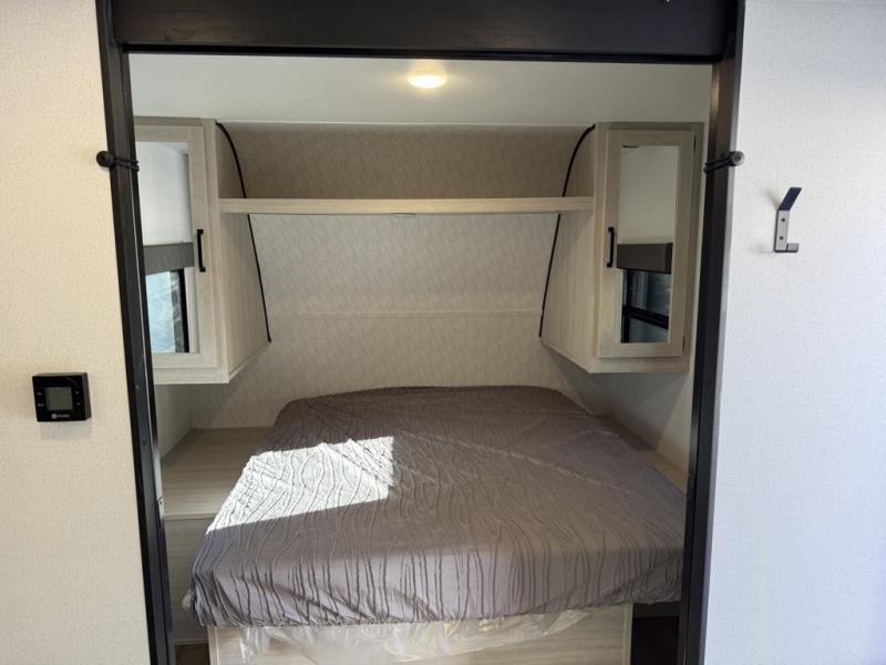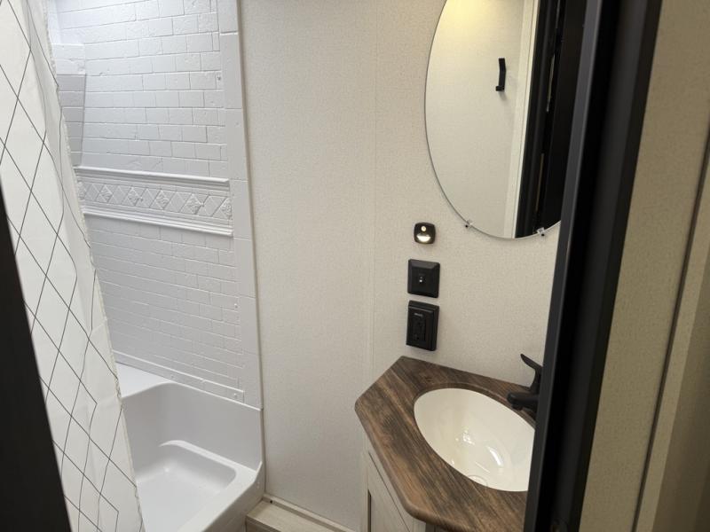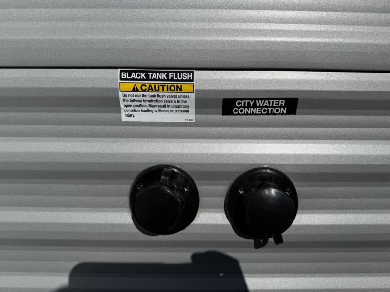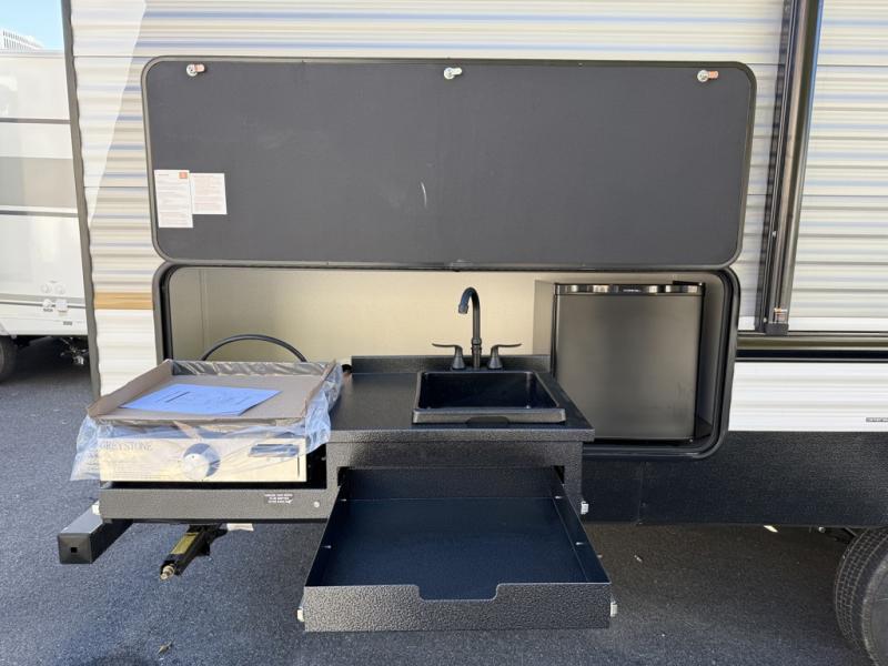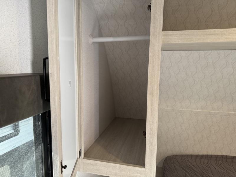 If you're looking for more space, this double axle unit features a large slide so you can walk about freely. Here, you'll find the booth dinette and sofa, which sit across from the optional TV if you want to enjoy movie nights. The full kitchen includes a stainless microwave and three burner cooktop to make meals, plus a pantry and 12V refrigerator for food storage. And an optional outside kitchen with a griddle can be added if you enjoy cooking outdoors! The kids or your guests will love the double-size bunks, and the full bath right beside the bunks includes a shower a seat for added comfort.