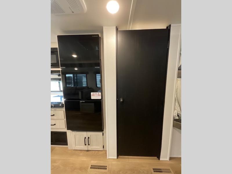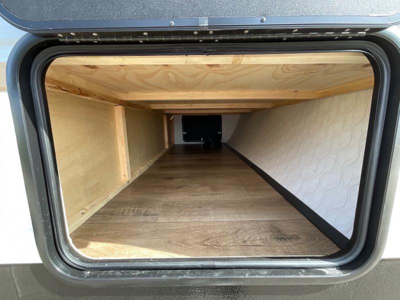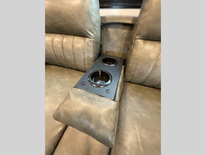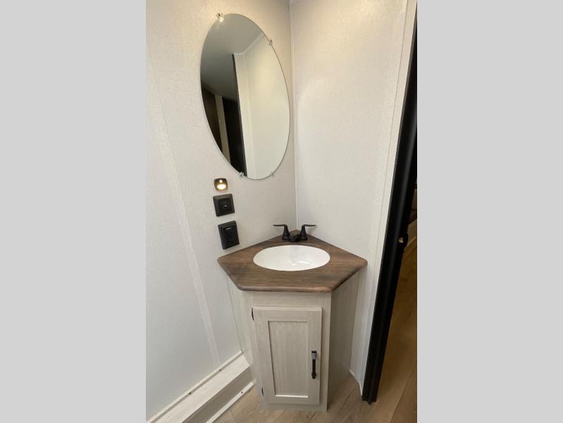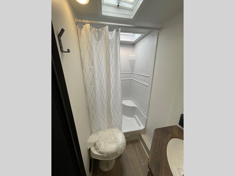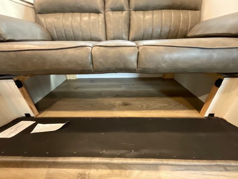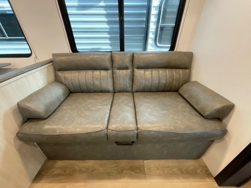 If you're looking for more space, this double axle unit features a large slide so you can walk about freely. Here, you'll find the booth dinette and sofa, which sit across from the optional TV if you want to enjoy movie nights. The full kitchen includes a stainless microwave and three burner cooktop to make meals, plus a pantry and 12V refrigerator for food storage. And an optional outside kitchen with a griddle can be added if you enjoy cooking outdoors! The kids or your guests will love the double-size bunks, and the full bath right beside the bunks includes a shower a seat for added comfort.