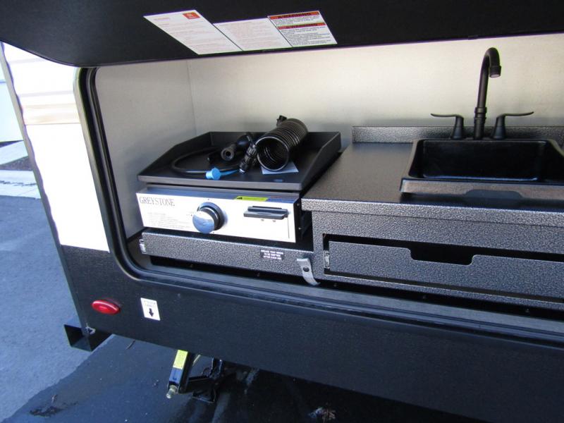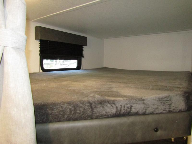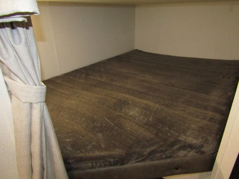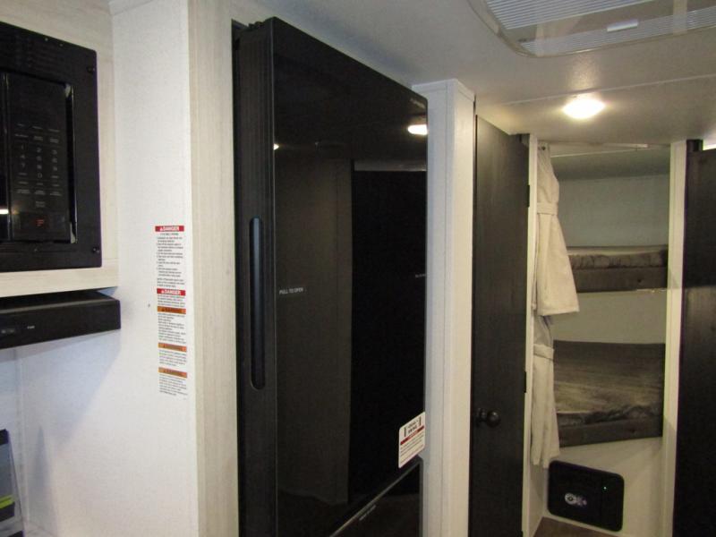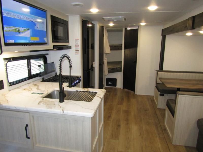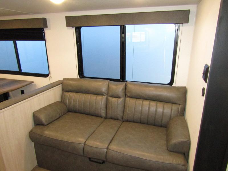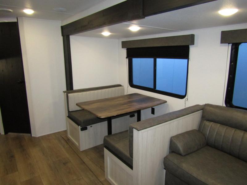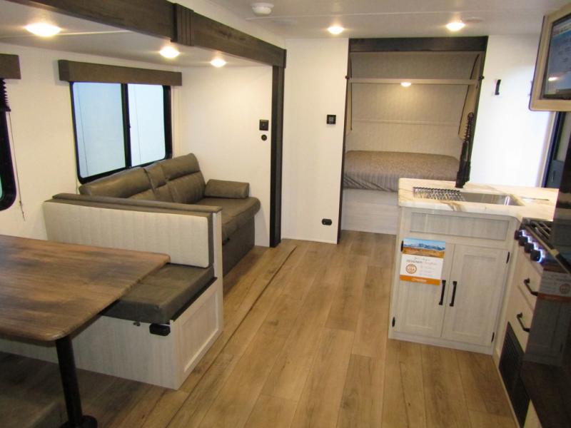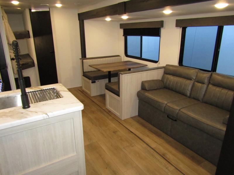 If you're looking for more space, this double axle unit features a large slide so you can walk about freely. Here, you'll find the booth dinette and sofa, which sit across from the optional TV if you want to enjoy movie nights. The full kitchen includes a stainless microwave and three burner cooktop to make meals, plus a pantry and 12V refrigerator for food storage. And an optional outside kitchen with a griddle can be added if you enjoy cooking outdoors! The kids or your guests will love the double-size bunks, and the full bath right beside the bunks includes a shower a seat for added comfort.