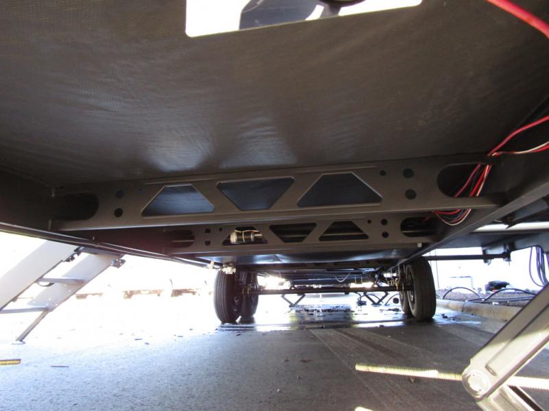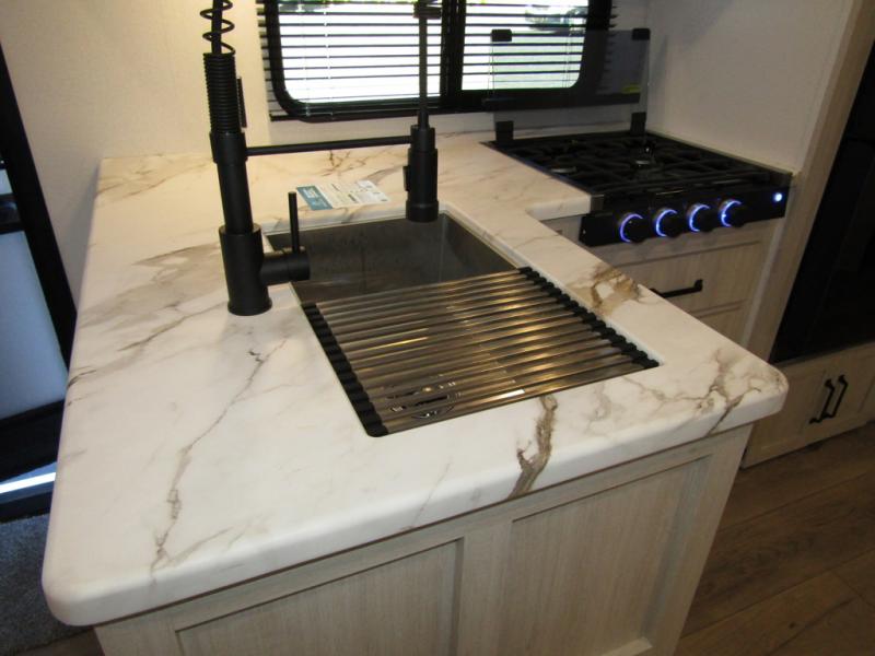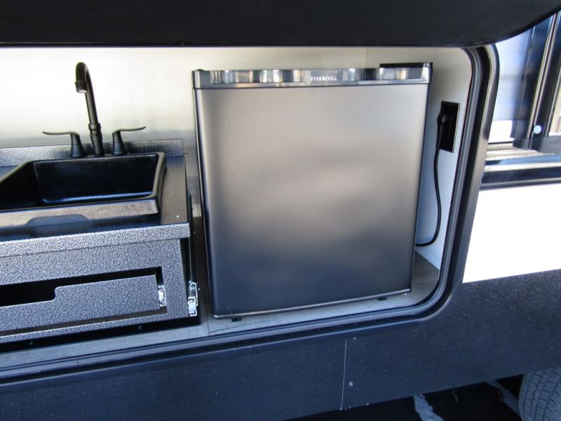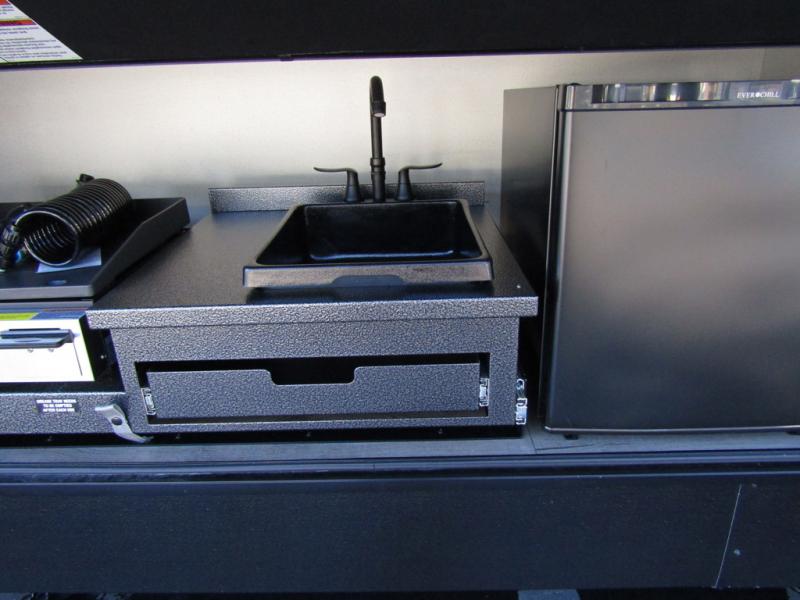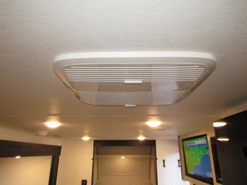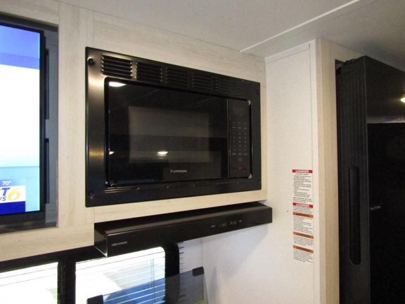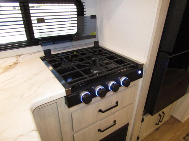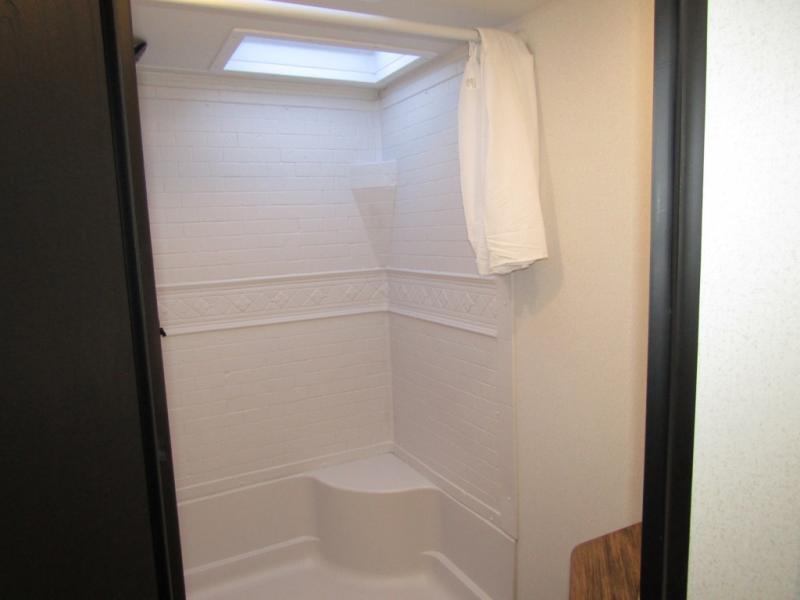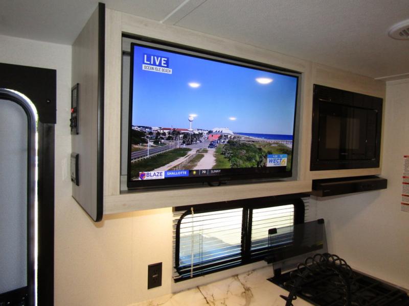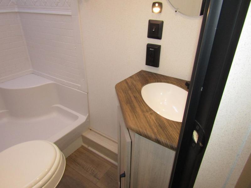 If you're looking for more space, this double axle unit features a large slide so you can walk about freely. Here, you'll find the booth dinette and sofa, which sit across from the optional TV if you want to enjoy movie nights. The full kitchen includes a stainless microwave and three burner cooktop to make meals, plus a pantry and 12V refrigerator for food storage. And an optional outside kitchen with a griddle can be added if you enjoy cooking outdoors! The kids or your guests will love the double-size bunks, and the full bath right beside the bunks includes a shower a seat for added comfort.