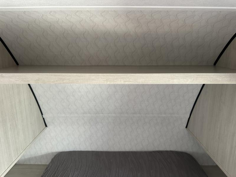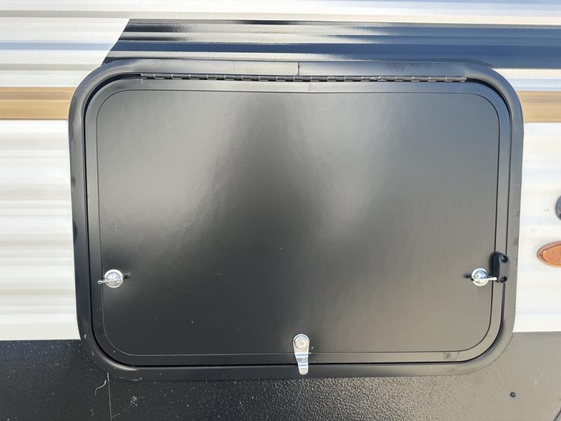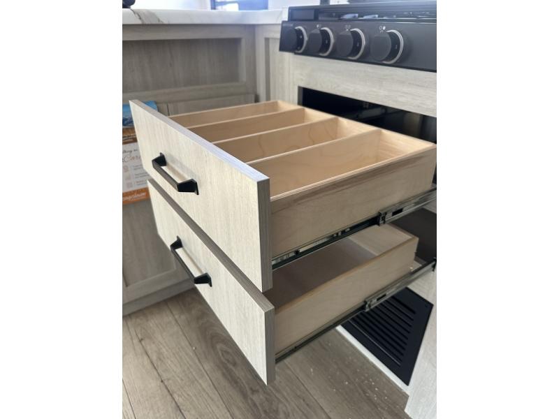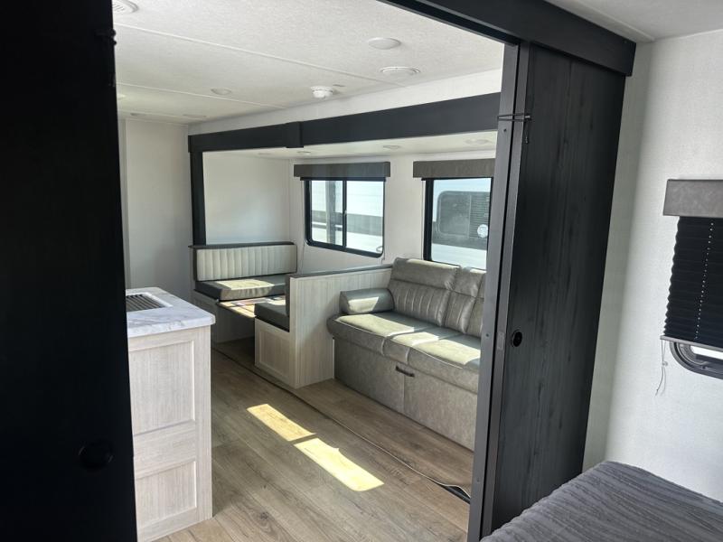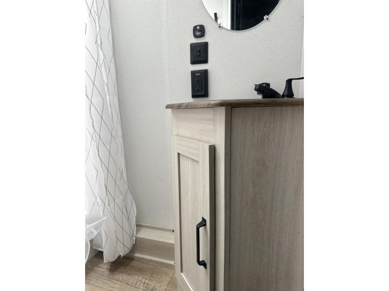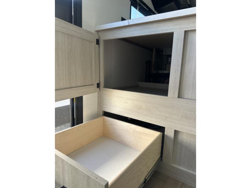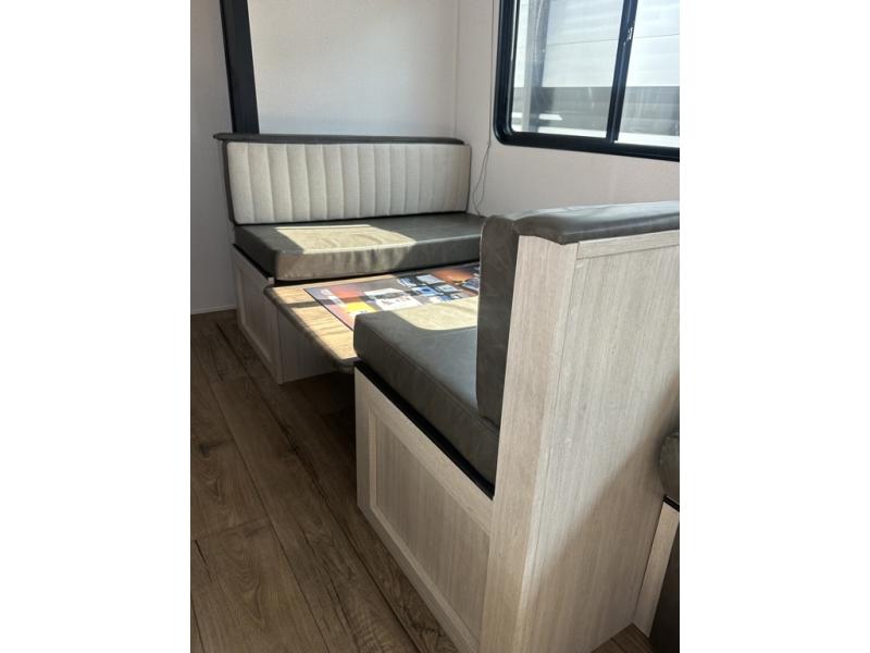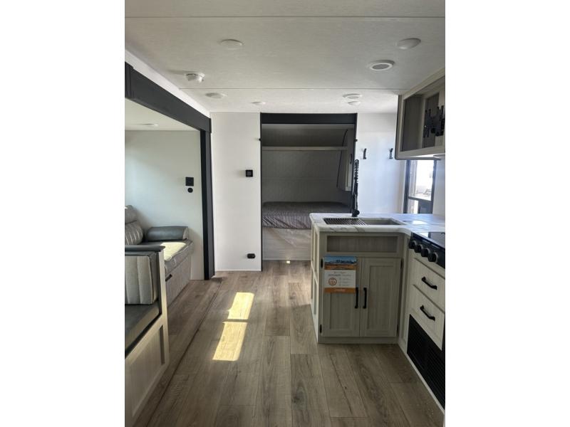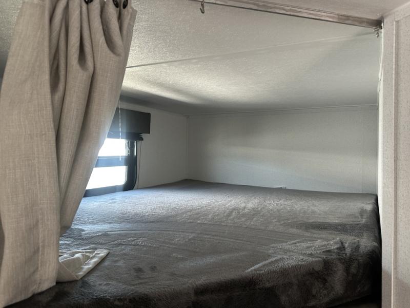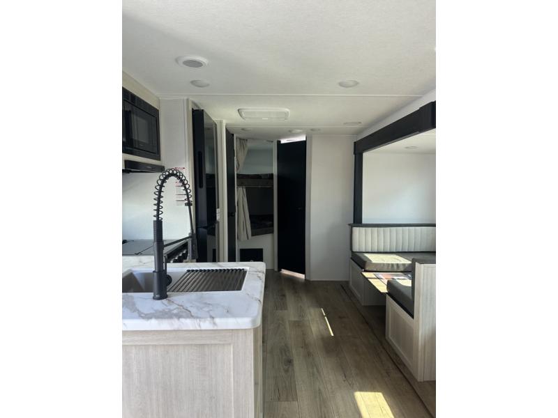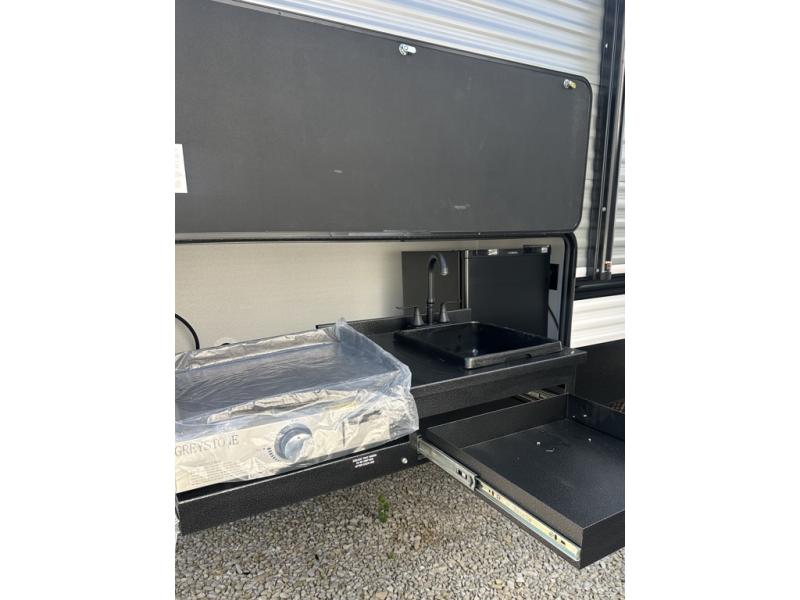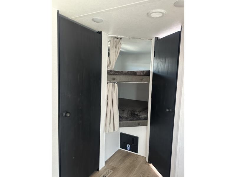 If you're looking for more space, this double axle unit features a large slide so you can walk about freely. Here, you'll find the booth dinette and sofa, which sit across from the optional TV if you want to enjoy movie nights. The full kitchen includes a microwave and three burner cooktop to make meals, plus a pantry and 12V refrigerator for food storage. There is even washer and dryer prep in the pantry if you choose to add these appliances. An optional outside mini kitchen can be added if you enjoy cooking outdoors! The kids or your guests will love the double-size bunks, and the full bath right beside the bunks includes a shower a seat for added comfort.