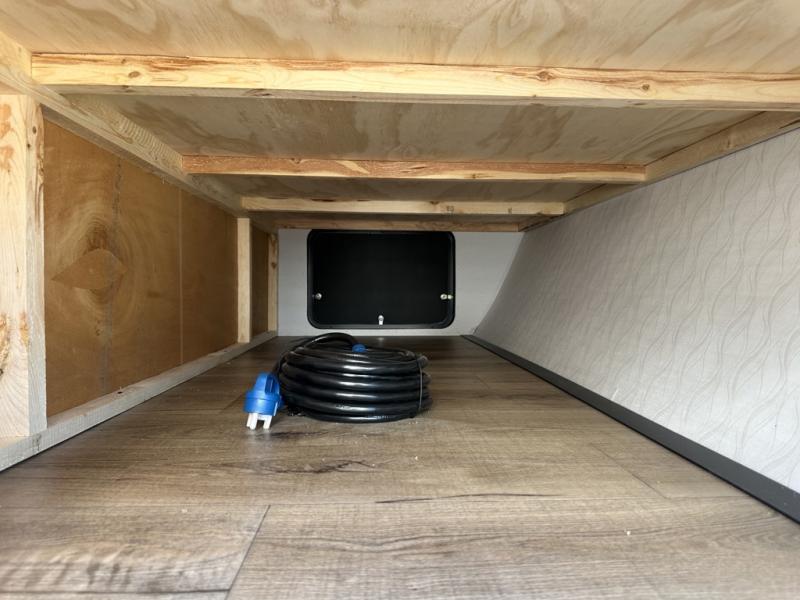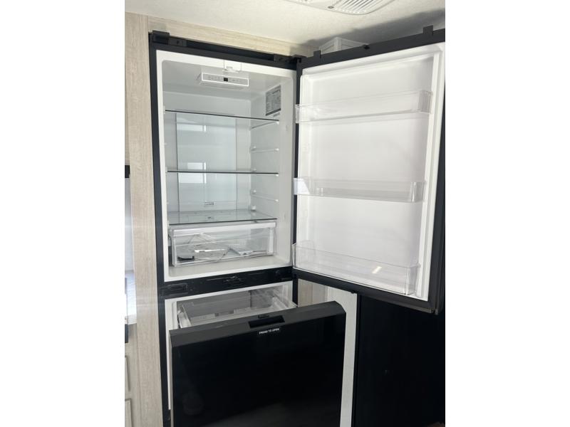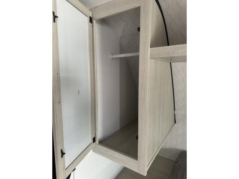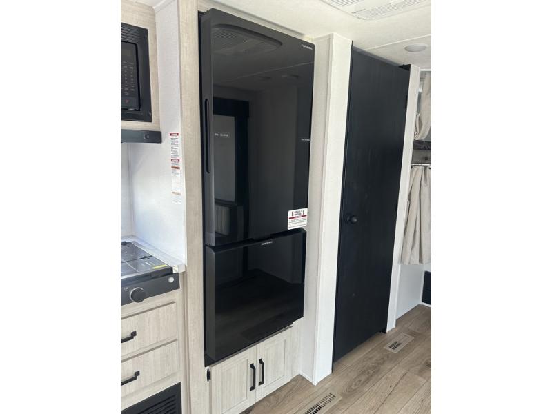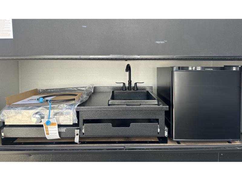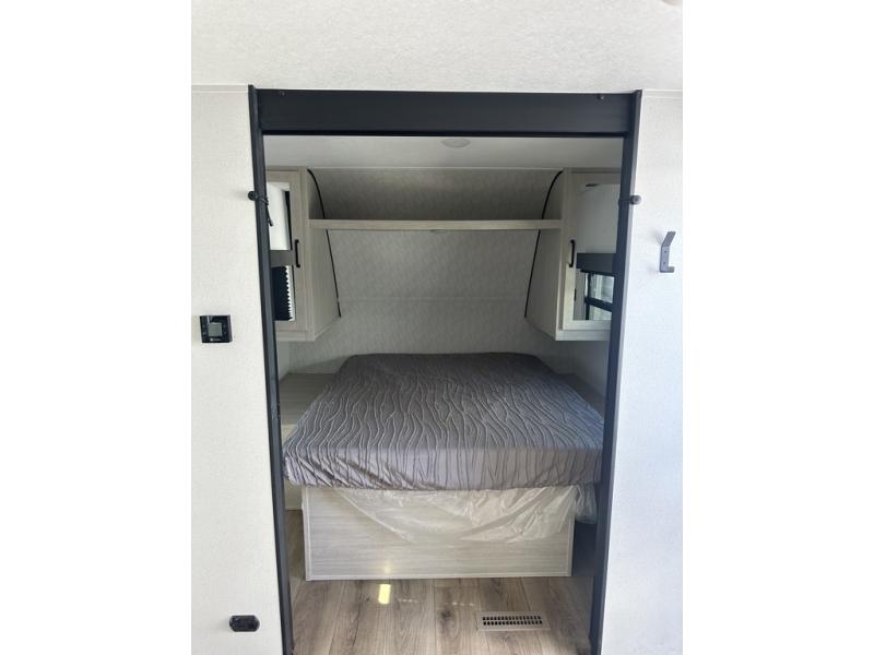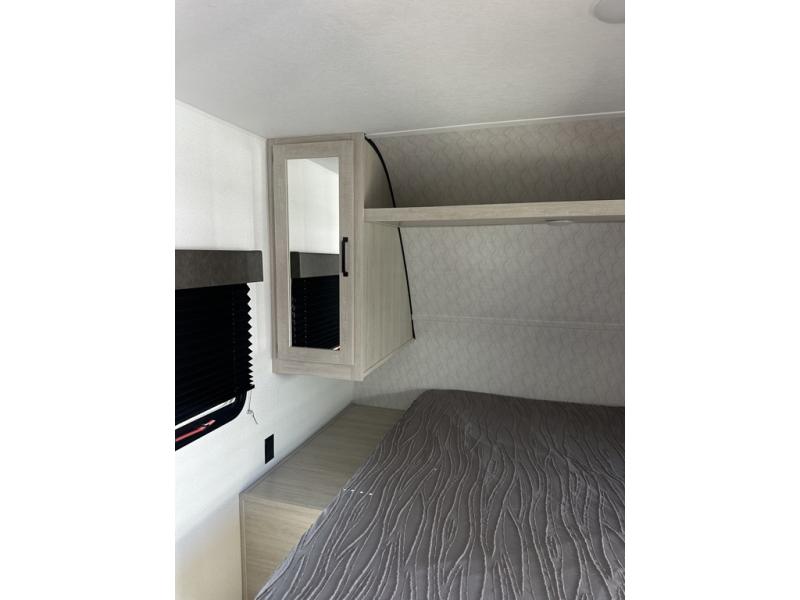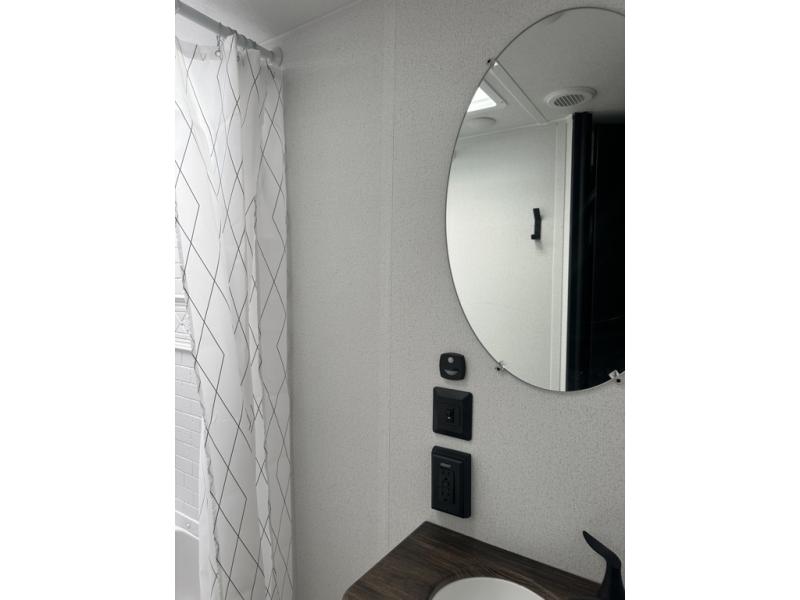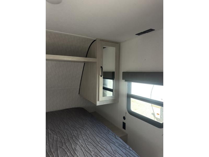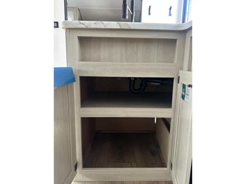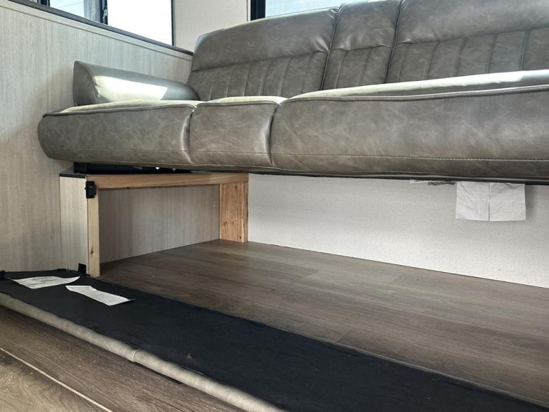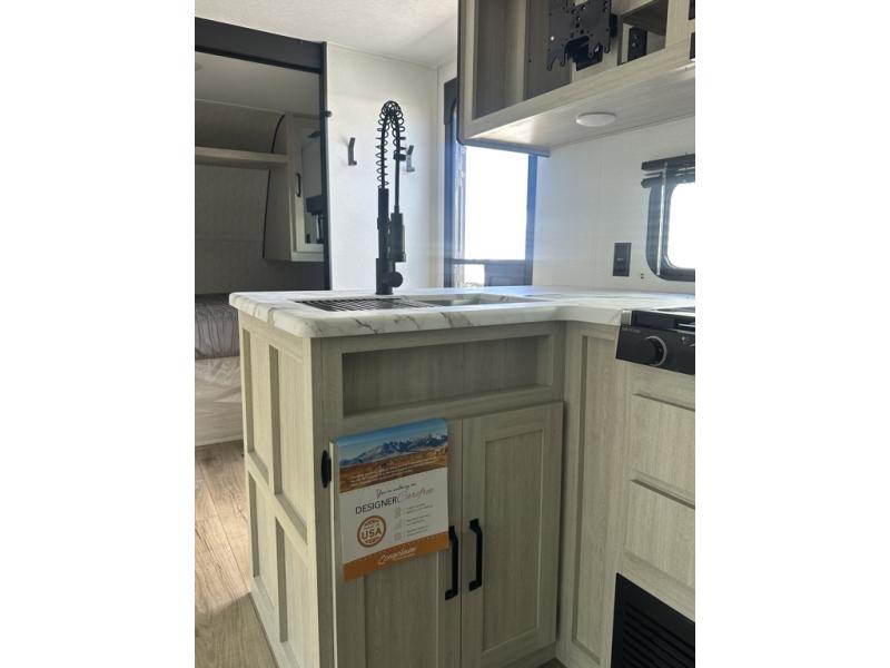 If you're looking for more space, this double axle unit features a large slide so you can walk about freely. Here, you'll find the booth dinette and sofa, which sit across from the optional TV if you want to enjoy movie nights. The full kitchen includes a microwave and three burner cooktop to make meals, plus a pantry and 12V refrigerator for food storage. There is even washer and dryer prep in the pantry if you choose to add these appliances. An optional outside mini kitchen can be added if you enjoy cooking outdoors! The kids or your guests will love the double-size bunks, and the full bath right beside the bunks includes a shower a seat for added comfort.