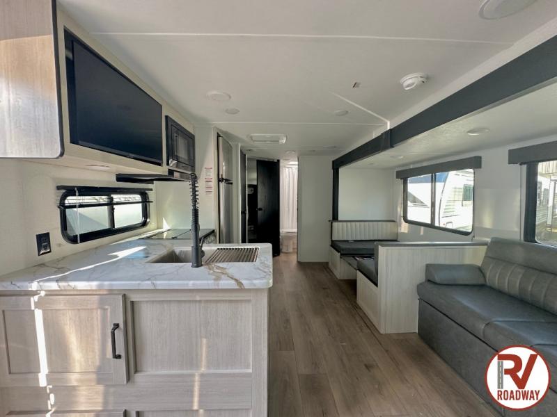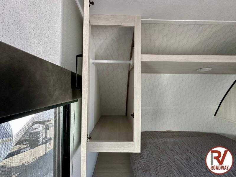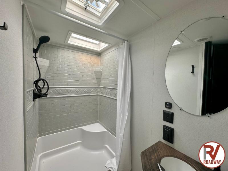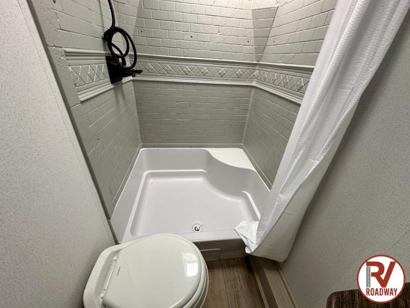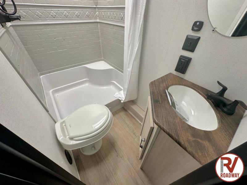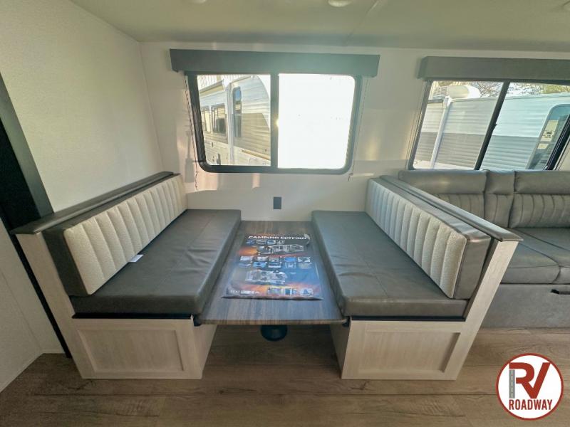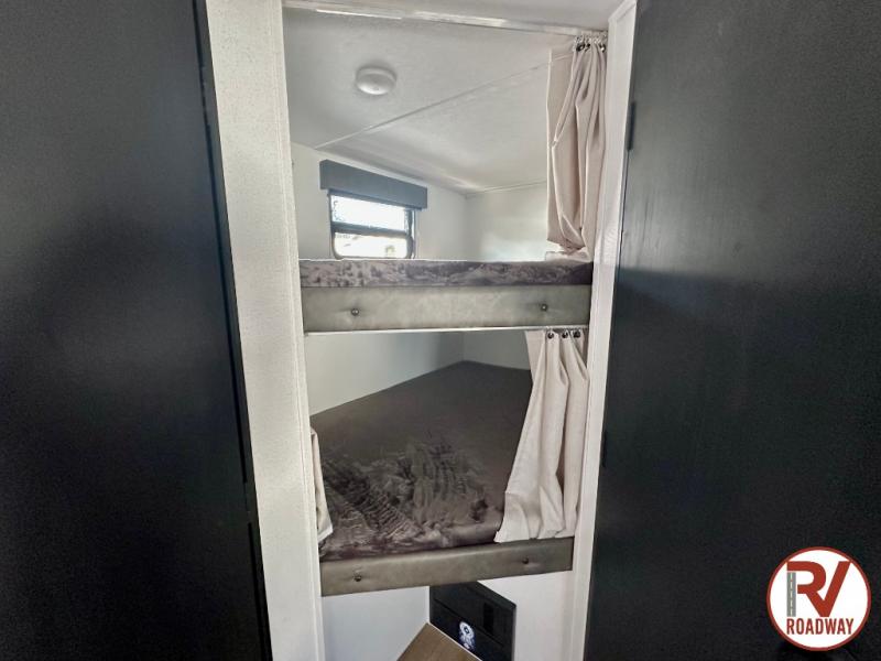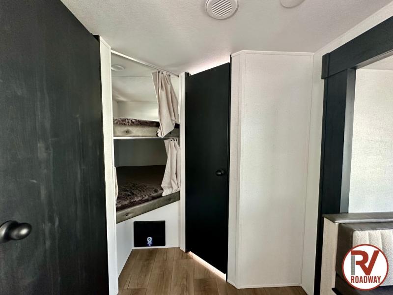 If you're looking for more space, this double axle unit features a large slide so you can walk about freely. Here, you'll find the booth dinette and sofa, which sit across from the optional TV if you want to enjoy movie nights. The full kitchen includes a microwave and three burner cooktop to make meals, plus a pantry and 12V refrigerator for food storage. There is even washer and dryer prep in the pantry if you choose to add these appliances. An optional outside mini kitchen can be added if you enjoy cooking outdoors! The kids or your guests will love the double-size bunks, and the full bath right beside the bunks includes a shower a seat for added comfort.