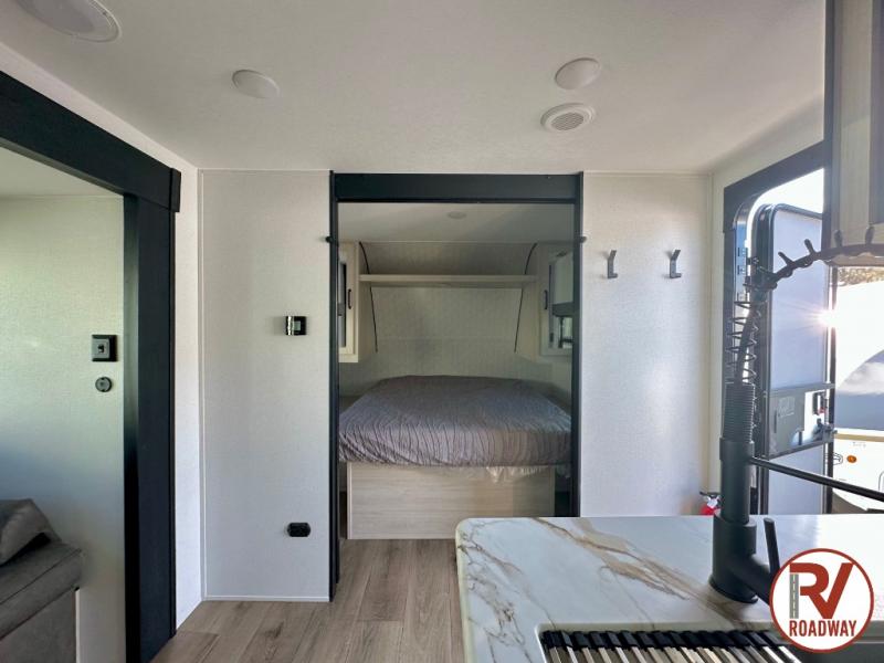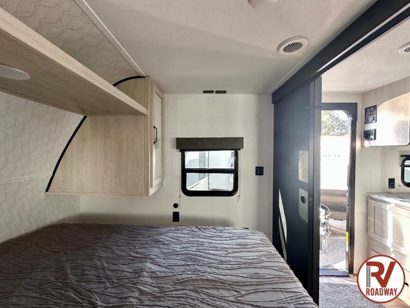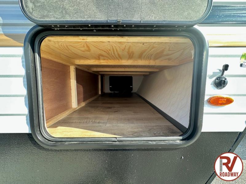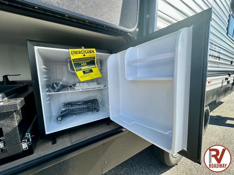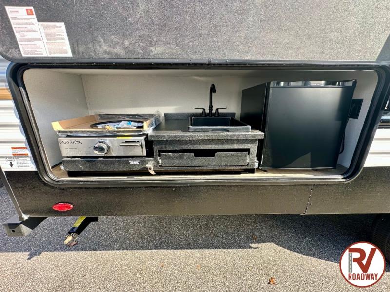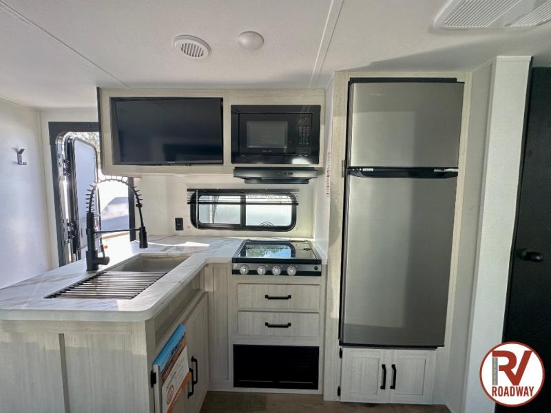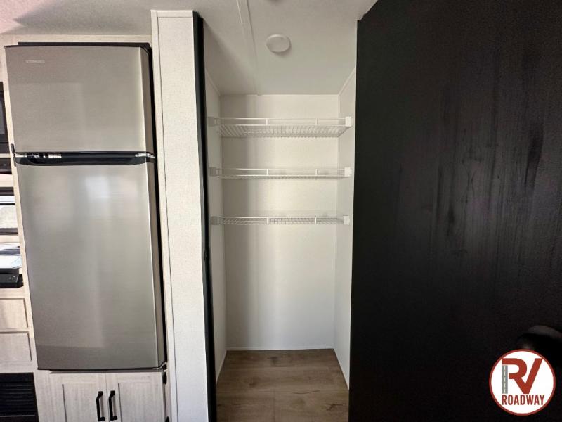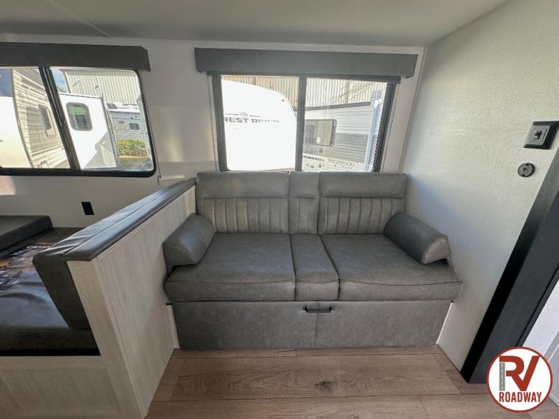 If you're looking for more space, this double axle unit features a large slide so you can walk about freely. Here, you'll find the booth dinette and sofa, which sit across from the optional TV if you want to enjoy movie nights. The full kitchen includes a microwave and three burner cooktop to make meals, plus a pantry and 12V refrigerator for food storage. There is even washer and dryer prep in the pantry if you choose to add these appliances. An optional outside mini kitchen can be added if you enjoy cooking outdoors! The kids or your guests will love the double-size bunks, and the full bath right beside the bunks includes a shower a seat for added comfort.
