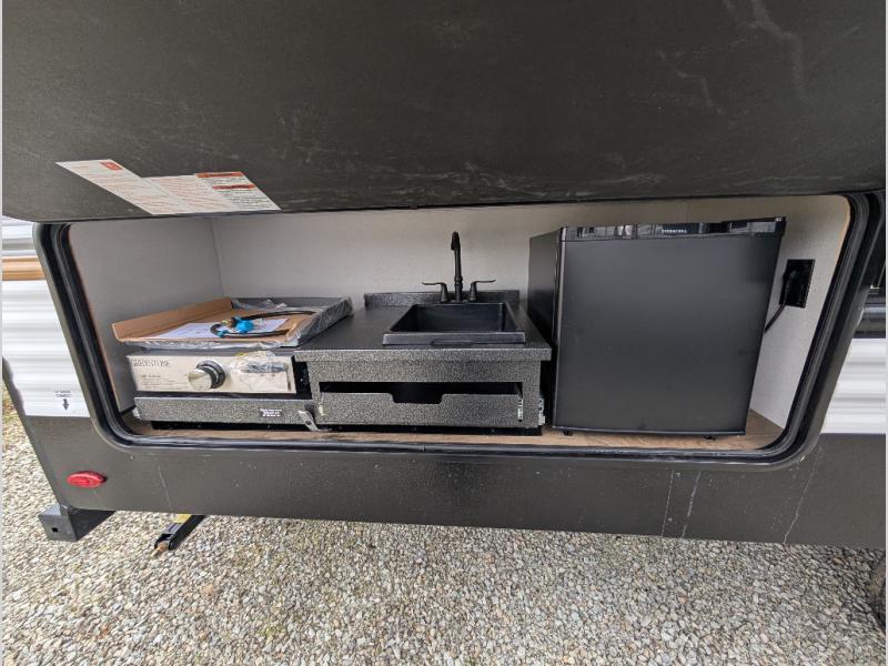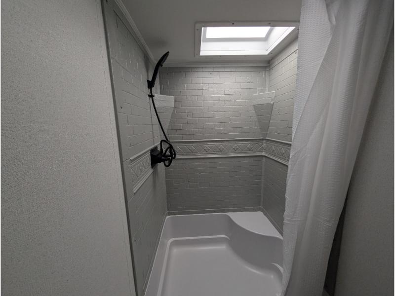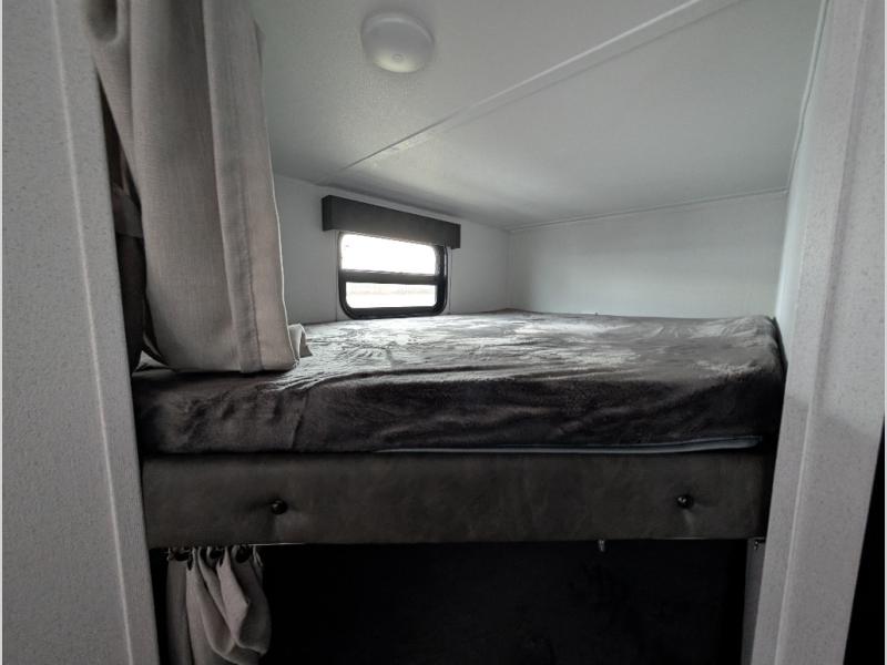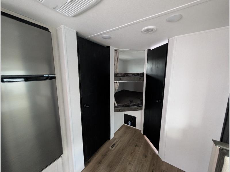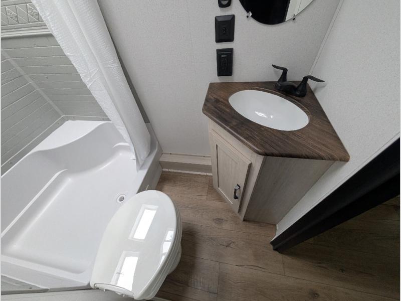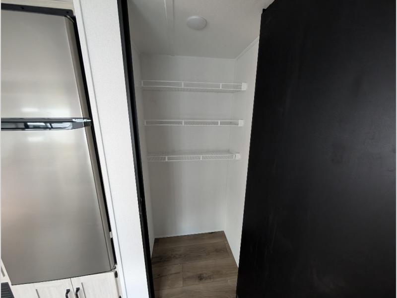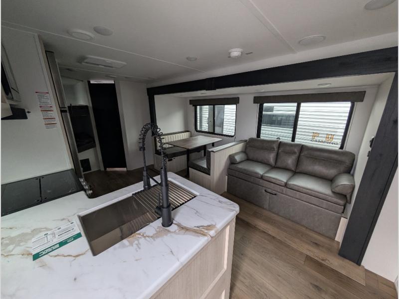 If you're looking for more space, this double axle unit features a large slide so you can walk about freely. Here, you'll find the booth dinette and sofa, which sit across from the optional TV if you want to enjoy movie nights. The full kitchen includes a microwave and three burner cooktop to make meals, plus a pantry and 12V refrigerator for food storage. There is even washer and dryer prep in the pantry if you choose to add these appliances. An optional outside mini kitchen can be added if you enjoy cooking outdoors! The kids or your guests will love the double-size bunks, and the full bath right beside the bunks includes a shower a seat for added comfort.