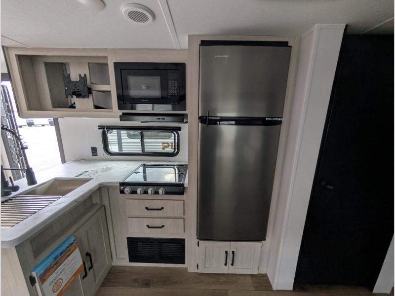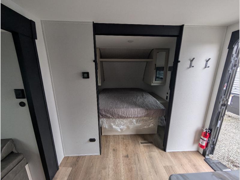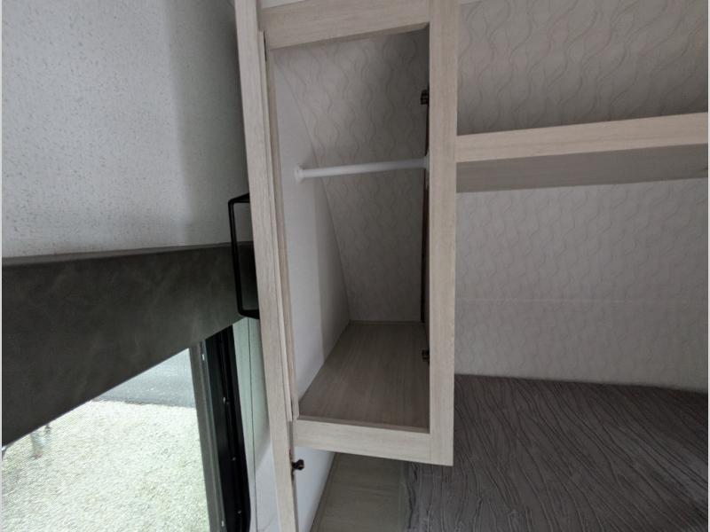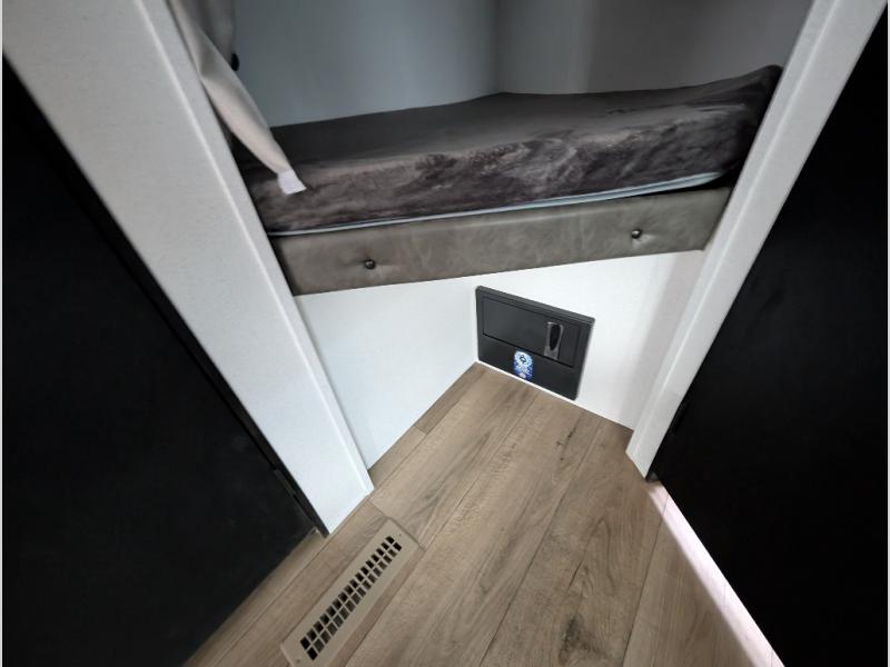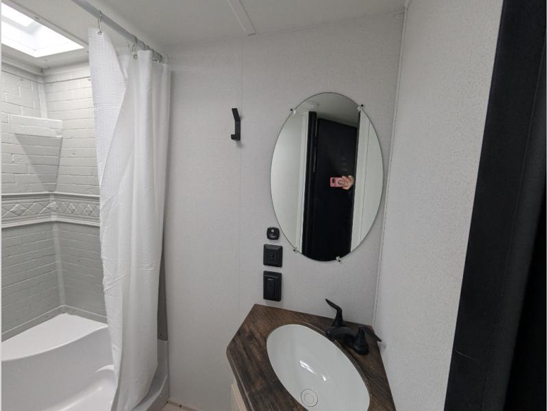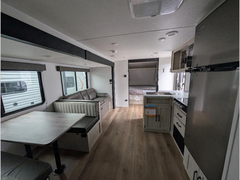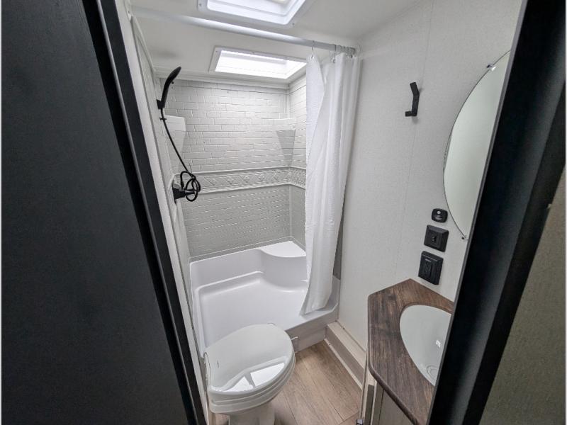 If you're looking for more space, this double axle unit features a large slide so you can walk about freely. Here, you'll find the booth dinette and sofa, which sit across from the optional TV if you want to enjoy movie nights. The full kitchen includes a microwave and three burner cooktop to make meals, plus a pantry and 12V refrigerator for food storage. There is even washer and dryer prep in the pantry if you choose to add these appliances. An optional outside mini kitchen can be added if you enjoy cooking outdoors! The kids or your guests will love the double-size bunks, and the full bath right beside the bunks includes a shower a seat for added comfort.