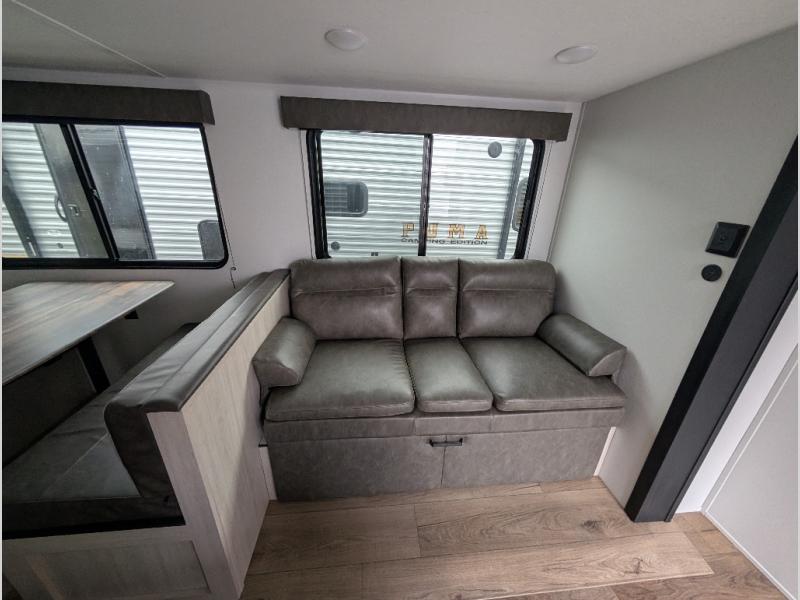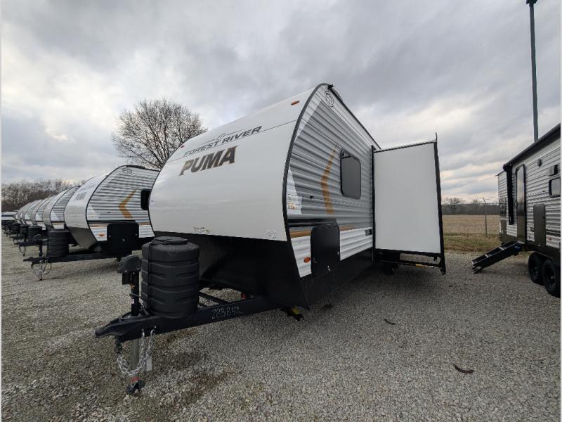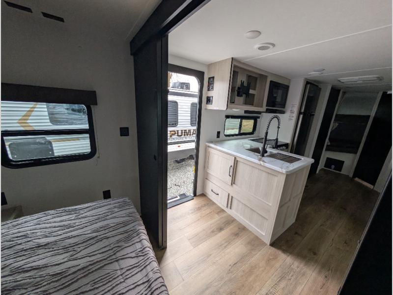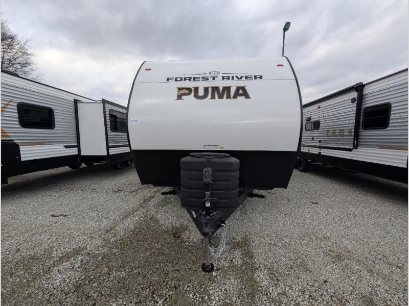 The Puma Camping Edition by Forest River offer an affordable travel trailer for rookie campers or seasoned RVers! They are built with 5/8" tongue and groove plywood flooring and a front diamond plate for added protection. There are also exterior magnetic baggage door latches, back up camera prep, a battery disconnect. Head inside to find Thermofoil countertops with a smooth drop edge, bedroom USB ports and outlets, and pleated shades in the living room.