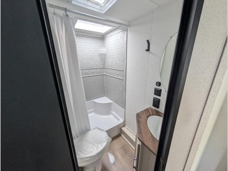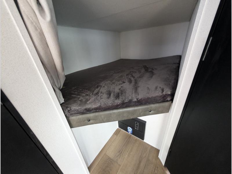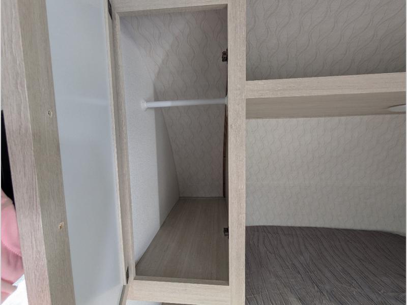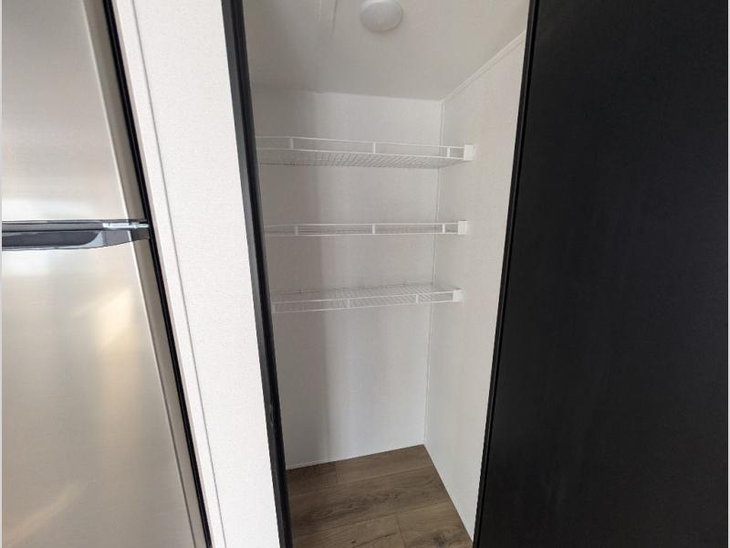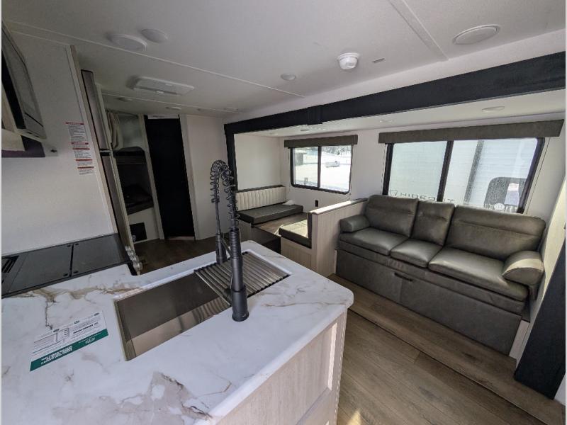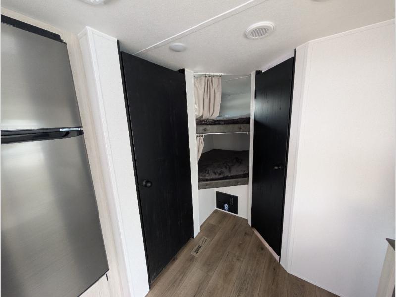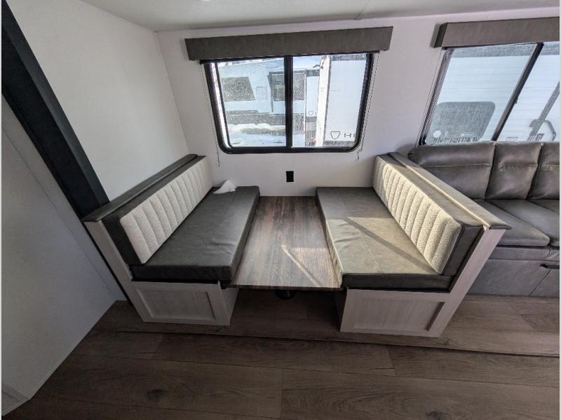 If you're looking for more space, this double axle unit features a large slide so you can walk about freely. Here, you'll find the booth dinette and sofa, which sit across from the optional TV if you want to enjoy movie nights. The full kitchen includes a microwave and three burner cooktop to make meals, plus a pantry and 12V refrigerator for food storage. There is even washer and dryer prep in the pantry if you choose to add these appliances. An optional outside mini kitchen can be added if you enjoy cooking outdoors! The kids or your guests will love the double-size bunks, and the full bath right beside the bunks includes a shower a seat for added comfort.