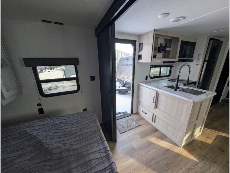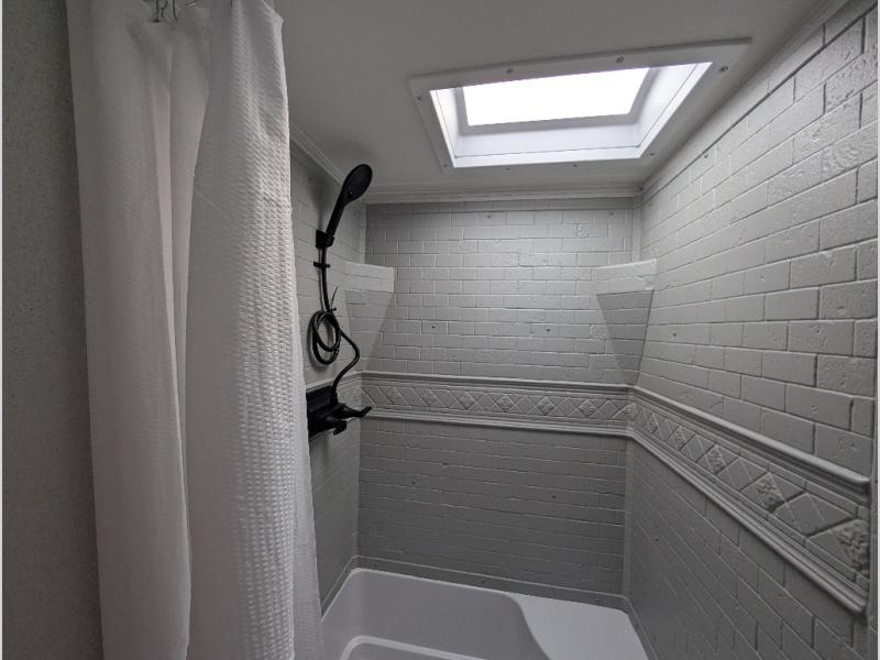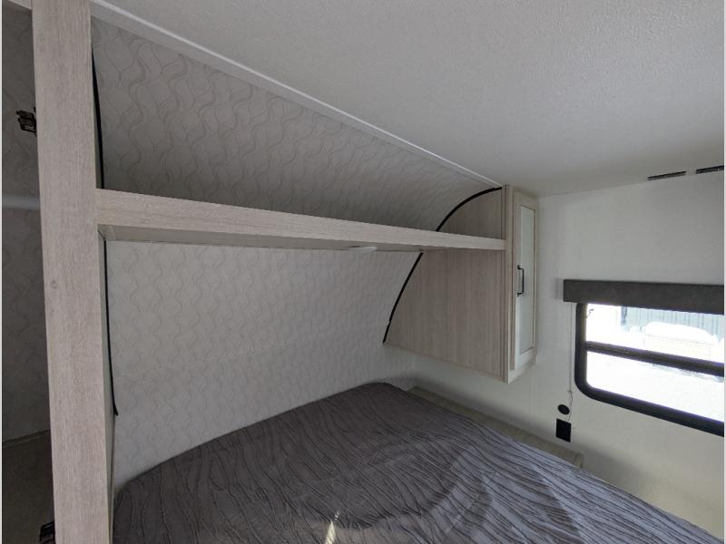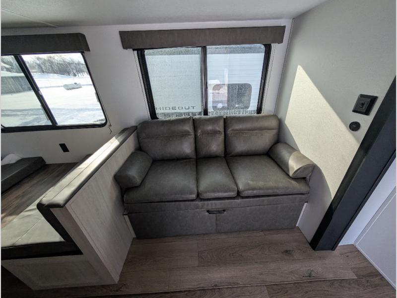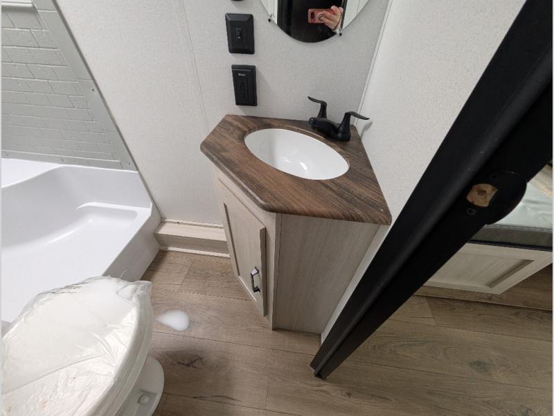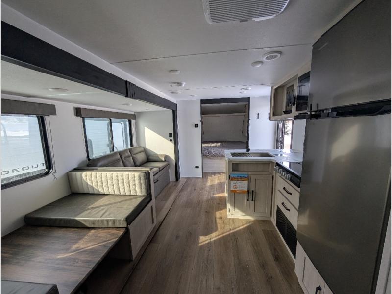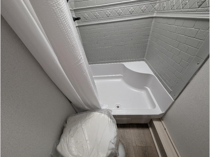 If you're looking for more space, this double axle unit features a large slide so you can walk about freely. Here, you'll find the booth dinette and sofa, which sit across from the optional TV if you want to enjoy movie nights. The full kitchen includes a microwave and three burner cooktop to make meals, plus a pantry and 12V refrigerator for food storage. There is even washer and dryer prep in the pantry if you choose to add these appliances. An optional outside mini kitchen can be added if you enjoy cooking outdoors! The kids or your guests will love the double-size bunks, and the full bath right beside the bunks includes a shower a seat for added comfort.
