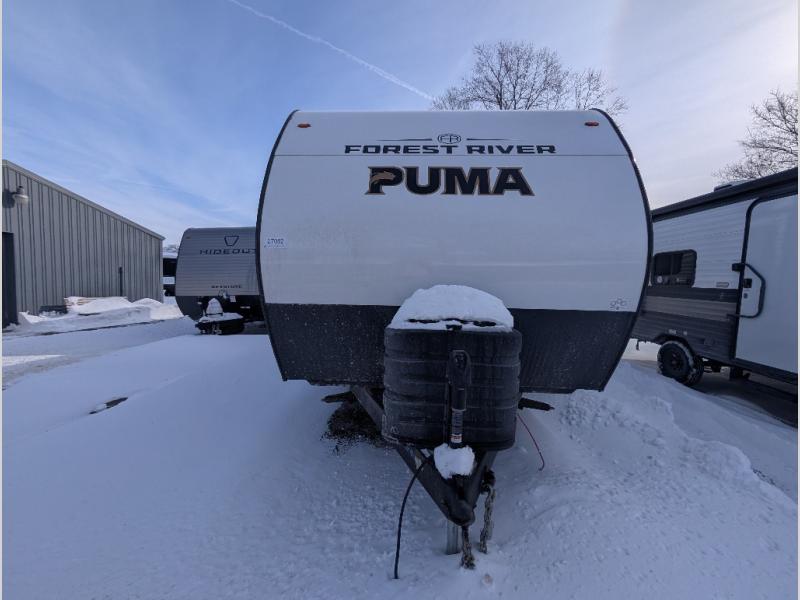 The Puma Camping Edition by Forest River offer an affordable travel trailer for rookie campers or seasoned RVers! They are built with 5/8" tongue and groove plywood flooring and a front diamond plate for added protection. There are also exterior magnetic baggage door latches, back up camera prep, a battery disconnect. Head inside to find Thermofoil countertops with a smooth drop edge, bedroom USB ports and outlets, and pleated shades in the living room.