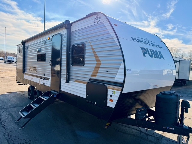 The Puma Camping Edition by Forest River is designed for both beginner campers and seasoned RVers, combining affordability with durability. The unit is built with 5/8" tongue-and-groove plywood flooring, a front diamond plate for extra protection, and exterior magnetic baggage door latches. Additional conveniences include backup camera prep, a battery disconnect, Thermofoil countertops with smooth drop edges, bedroom USB ports, and pleated shades in the living area. Together, these features make the 283BHCE a functional and comfortable choice for family camping adventures.