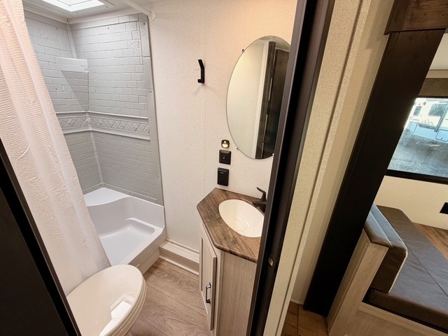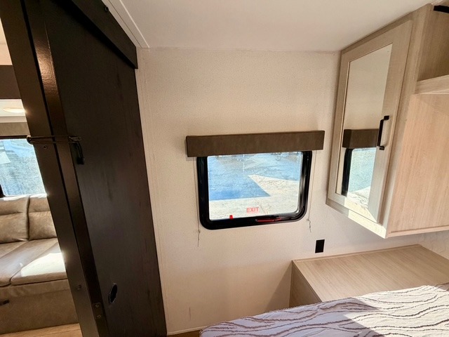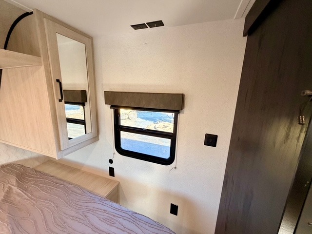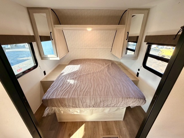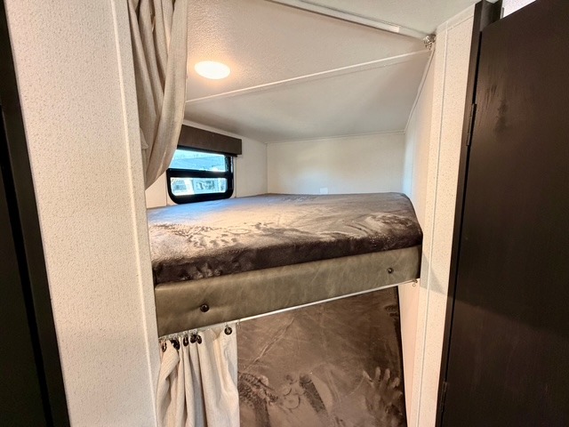 The rear double-size bunks provide a cozy spot for kids or guests, and the full bath nearby includes a shower with a built-in seat for added comfort and convenience. The front private bedroom features a queen bed, storage cabinets, and bedside amenities for a restful retreat after a day of outdoor adventures.