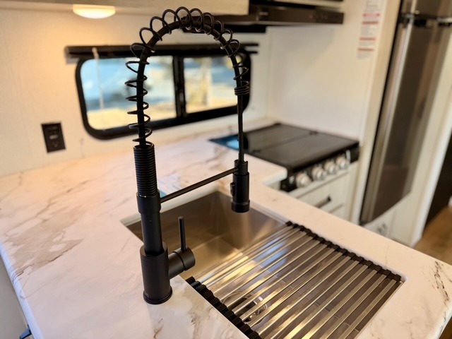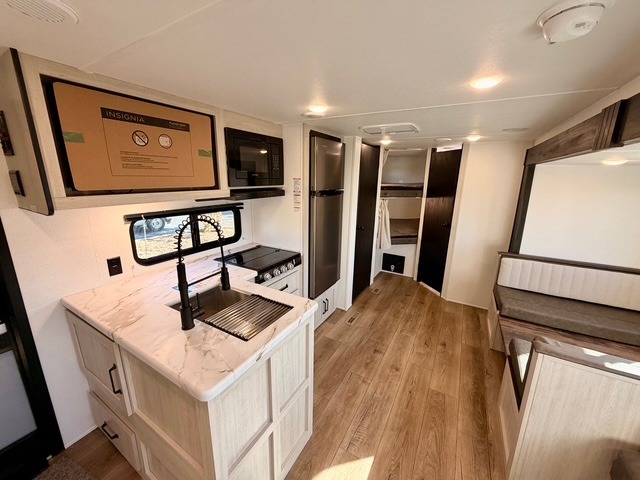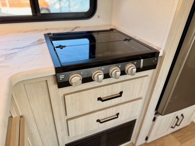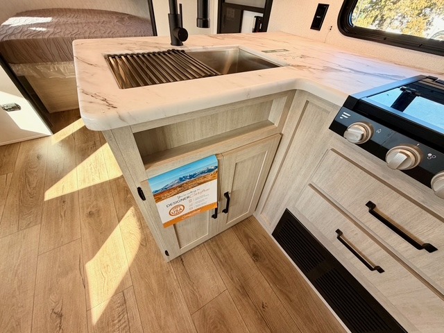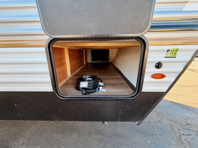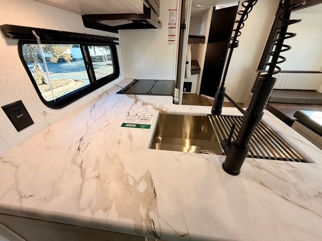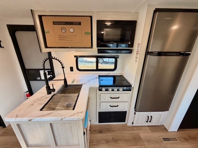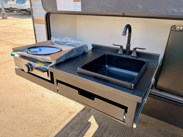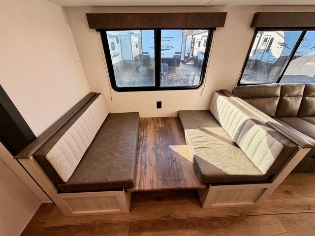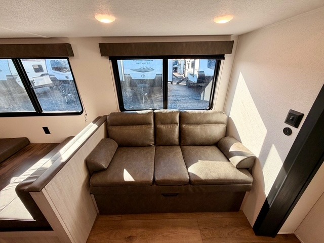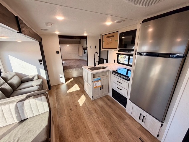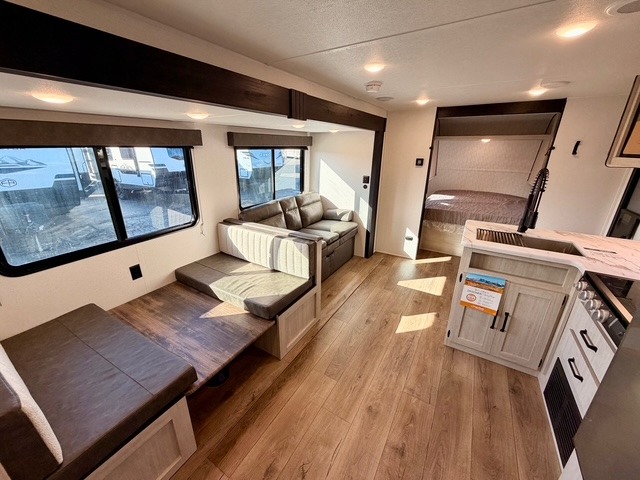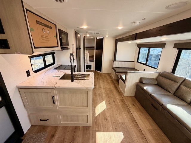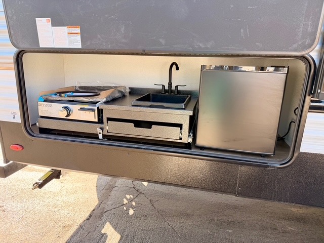 If you're looking for extra space and comfort, this double-axle travel trailer delivers with a large slide-out that opens up the living area for easy movement. The booth dinette and sofa provide ample seating for meals, games, or relaxing, and an optional TV can be added for movie nights. The full kitchen includes a microwave, three-burner cooktop, pantry, and 12V refrigerator, giving you everything you need to prepare and store meals. Washer and dryer prep is included in the pantry for added convenience, and an optional outside mini kitchen lets you cook al fresco while enjoying the fresh air.