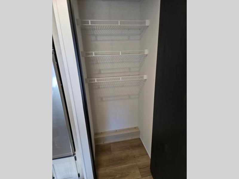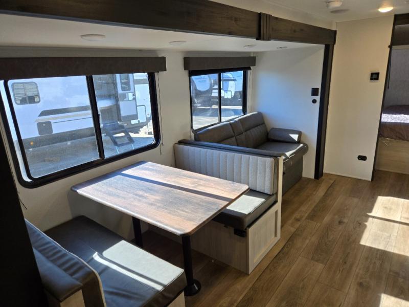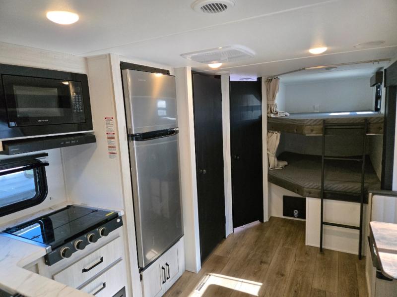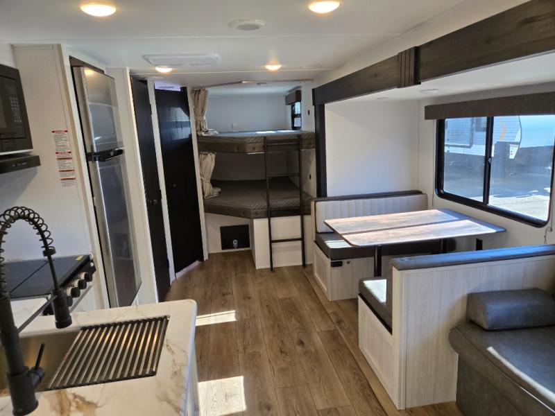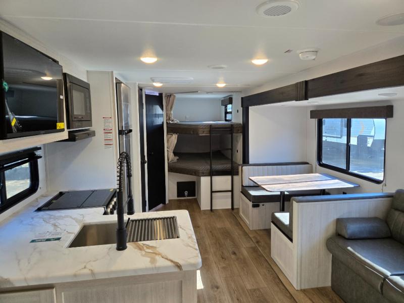 If you're looking for more space, this double axle unit features a large slide so you can walk about freely. Here, you'll find the booth dinette and sofa, which sit across from the optional TV if you want to enjoy movie nights. The full kitchen includes a microwave and three burner cooktop to make meals, plus a pantry and 12V refrigerator for food storage. There is even washer and dryer prep in the pantry if you choose to add these appliances. The kids or your guests will love the double-size bunks, and the full bath right beside the bunks includes one of the dual entry doors so you can easily get back out to the fun!