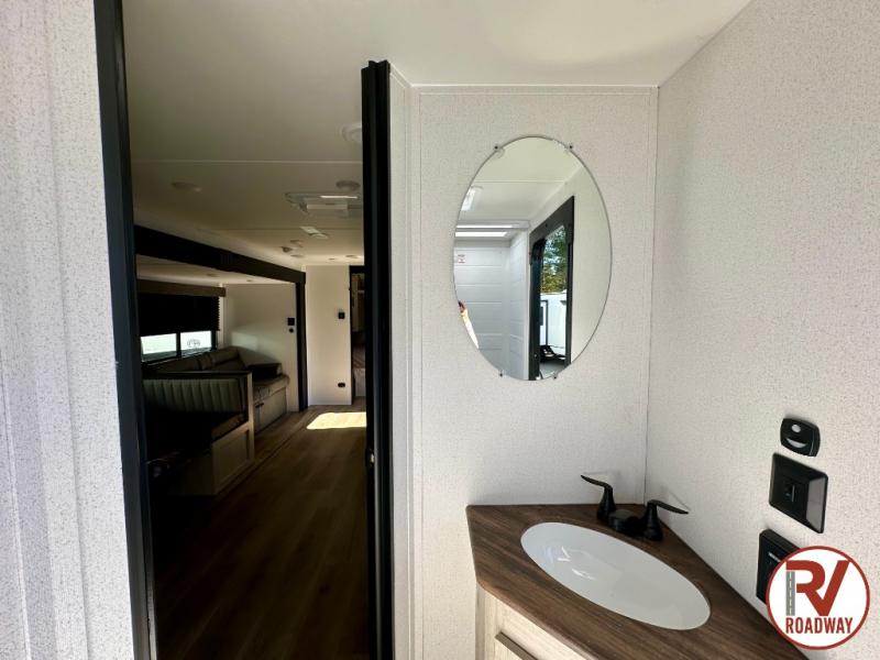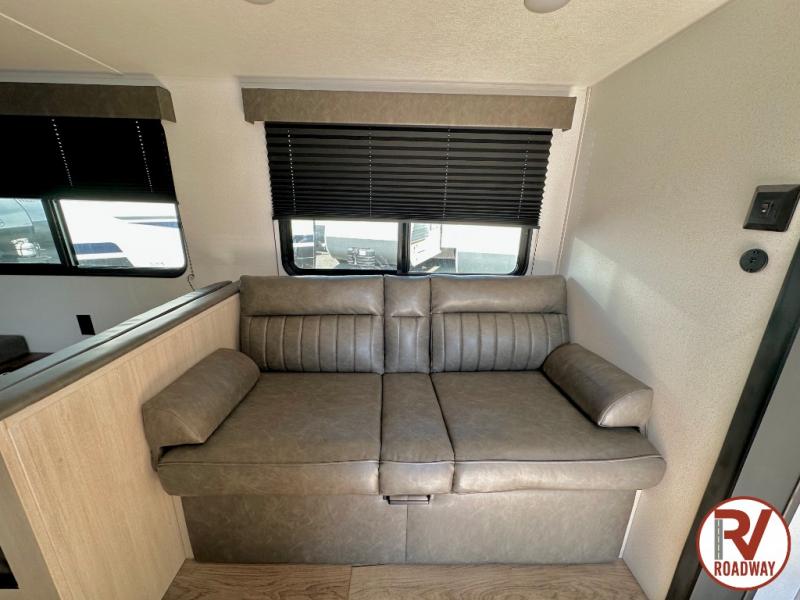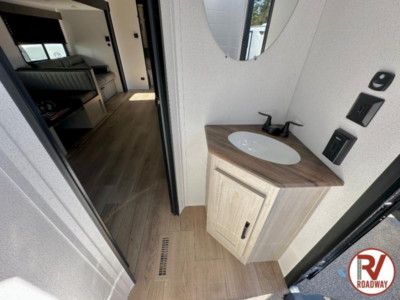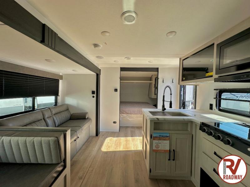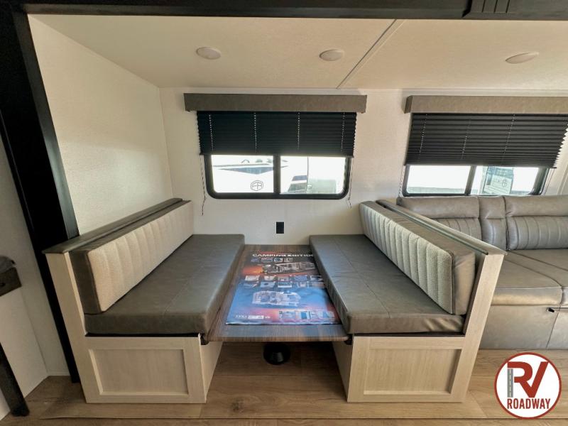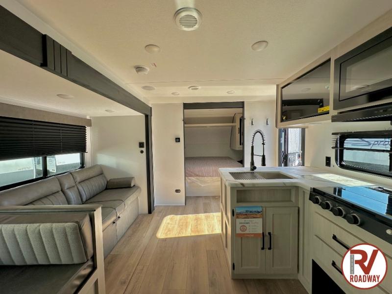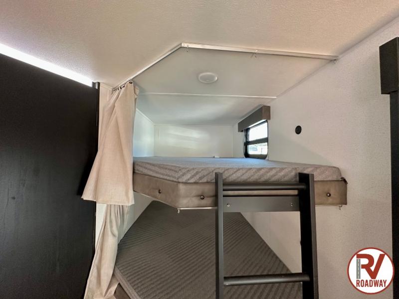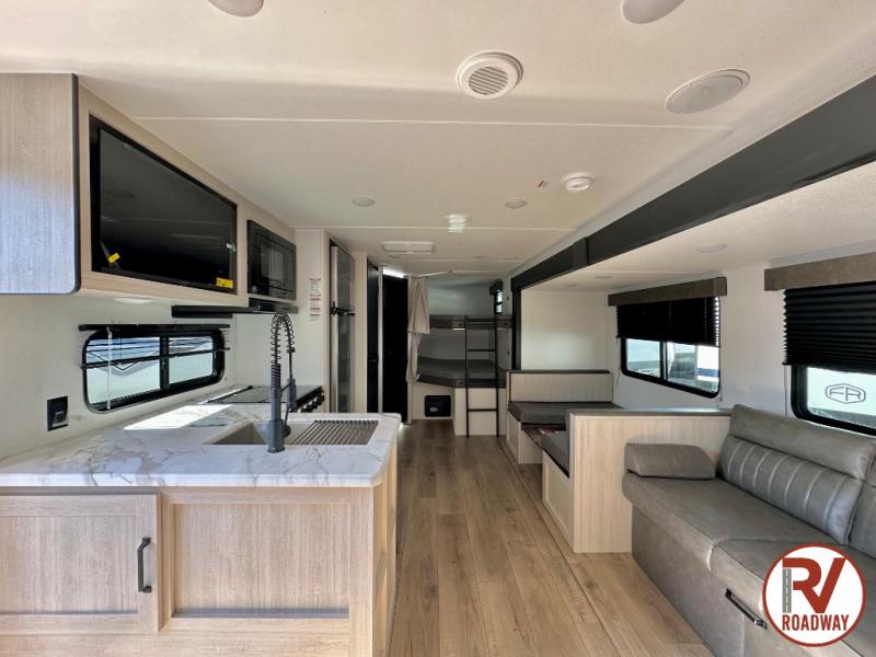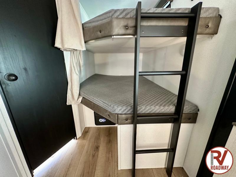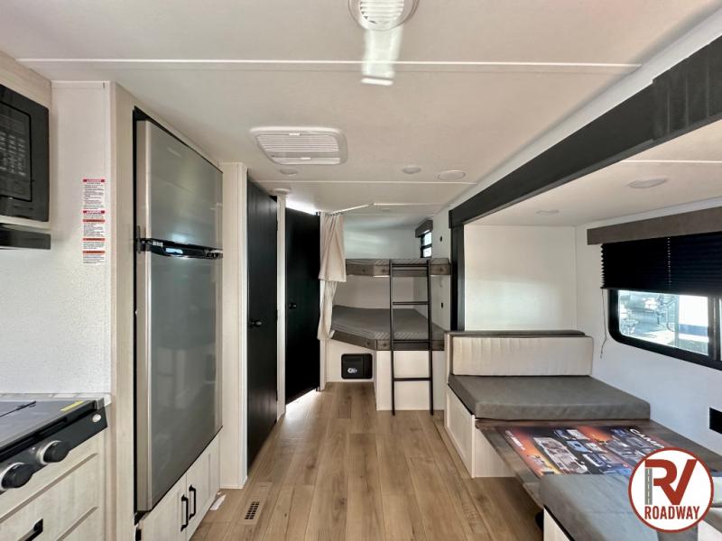 If you're looking for more space, this double axle unit features a large slide so you can walk about freely. Here, you'll find the booth dinette and sofa, which sit across from the optional TV if you want to enjoy movie nights. The full kitchen includes a microwave and three burner cooktop to make meals, plus a pantry and 12V refrigerator for food storage. There is even washer and dryer prep in the pantry if you choose to add these appliances. The kids or your guests will love the double-size bunks, and the full bath right beside the bunks includes one of the dual entry doors so you can easily get back out to the fun!