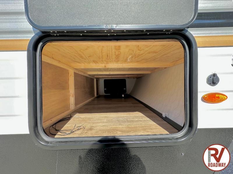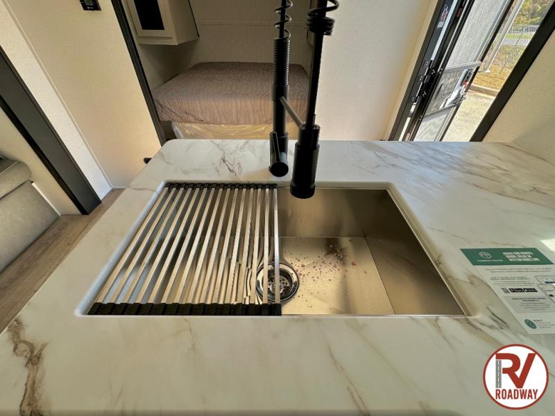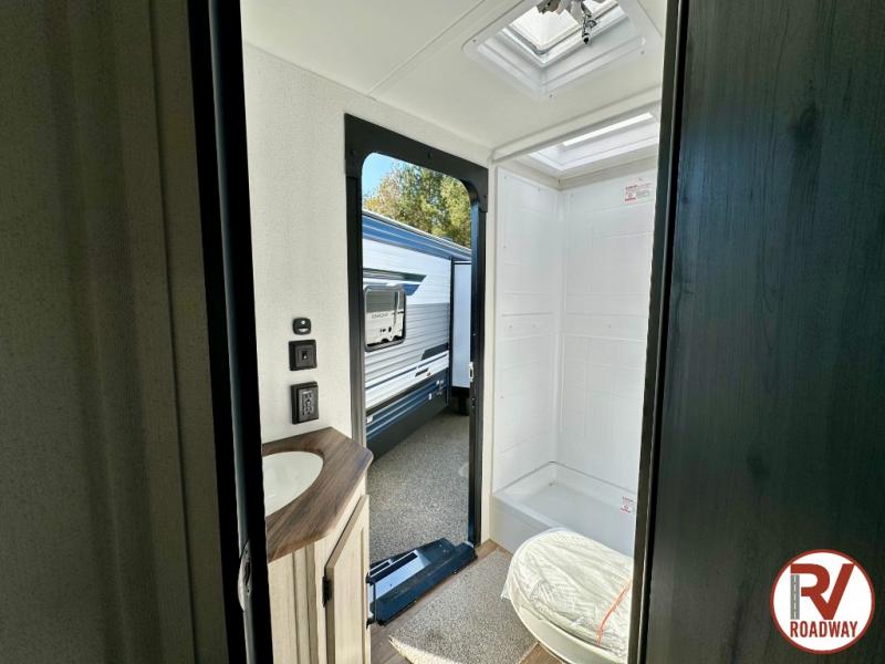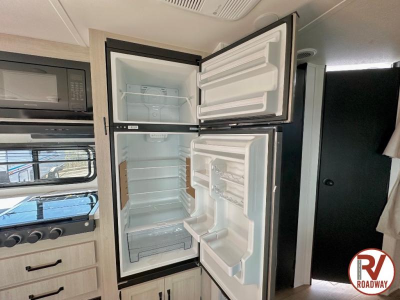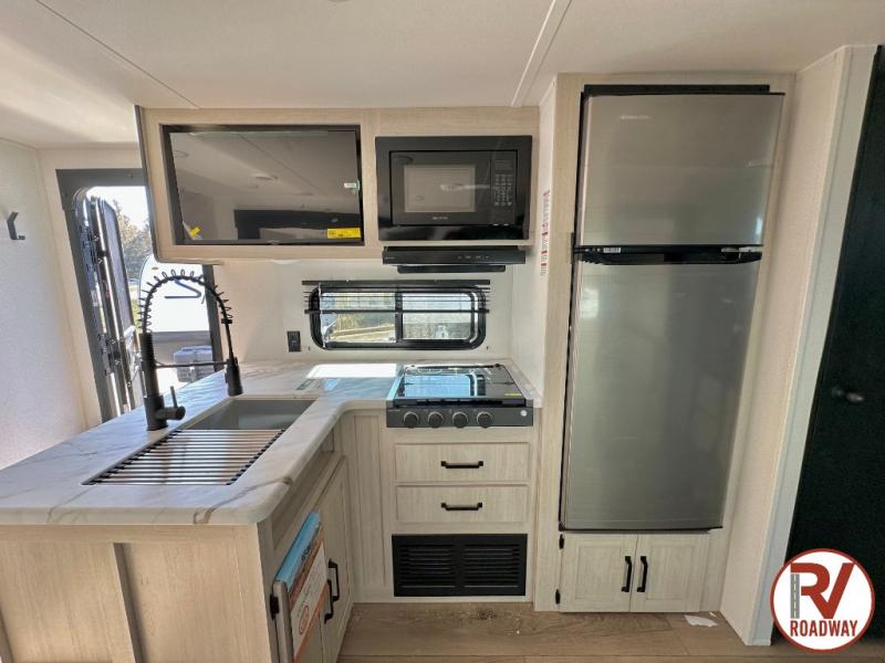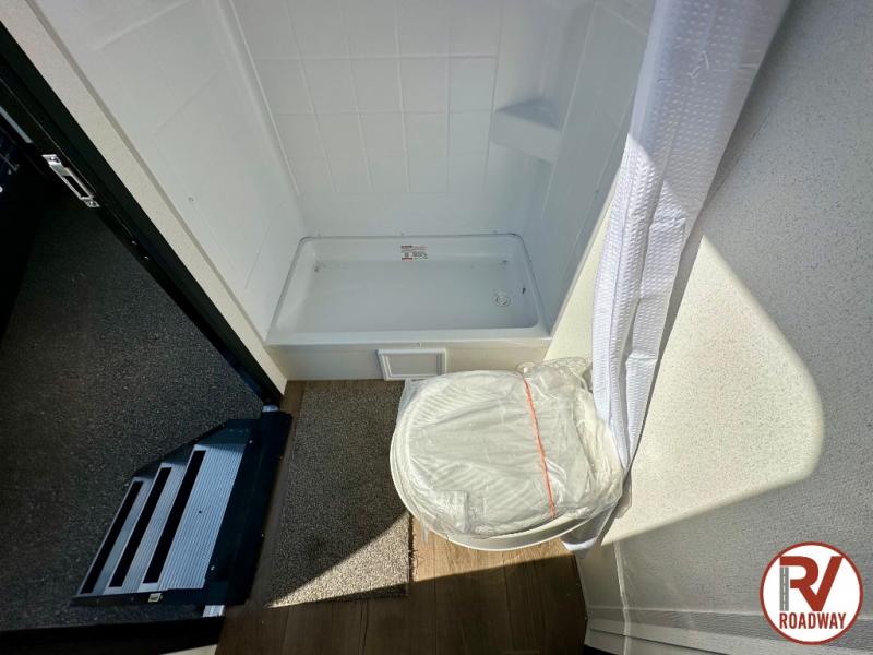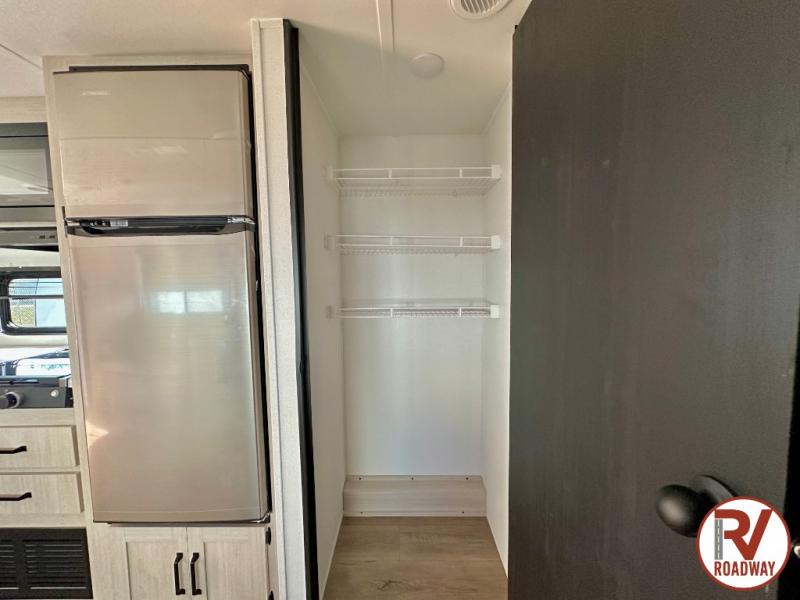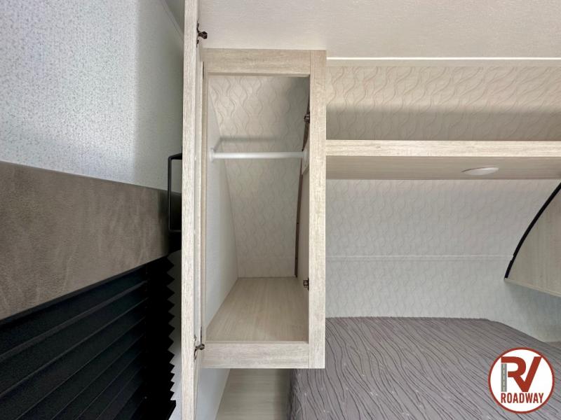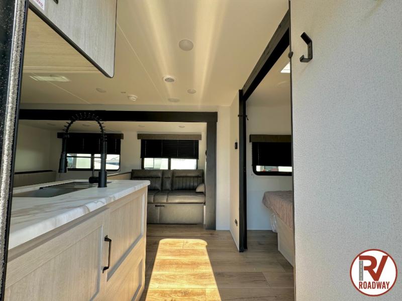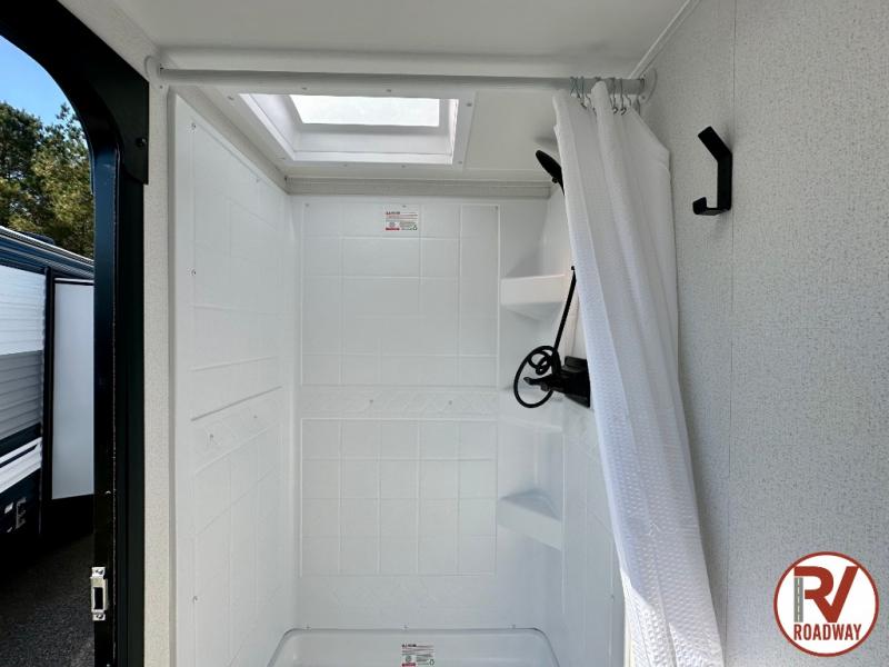 If you're looking for more space, this double axle unit features a large slide so you can walk about freely. Here, you'll find the booth dinette and sofa, which sit across from the optional TV if you want to enjoy movie nights. The full kitchen includes a microwave and three burner cooktop to make meals, plus a pantry and 12V refrigerator for food storage. There is even washer and dryer prep in the pantry if you choose to add these appliances. The kids or your guests will love the double-size bunks, and the full bath right beside the bunks includes one of the dual entry doors so you can easily get back out to the fun!
