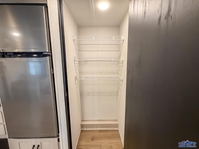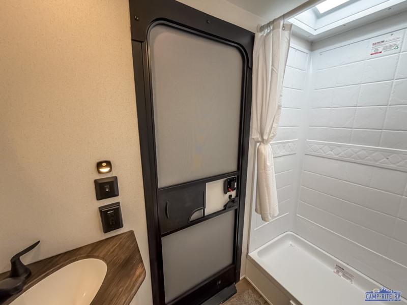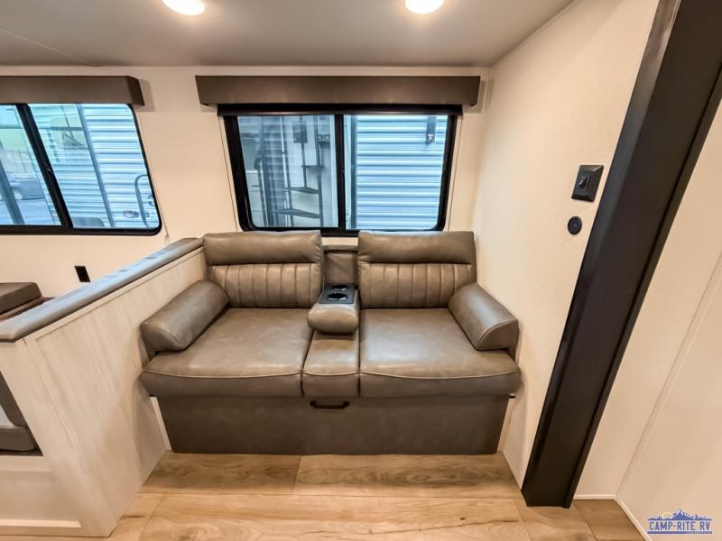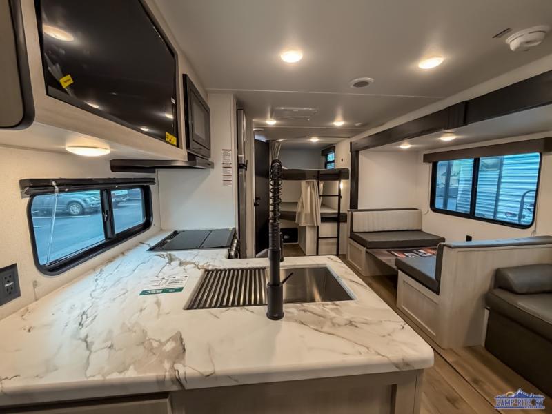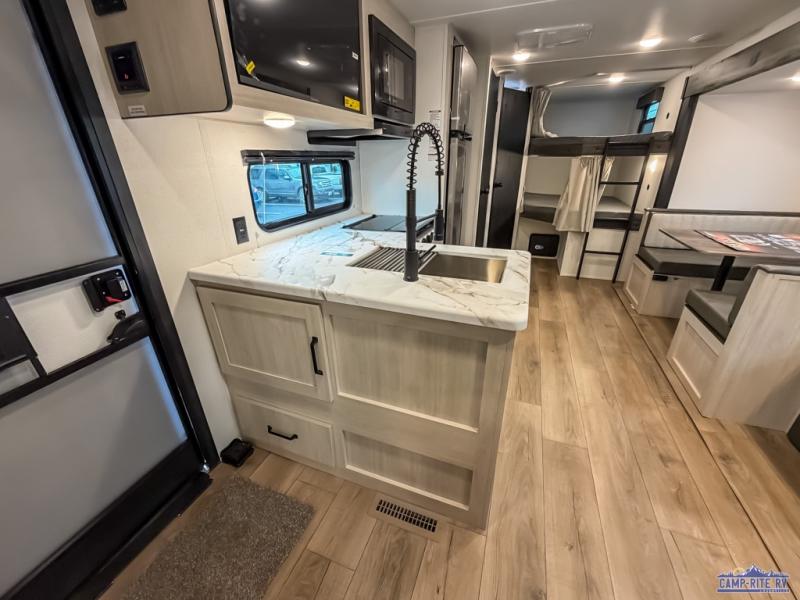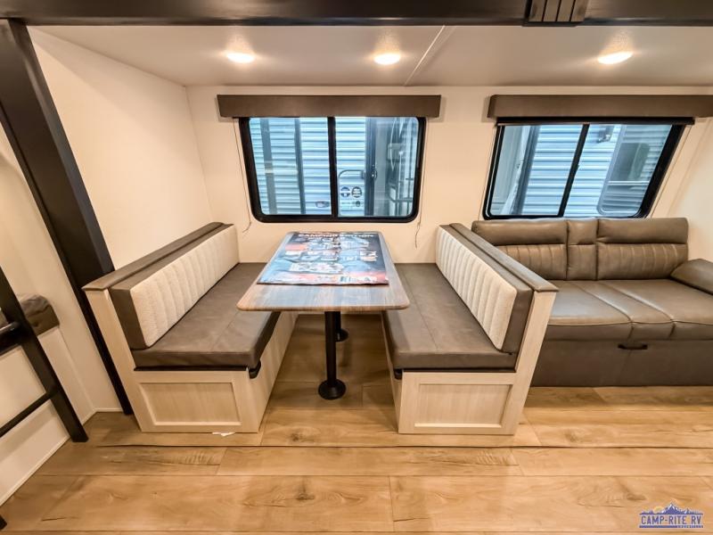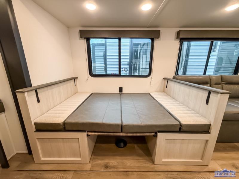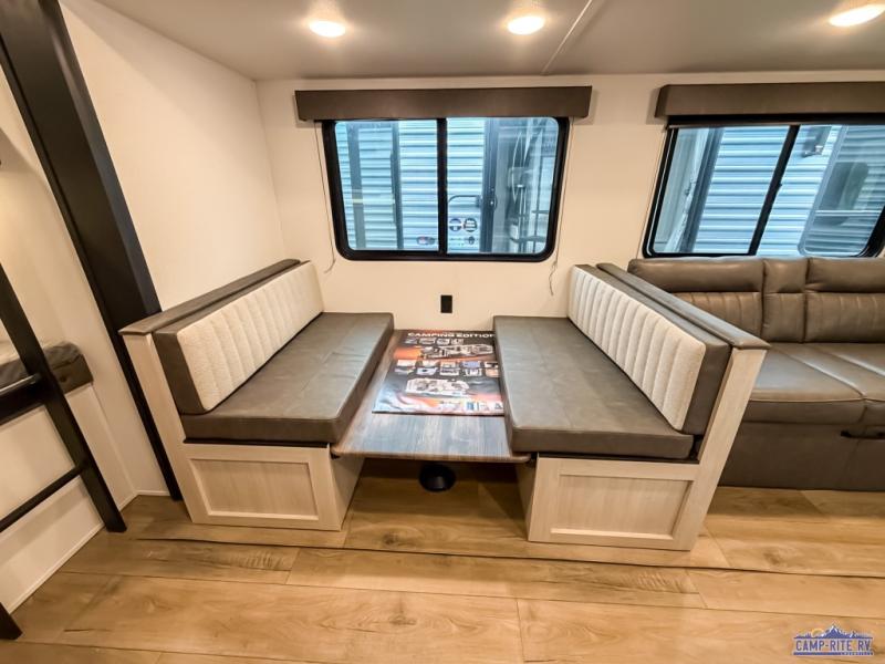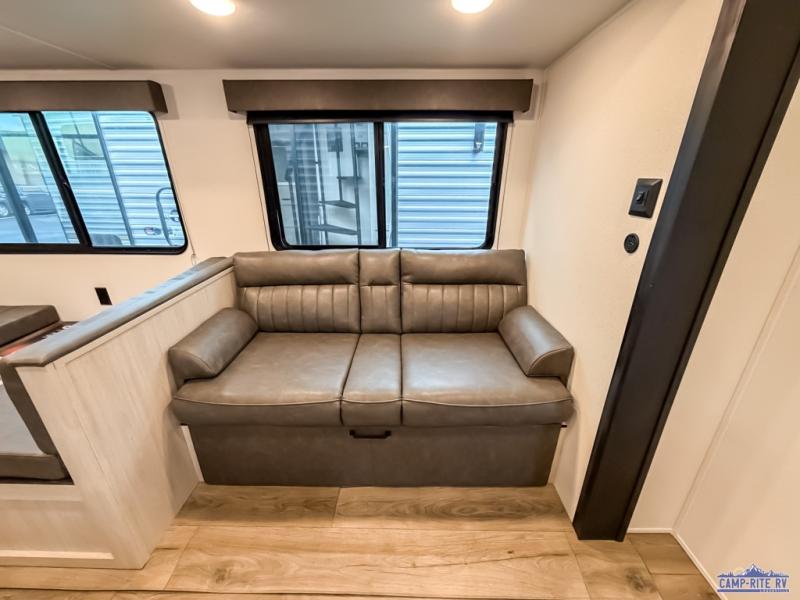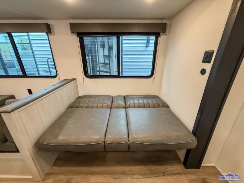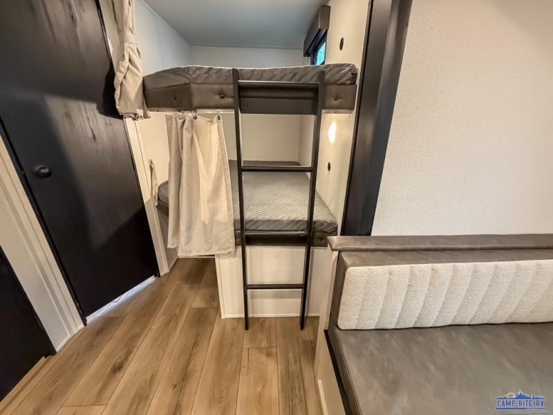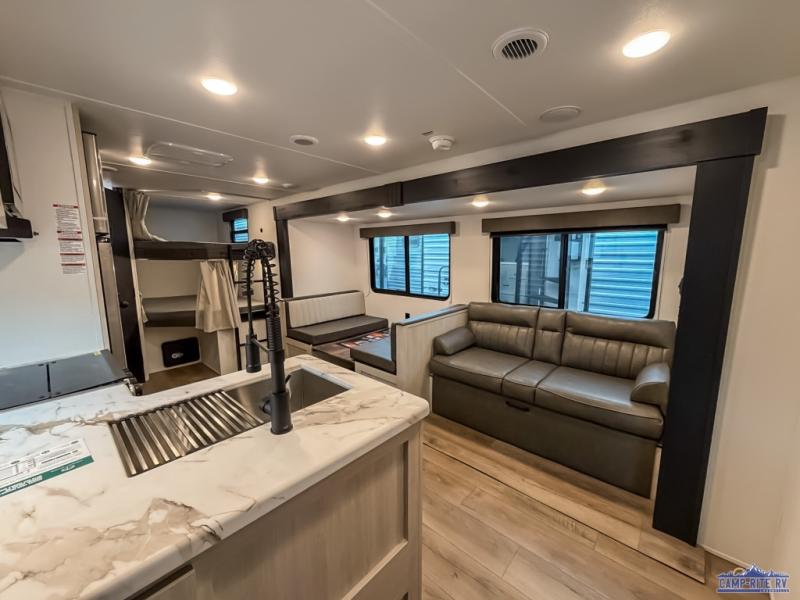 If you're looking for more space, this double axle unit features a large slide so you can walk about freely. Here, you'll find the booth dinette and sofa, which sit across from the optional TV if you want to enjoy movie nights. The full kitchen includes a microwave and three burner cooktop to make meals, plus a pantry and 12V refrigerator for food storage. There is even washer and dryer prep in the pantry if you choose to add these appliances. The kids or your guests will love the double-size bunks, and the full bath right beside the bunks includes one of the dual entry doors so you can easily get back out to the fun!