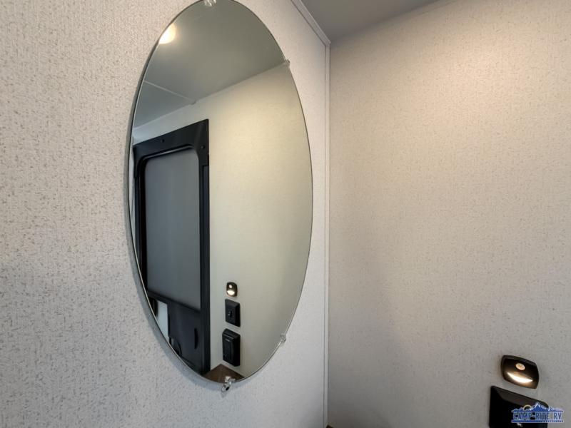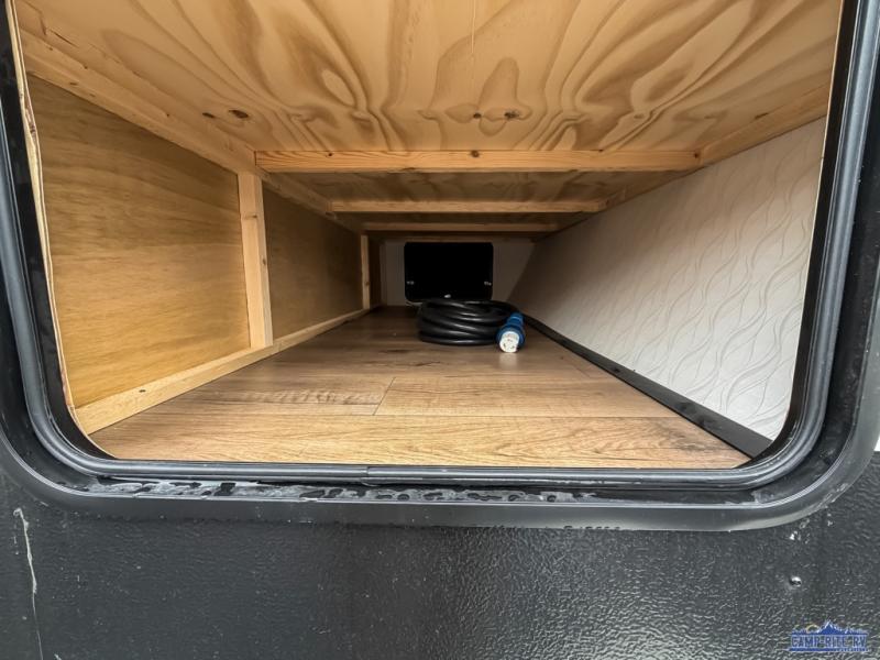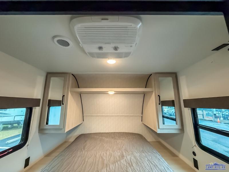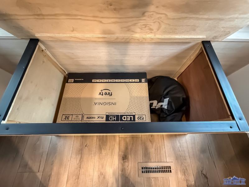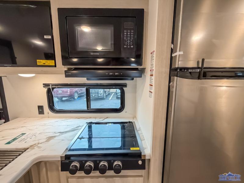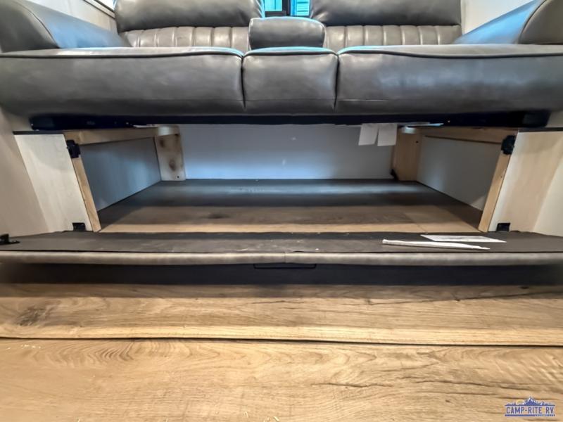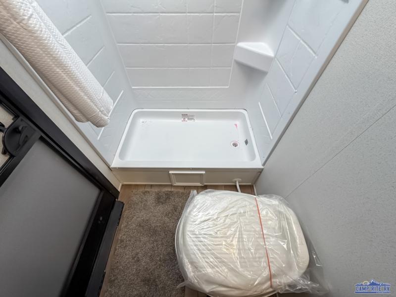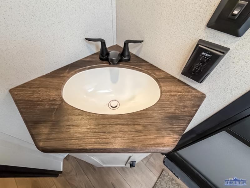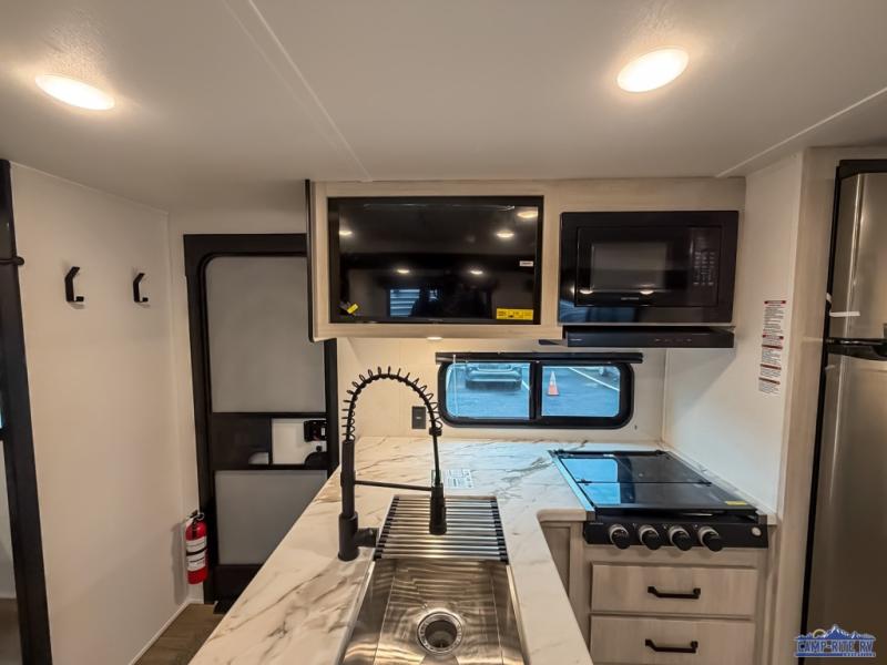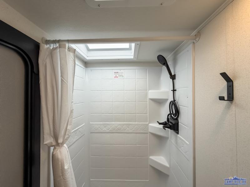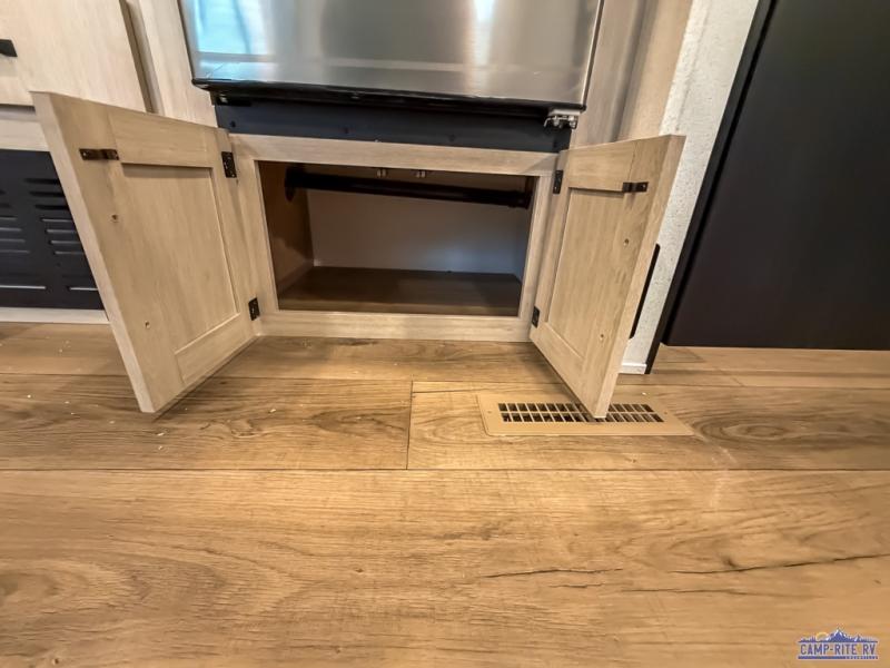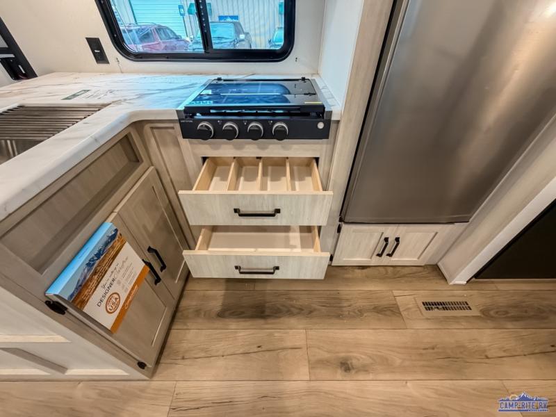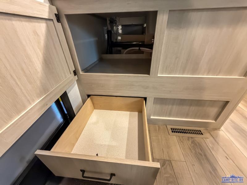 If you're looking for more space, this double axle unit features a large slide so you can walk about freely. Here, you'll find the booth dinette and sofa, which sit across from the optional TV if you want to enjoy movie nights. The full kitchen includes a microwave and three burner cooktop to make meals, plus a pantry and 12V refrigerator for food storage. There is even washer and dryer prep in the pantry if you choose to add these appliances. The kids or your guests will love the double-size bunks, and the full bath right beside the bunks includes one of the dual entry doors so you can easily get back out to the fun!